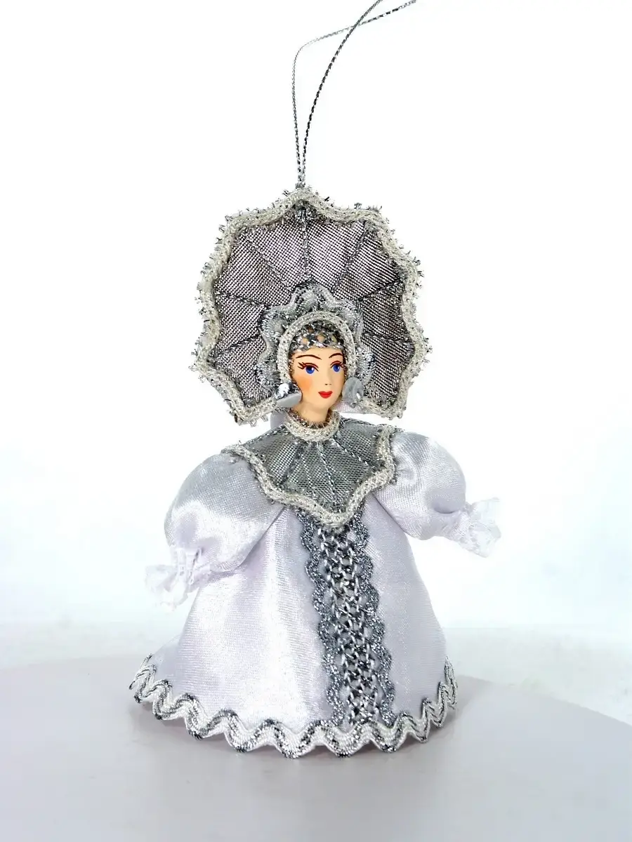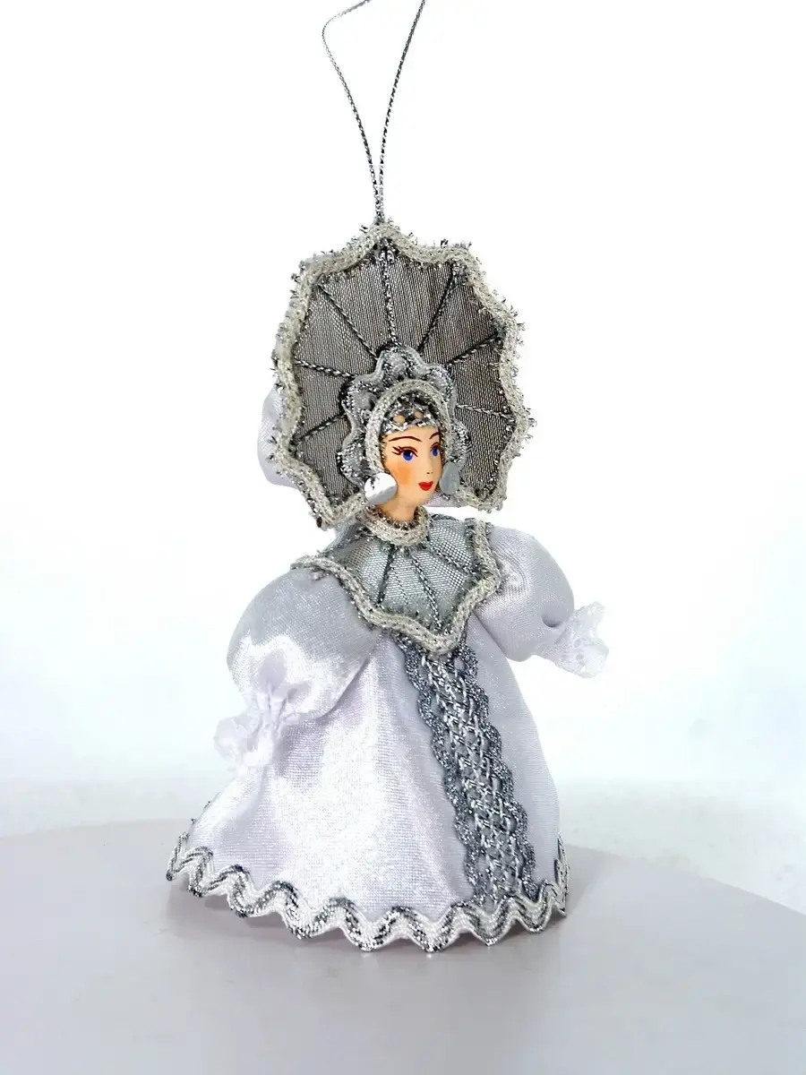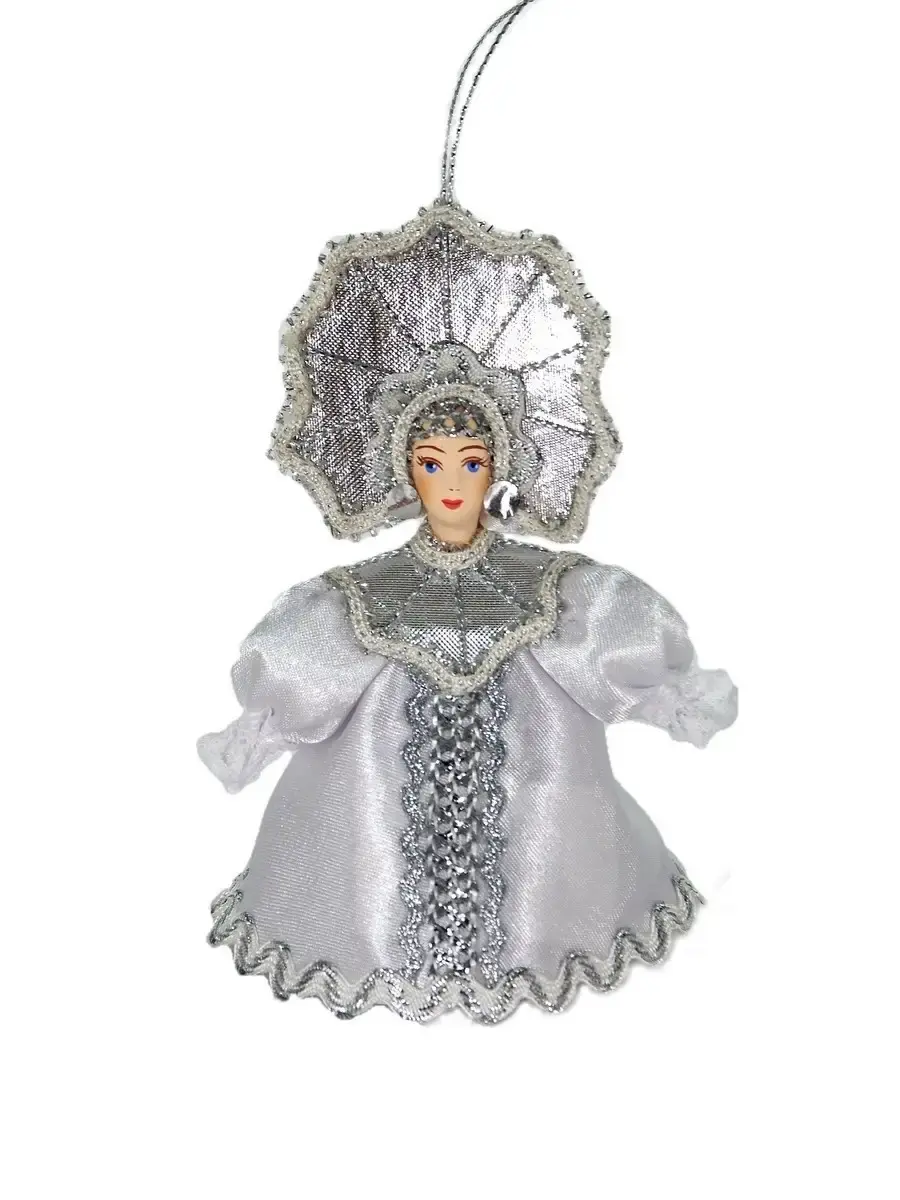 Украсит ёлку и новогодний интерьер. Сказочный персонаж в бело-серебристом наряде. По мотивам русского народного костюма. Кукла создана профессиональным художником-кукольником из качественного, безопасного материала.Голова выполнена из фарфора в собственной керамической мастерской, расписана акриловыми/темперными красками. Высота 12 см