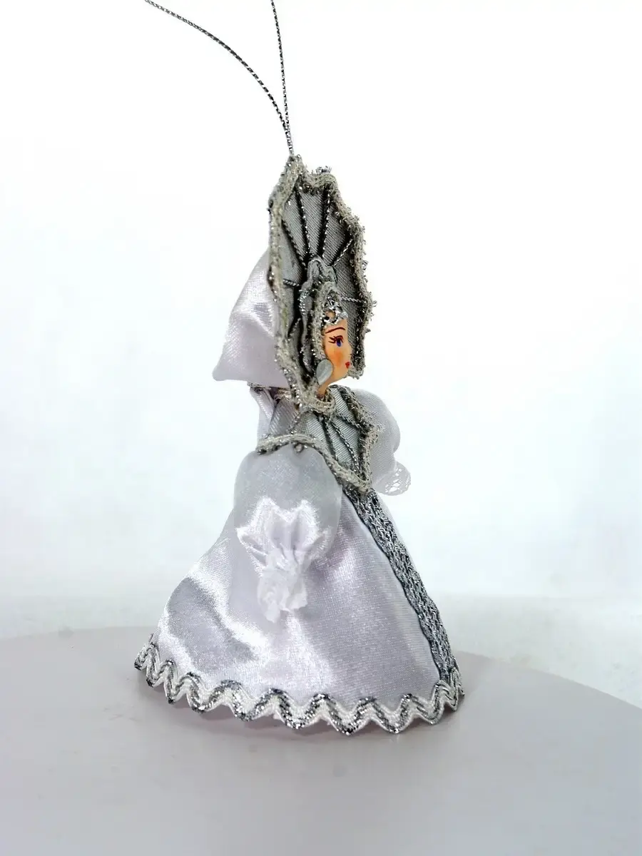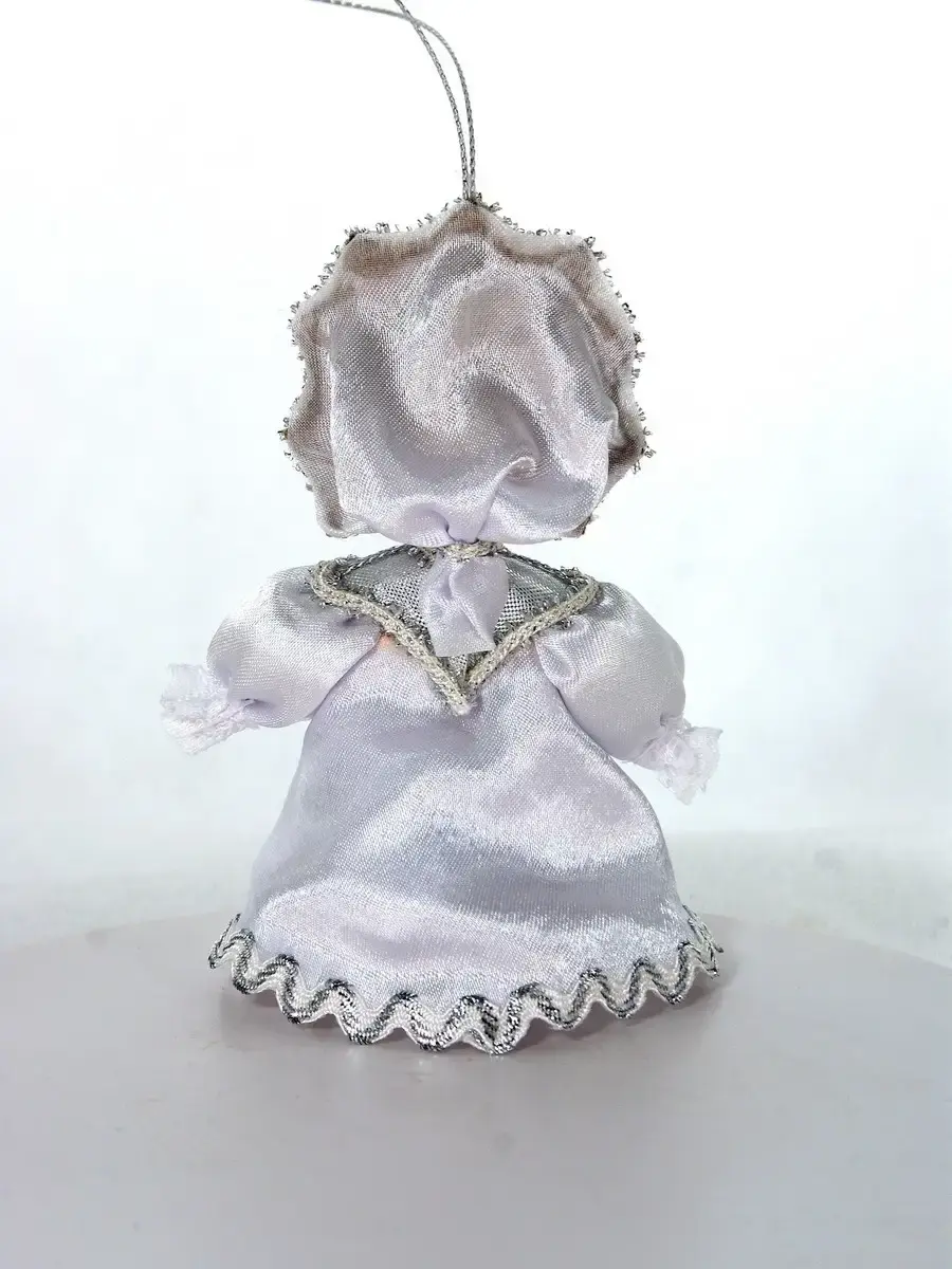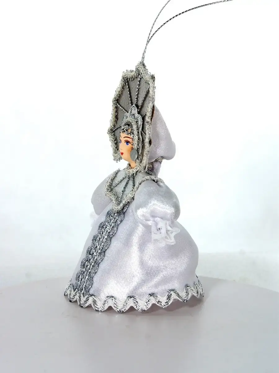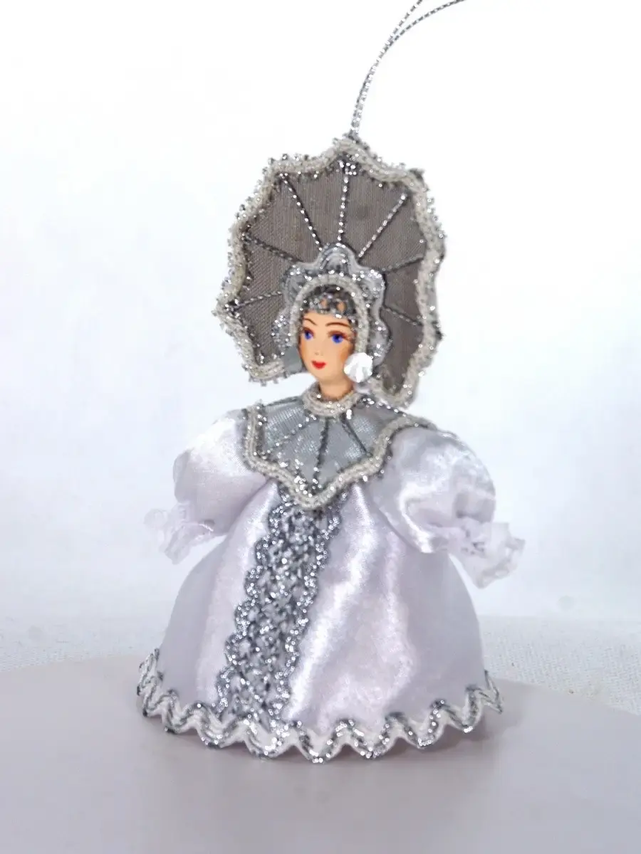 Украсит ёлку и новогодний интерьер. Сказочный персонаж в бело-серебристом наряде. По мотивам русского народного костюма. Кукла создана профессиональным художником-кукольником из качественного, безопасного материала.Голова выполнена из фарфора в собственной керамической мастерской, расписана акриловыми/темперными красками. Высота 12 см