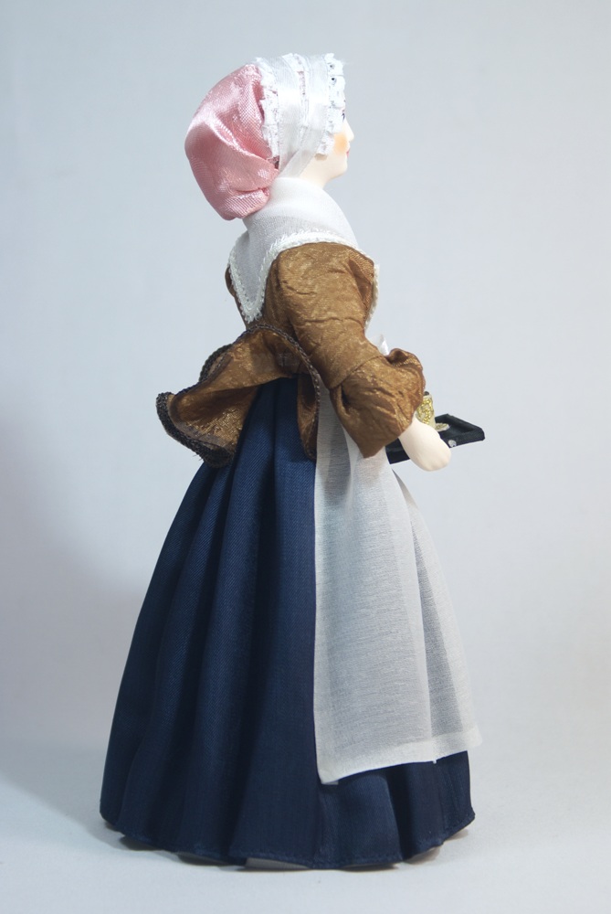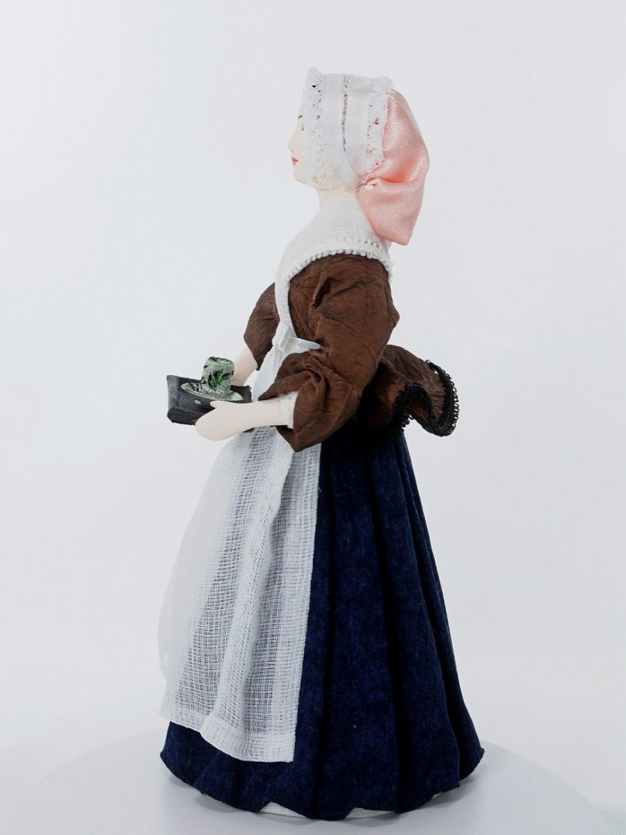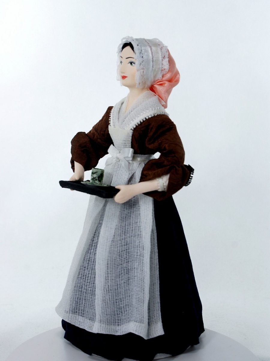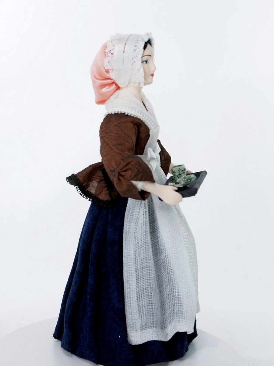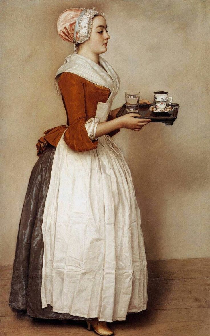 Сер 18 века. Франция.\n\nИз коллекции Светский исторический костюм. Ручная работа. Фарфор, текстиль. Высота 26 см. Для подарка, для интерьера, в коллекцию.\n\nПо картине швейцарского художника Ж. Э. Лиотара "Шоколадница", изображающей служанку, несущую горячий шоколад. Хранится в Дрезденской галерее.
