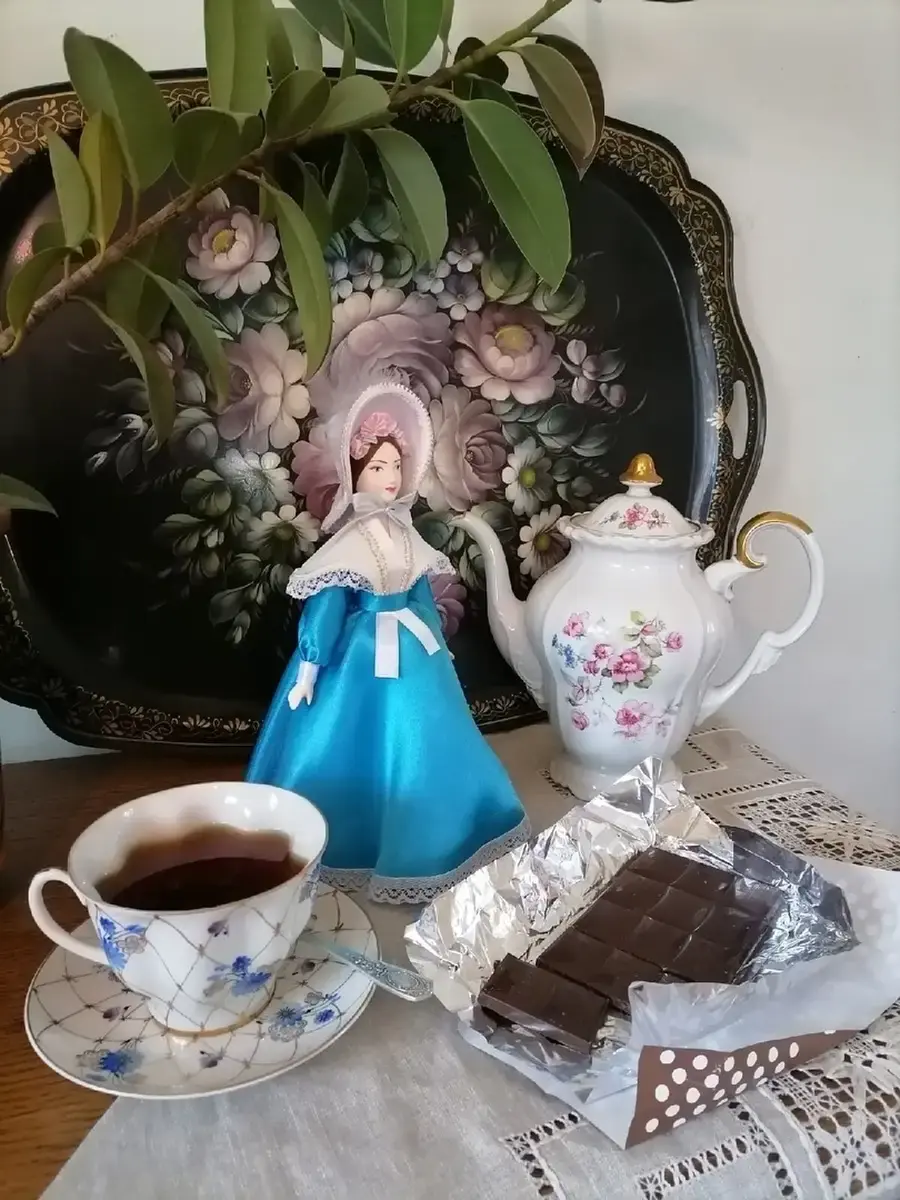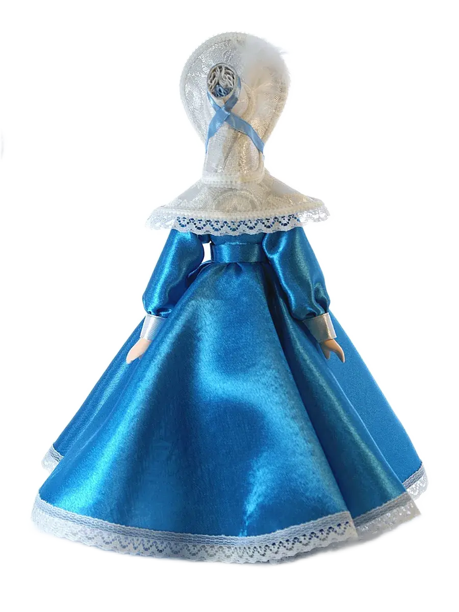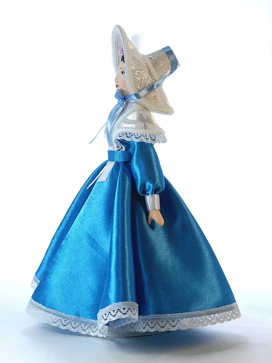 Голова и руки из бисквитного фарфора, отлиты и обожжены в собственной керамической мастерской при температуре +1200 градусов Цельсия. Расписаны вручную темперными красками. В основании конус из папье-маше (картон, ПВА, хлопчатобумажная ткань). Ног у данной модели не предусмотрено. Костюм несъемный текстильный: атлас, кружево, атласные ленты, тесьма.