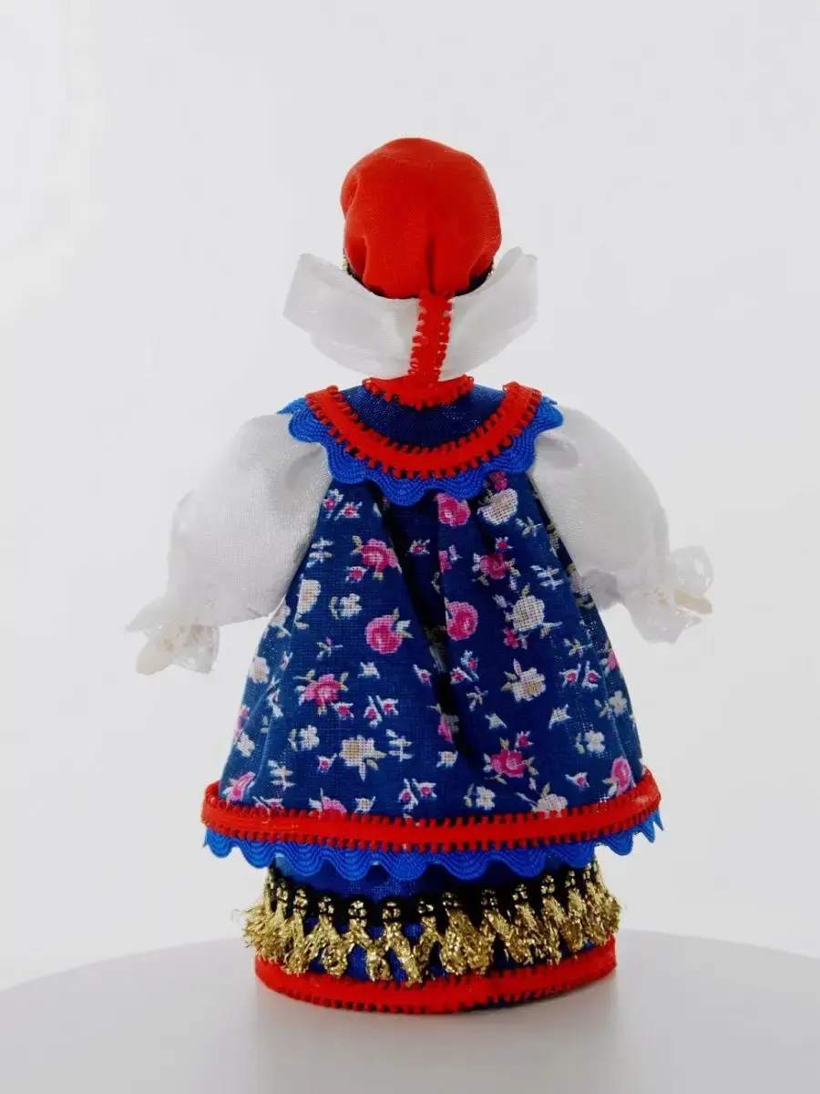 Высота около 16 см, костюм текстильный (тесьма, кружево) несъемный, в основании - конус из плотного картона, обтянутый тканью, ног у данной модели не предусмотрено.