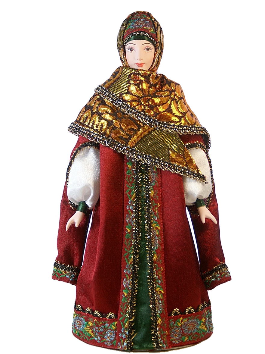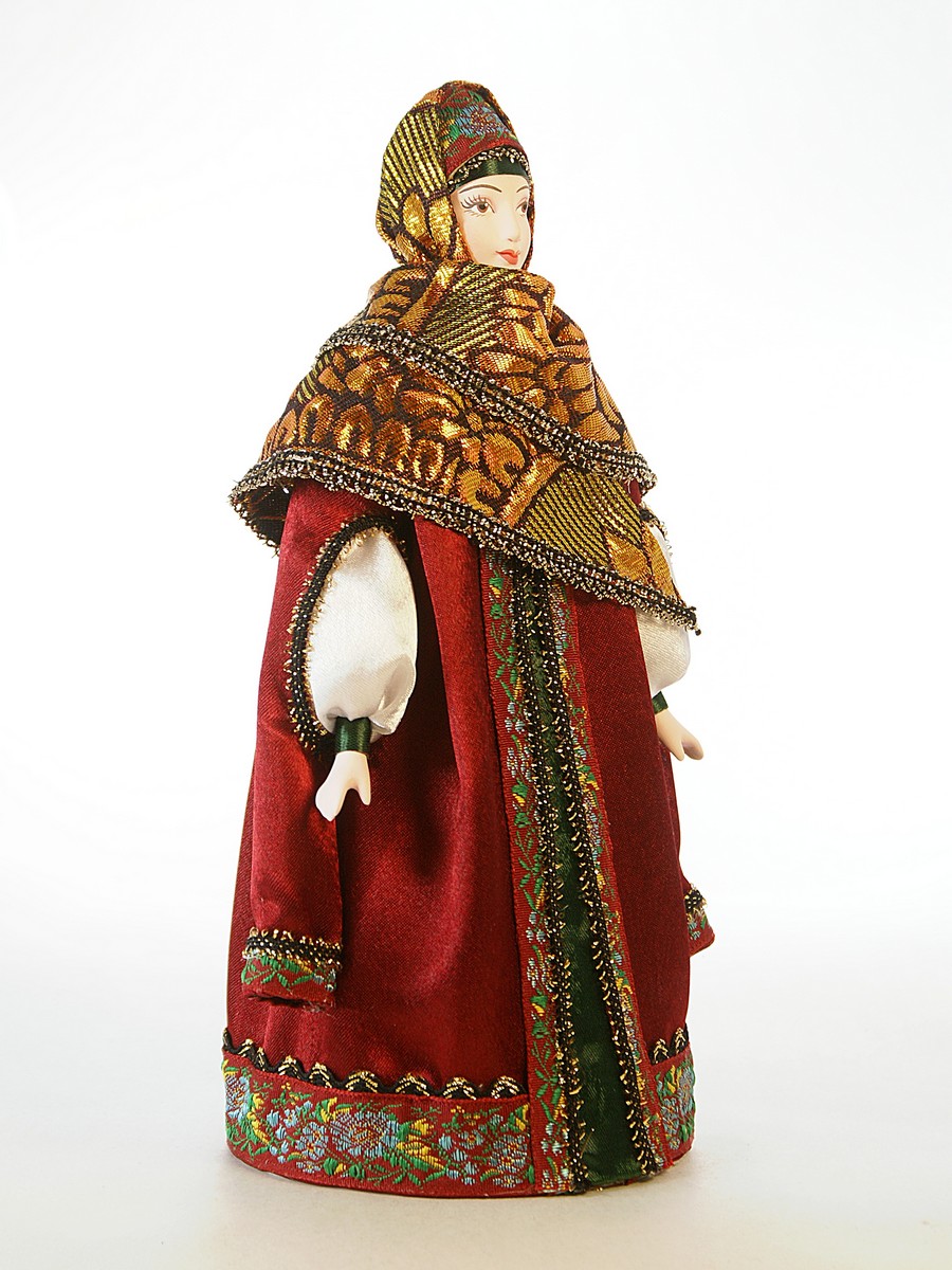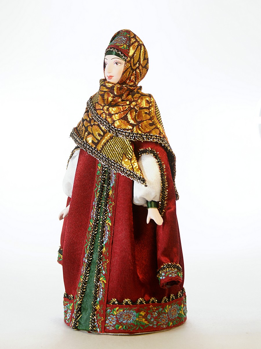 Фарфоровая коллекционная малотиражная кукла в русском костюме Боярыня. Сделана в Санкт-Петербурге мастерами предприятия народных художественных промыслов «Потешный промысел». Ручная работа.\nГолова и руки из бисквитного фарфора, отлиты и обожжены в собственной керамической мастерской при температуре +1200 градусов Цельсия. Расписаны вручную темперными красками. В основании конус из папье-маше (картон, ПВА, хлопчатобумажная ткань). Костюм несъемный текстильный: парча, атлас, тесьма.\n\nКонструкция: статуэтка. Высота 26 см. Модель №0127\nНог у данной модели не предусмотрено.\n\nПоставляется в крафтовой транспортировочной коробке с фирменным логотипом, пакете и пузырчатой плёнке.\n\nМы стараемся поддерживать актуальность изображений, однако это кукла ручной работы, поэтому конкретные экземпляры одной модели и одного выпуска похожи друг на друга как близнецы, но могут отличаться в мелких деталях. Куклы одной модели разных выпусков могут также отличаться деталями, цветом одежды и росписью лица.\n\nРекомендуем хранить и эксплуатировать в сухом помещении при температуре не ниже +16 градусов, не подвергать воздействию прямых солнечных лучей, воды и огня.