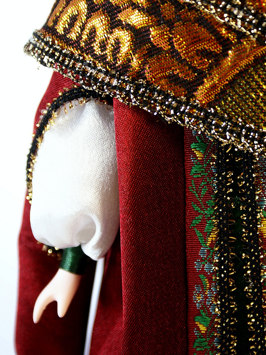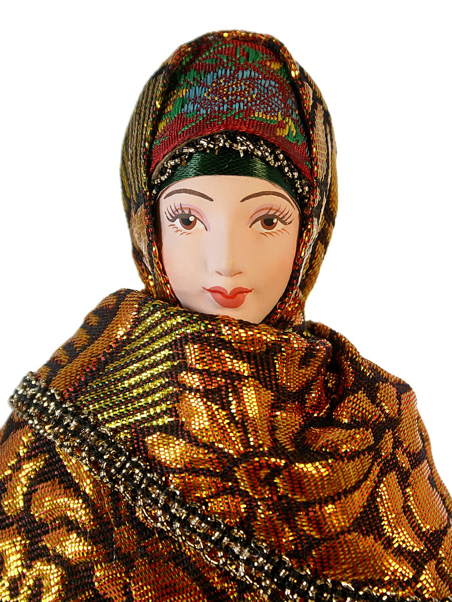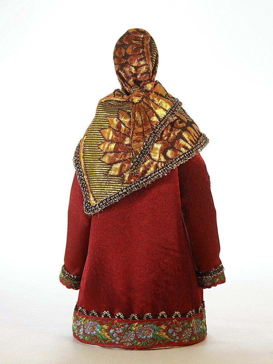 Фарфоровая коллекционная малотиражная кукла в русском костюме Боярыня. Сделана в Санкт-Петербурге мастерами предприятия народных художественных промыслов «Потешный промысел». Ручная работа.\nГолова и руки из бисквитного фарфора, отлиты и обожжены в собственной керамической мастерской при температуре +1200 градусов Цельсия. Расписаны вручную темперными красками. В основании конус из папье-маше (картон, ПВА, хлопчатобумажная ткань). Костюм несъемный текстильный: парча, атлас, тесьма.\n\nКонструкция: статуэтка. Высота 26 см. Модель №0127\nНог у данной модели не предусмотрено.\n\nПоставляется в крафтовой транспортировочной коробке с фирменным логотипом, пакете и пузырчатой плёнке.\n\nМы стараемся поддерживать актуальность изображений, однако это кукла ручной работы, поэтому конкретные экземпляры одной модели и одного выпуска похожи друг на друга как близнецы, но могут отличаться в мелких деталях. Куклы одной модели разных выпусков могут также отличаться деталями, цветом одежды и росписью лица.\n\nРекомендуем хранить и эксплуатировать в сухом помещении при температуре не ниже +16 градусов, не подвергать воздействию прямых солнечных лучей, воды и огня.