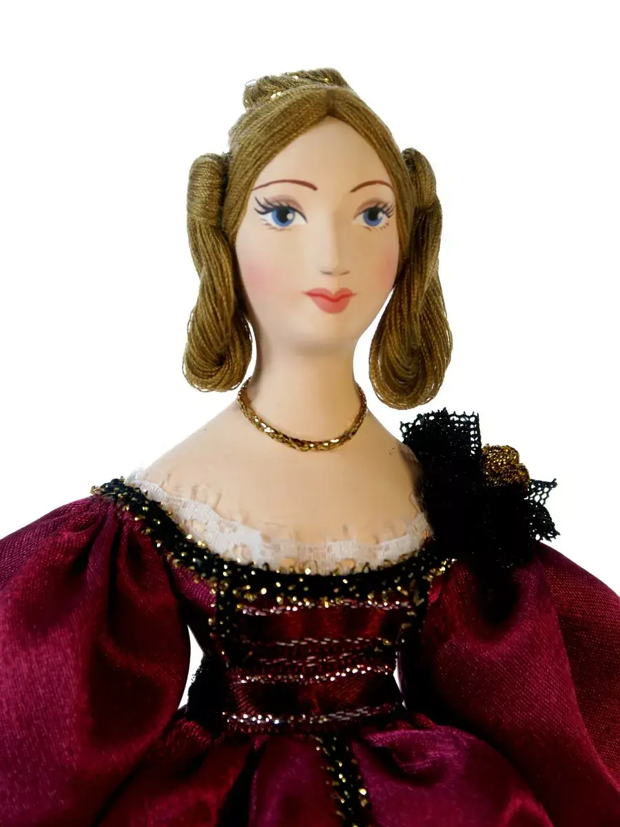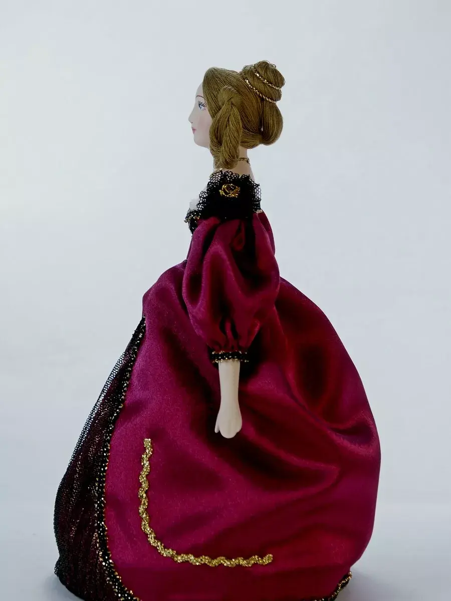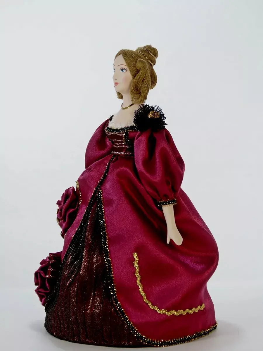 Голова, торс и руки выполнены из фарфора, обожжены в собственной керамической мастерской при температуре +1200 градусов Цельсия, расписаны вручную акриловыми/темперными красками, в основании - конус из плотного картона, обтянутый тканью. Костюм текстильный: атлас, ленты атласные, тесьма, гипюр, хлопок. Ног у данной модели не предусмотрено.