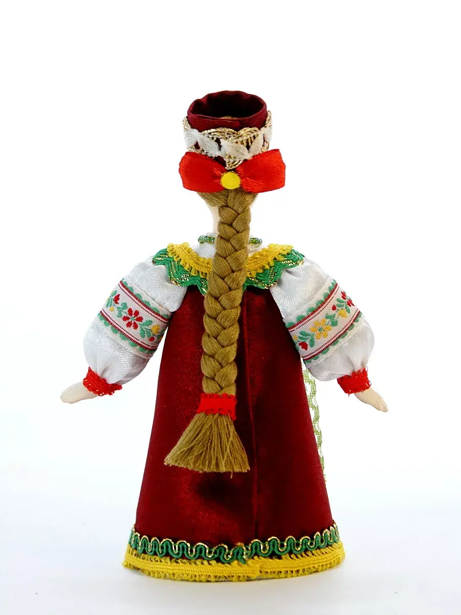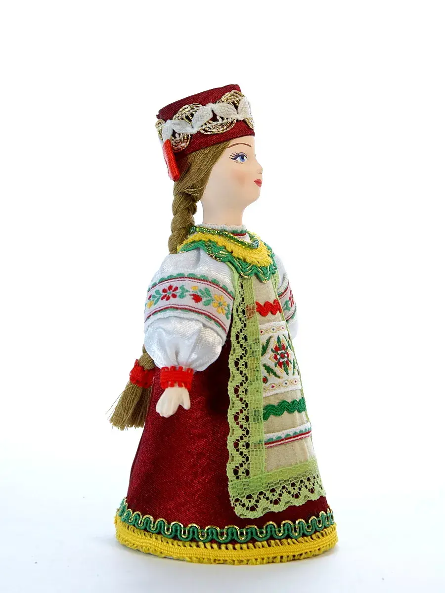 Высота около 16 см, костюм текстильный (ситец, атлас, тесьма) несъемный, в основании - конус из плотного картона, шириной около 8 см, обтянутый тканью, ног у данной модели не предусмотрено. Поставляется в крафтовой транспортировочной коробке с фирменным логотипом, зип-пакете и пузырчатой плёнке.