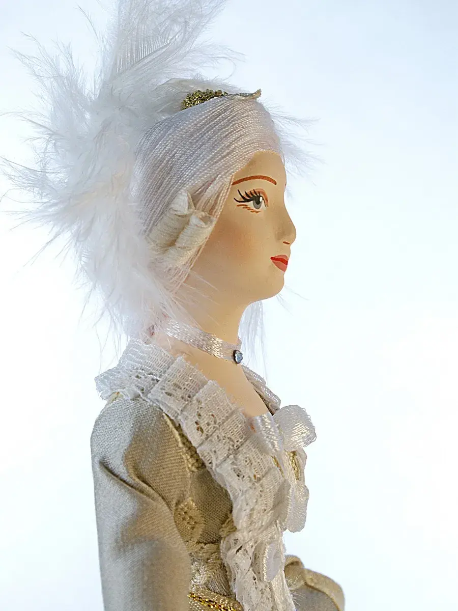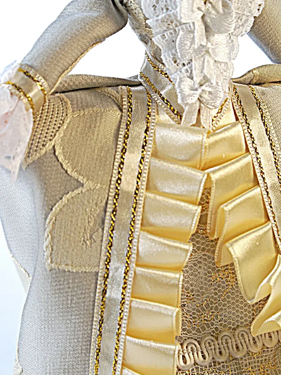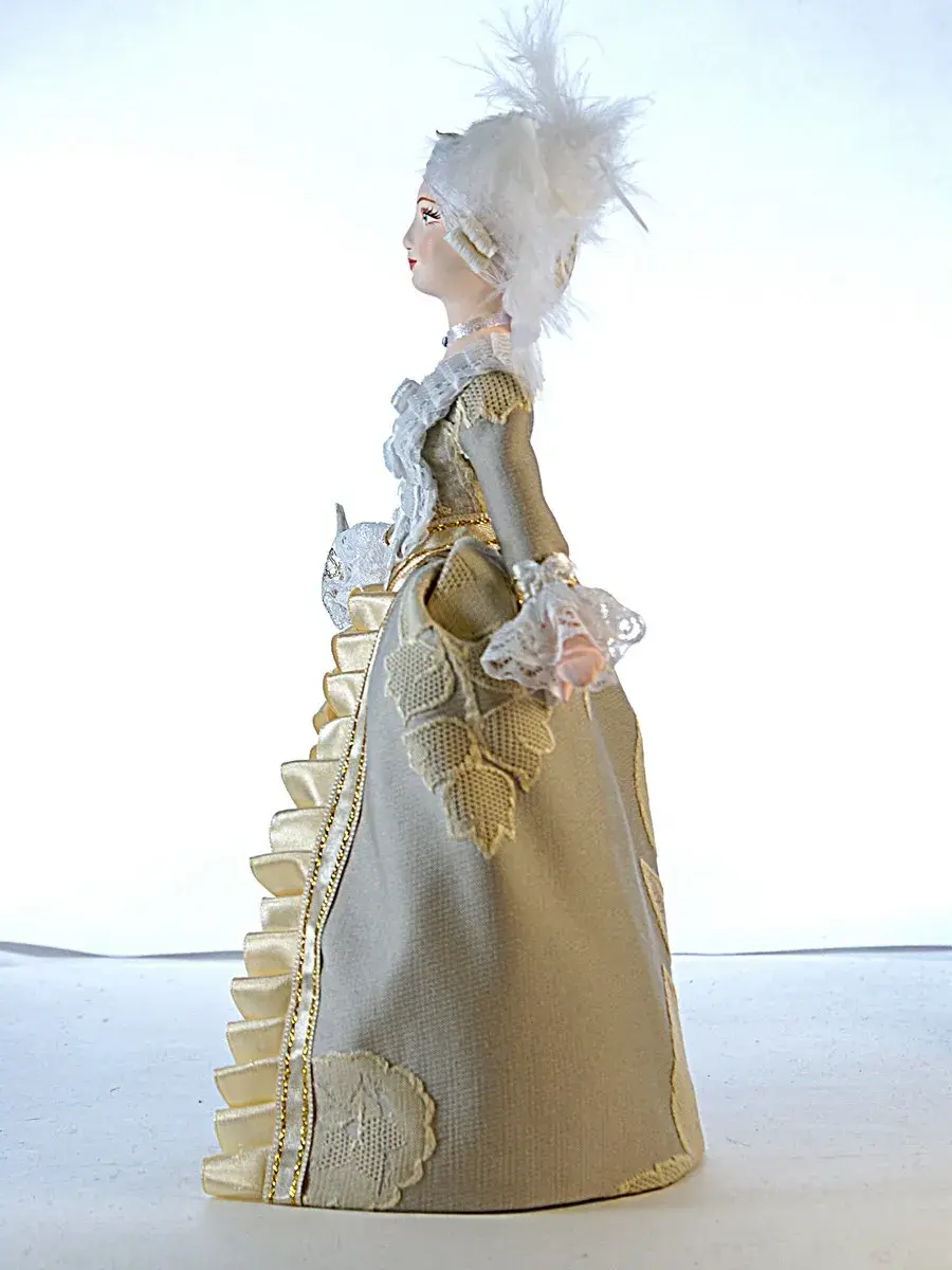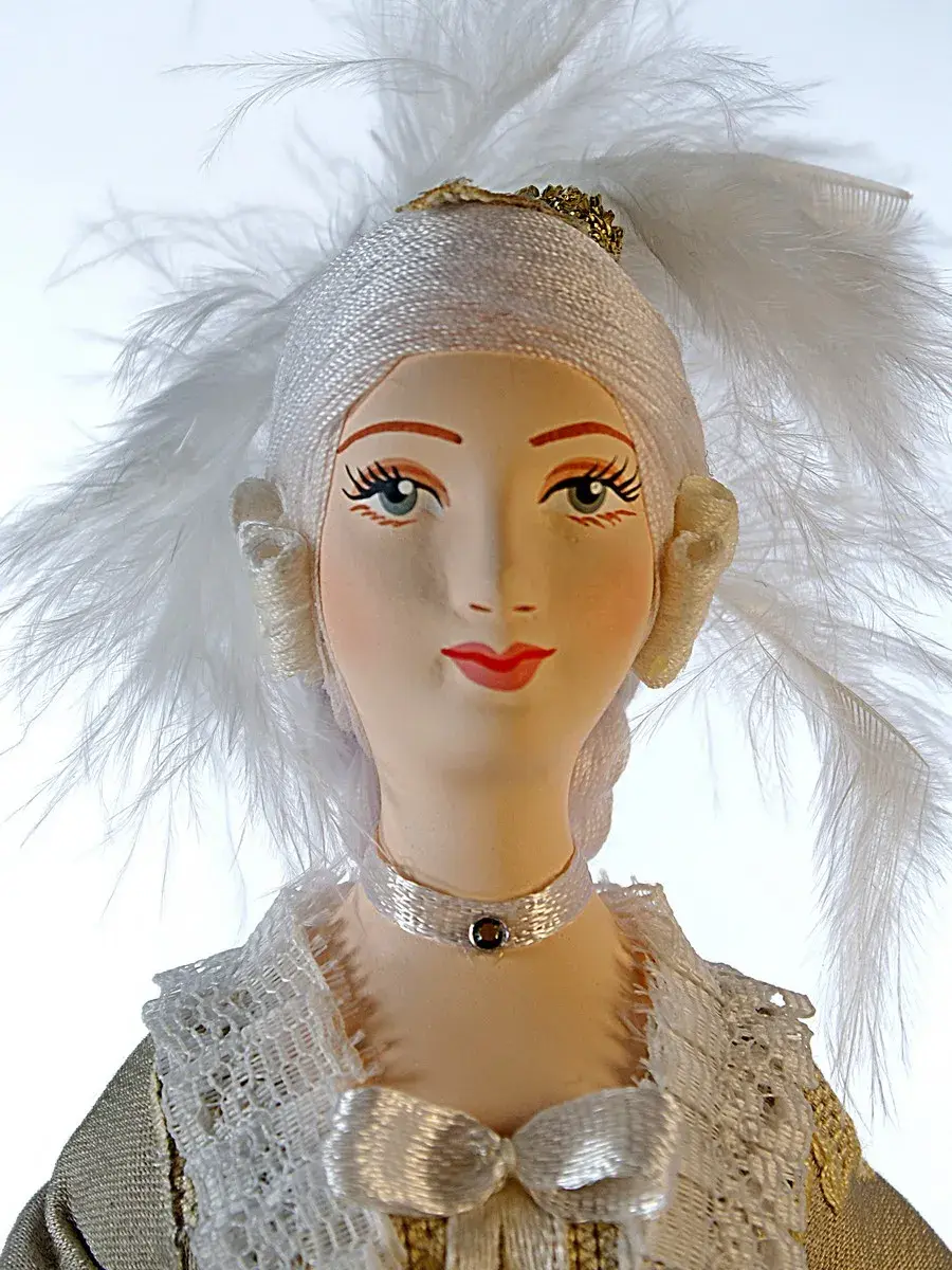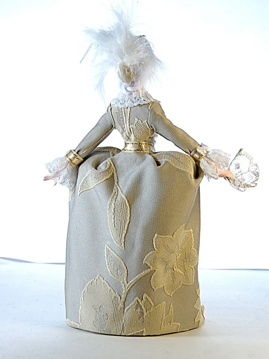 Высота около 26 см, костюм текстильный (тесьма, кружево) несъемный, в основании - конус из плотного картона, обтянутый тканью, ног у данной модели не предусмотрено.