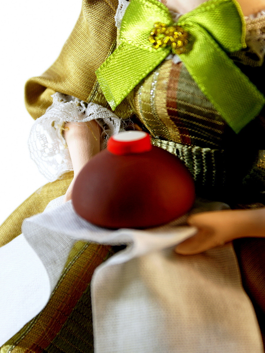 Голова, торс и руки выполнены из фарфора в собственной керамической мастерской, расписаны акриловыми/темперными красками.