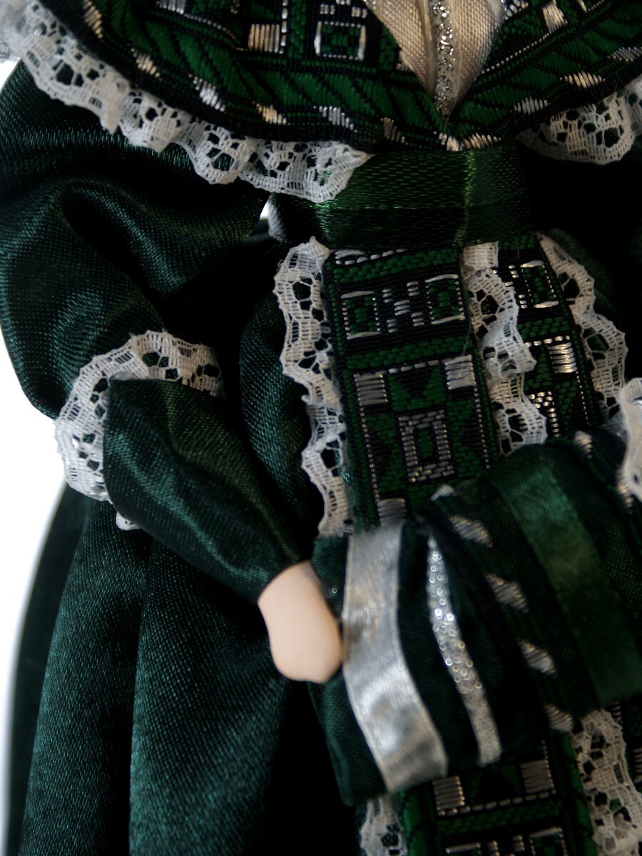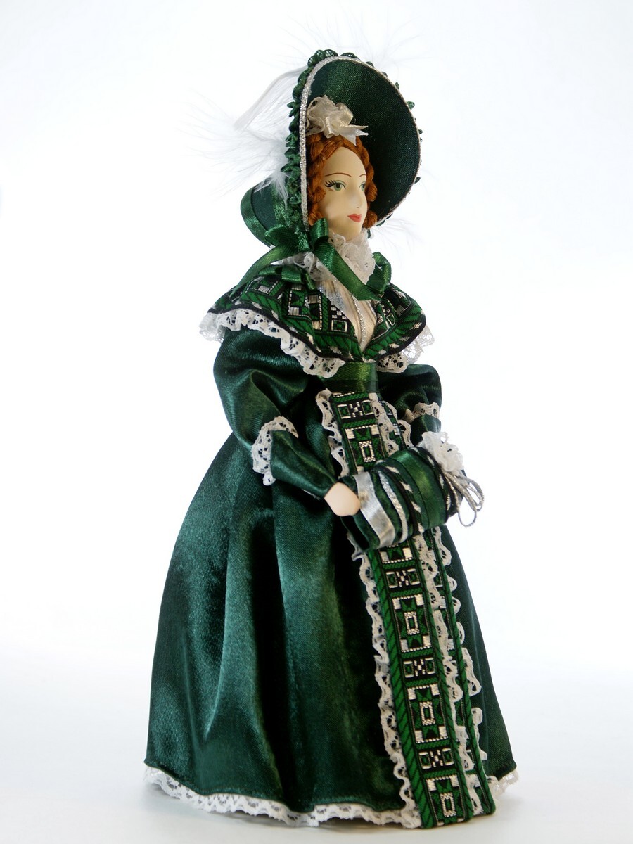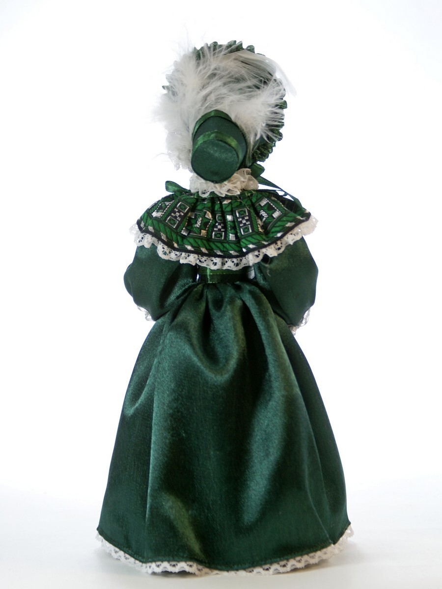 Высота около 27 см, костюм текстильный (ситец, атлас, тесьма, кружево, шифон) несъемный, в основании — конус из плотного картона, обтянутый тканью, ног у данной модели не предусмотрено.