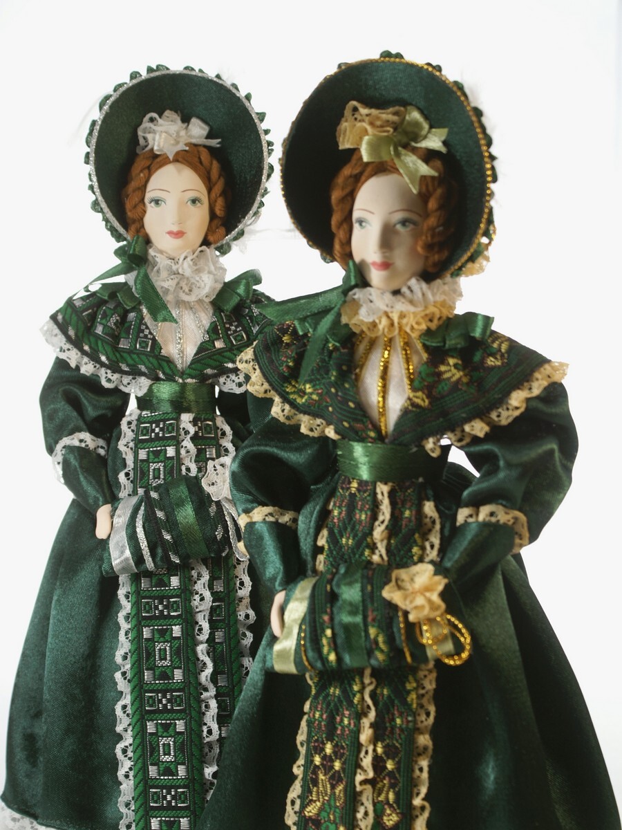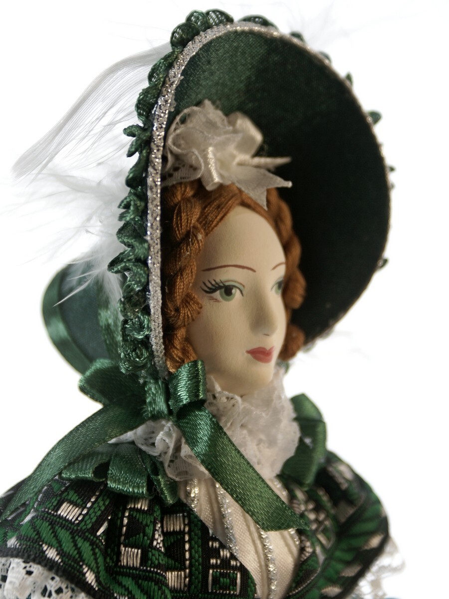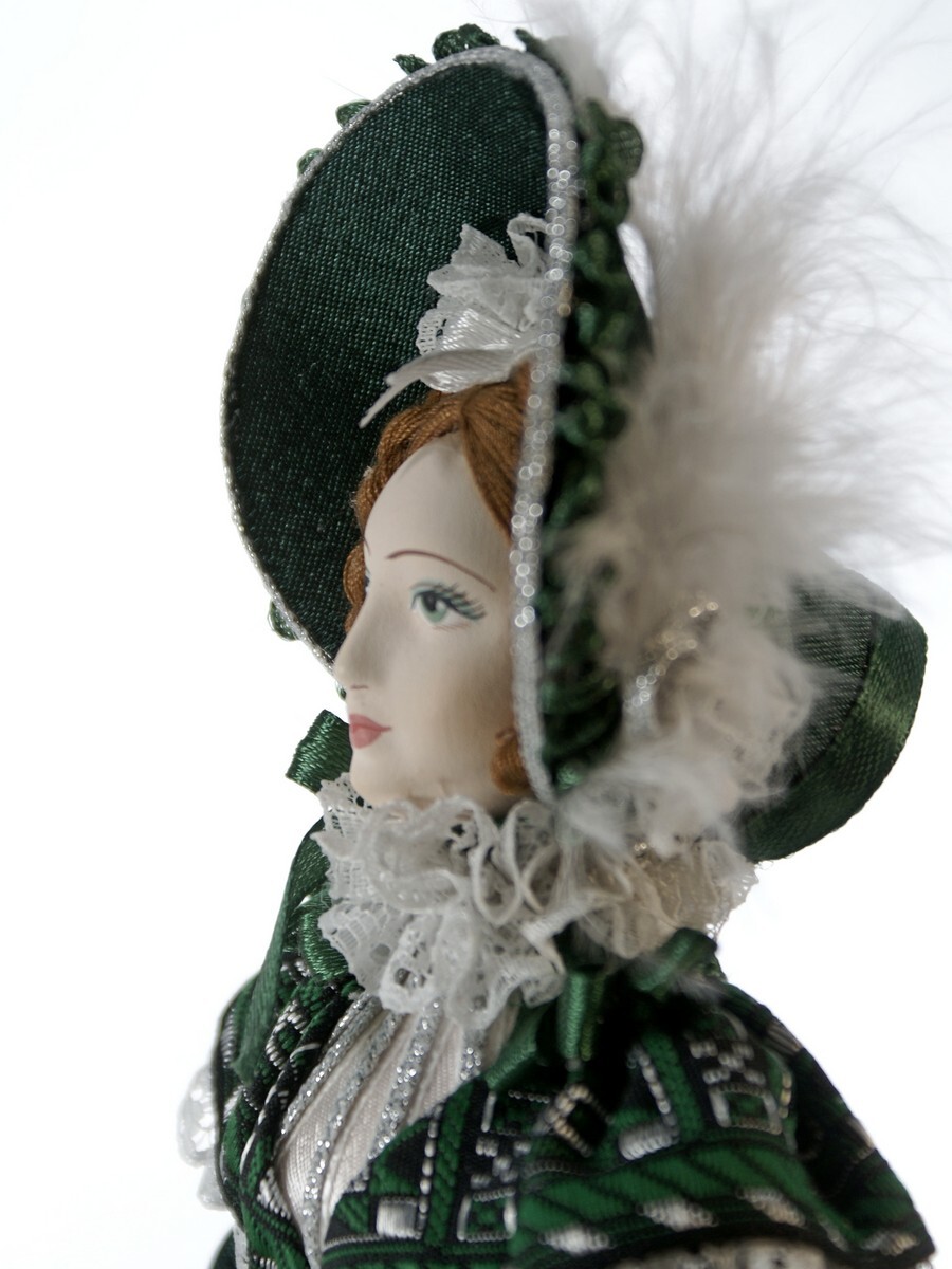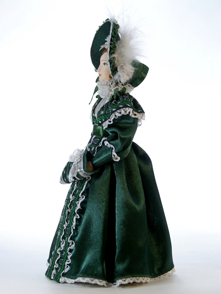 Высота около 27 см, костюм текстильный (ситец, атлас, тесьма, кружево, шифон) несъемный, в основании — конус из плотного картона, обтянутый тканью, ног у данной модели не предусмотрено.