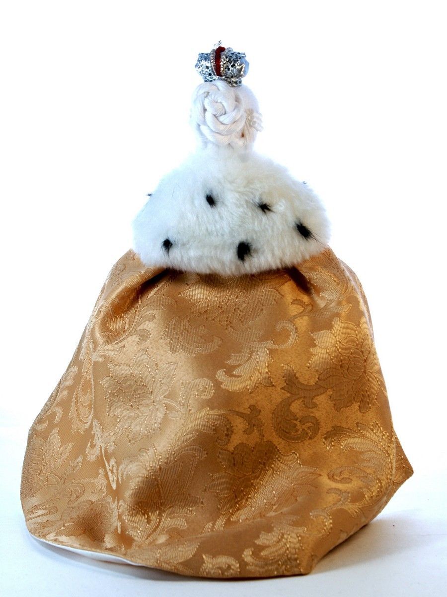 Высота около 28 см, костюм текстильный (тесьма, кружево) несъемный, в основании - конус из плотного картона, обтянутый тканью, ног у данной модели не предусмотрено.