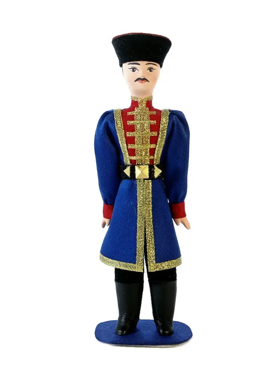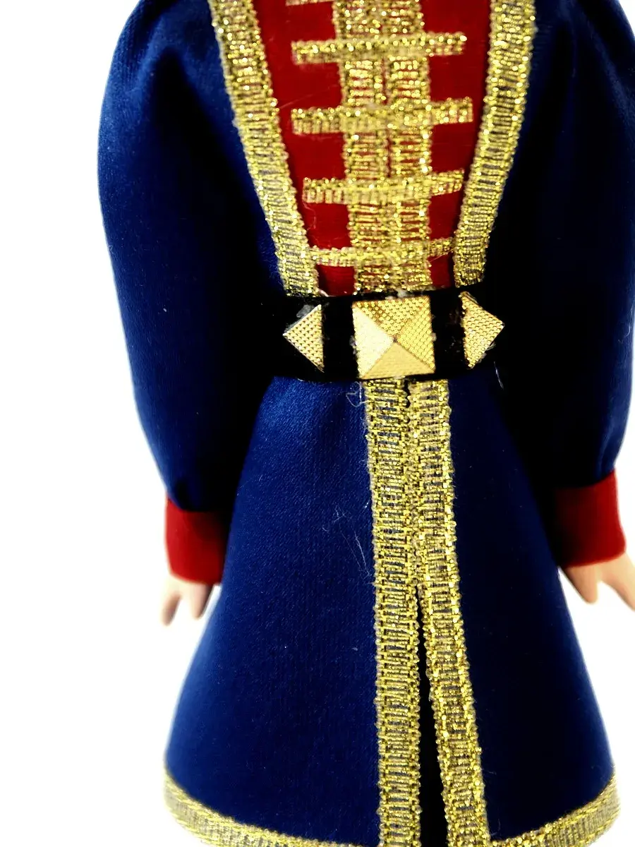 Высота около 17 см, костюм текстильный (атлас, тесьма) несъемный, в основании - несъемная подставка. Поставляется в крафтовой транспортировочной коробке с фирменным логотипом, зип-пакете и пузырчатой плёнке.