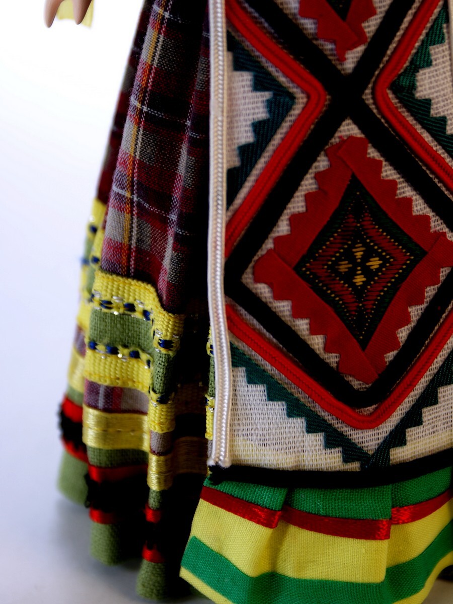 Высота около 26 см, костюм текстильный (ситец, тесьма) несъемный, в основании – конус из плотного картона, обтянутый тканью, ног у данной модели не предусмотрено.