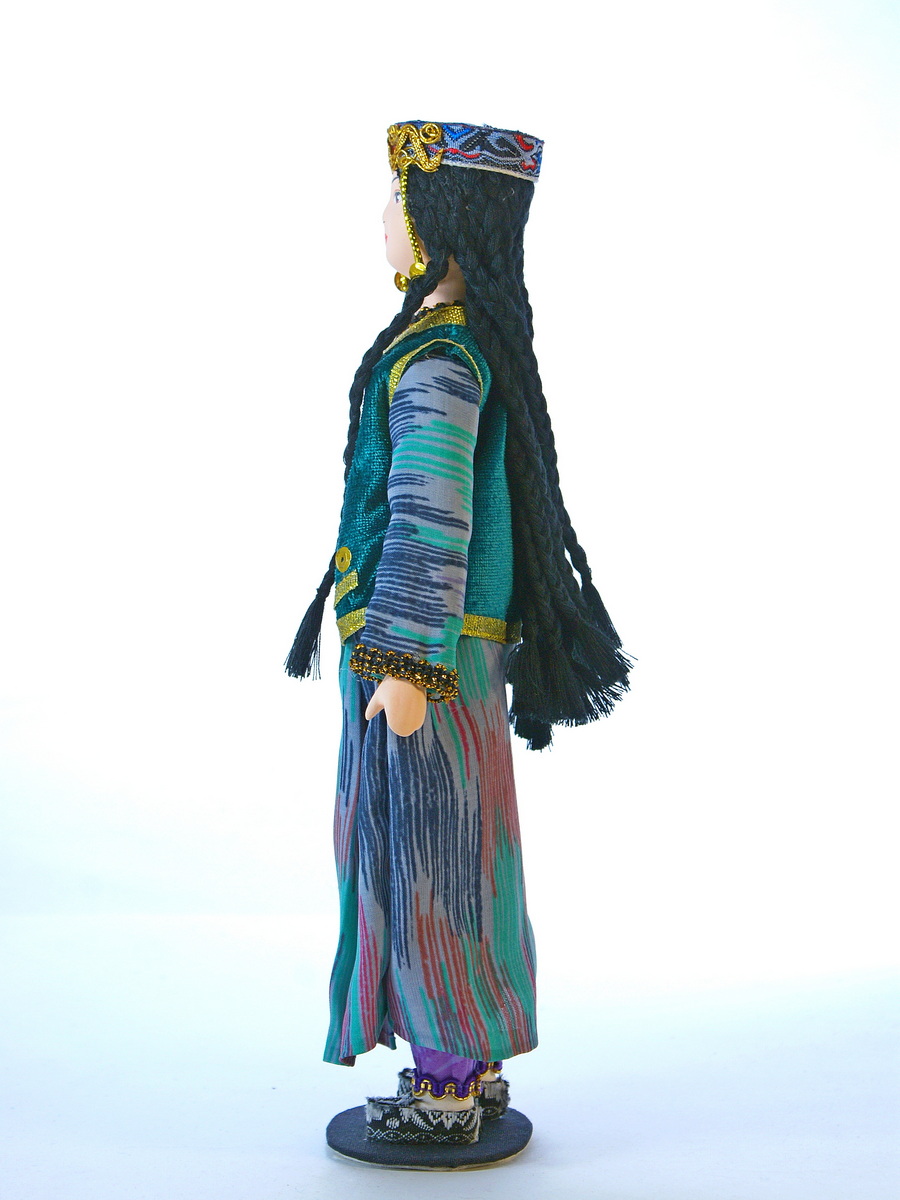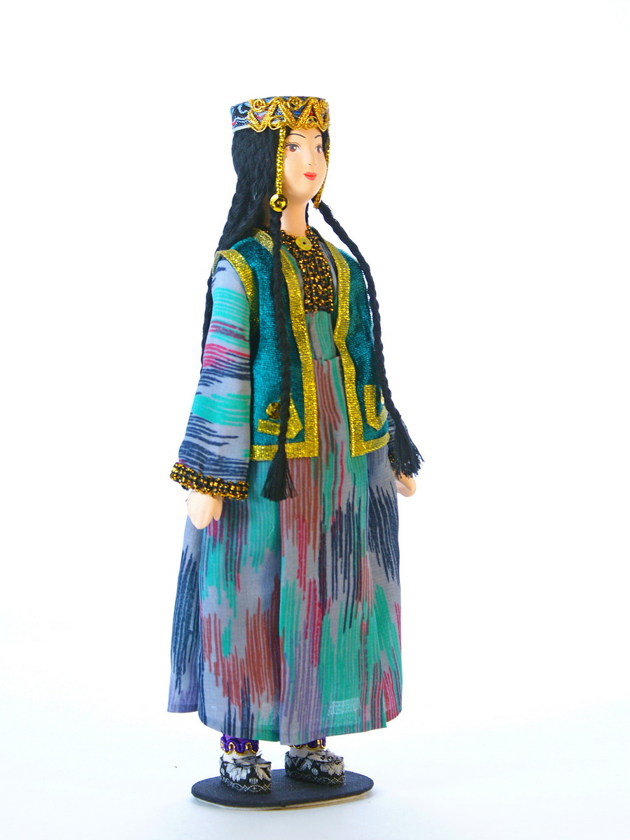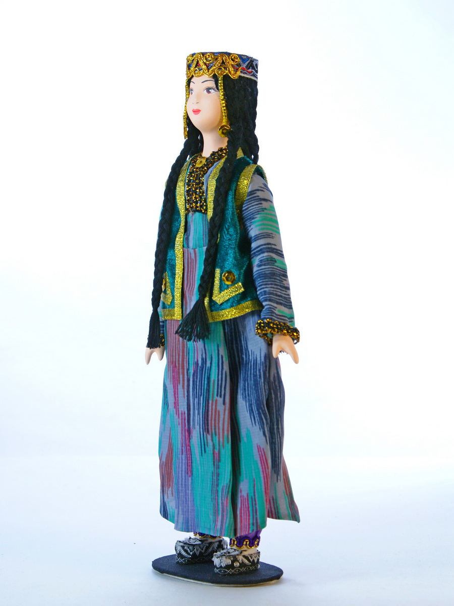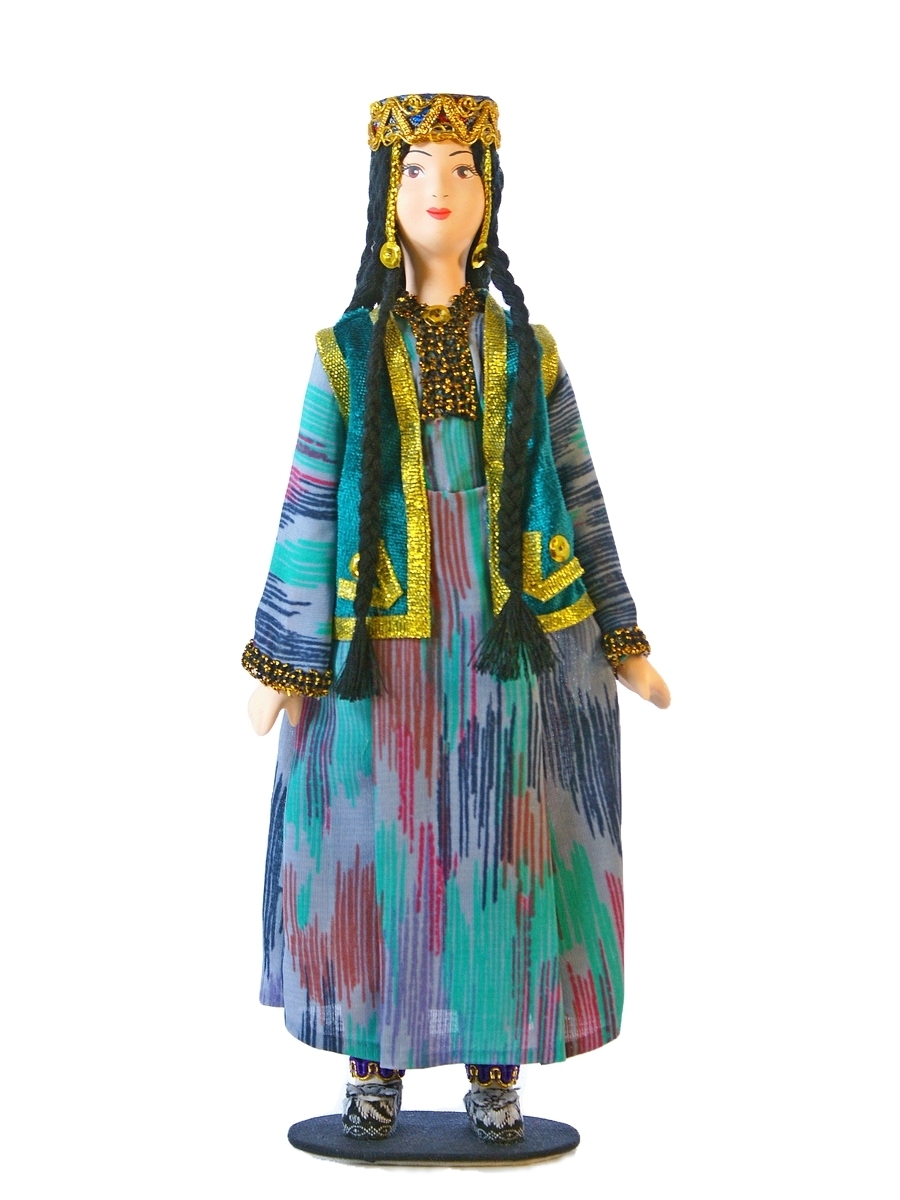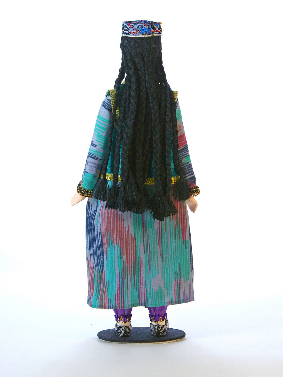 "alt": "Кукла на подставке Узбечка. Бухара, Хорезм. Узбекский праздничный девичий костюм. Середина 20 века.",
