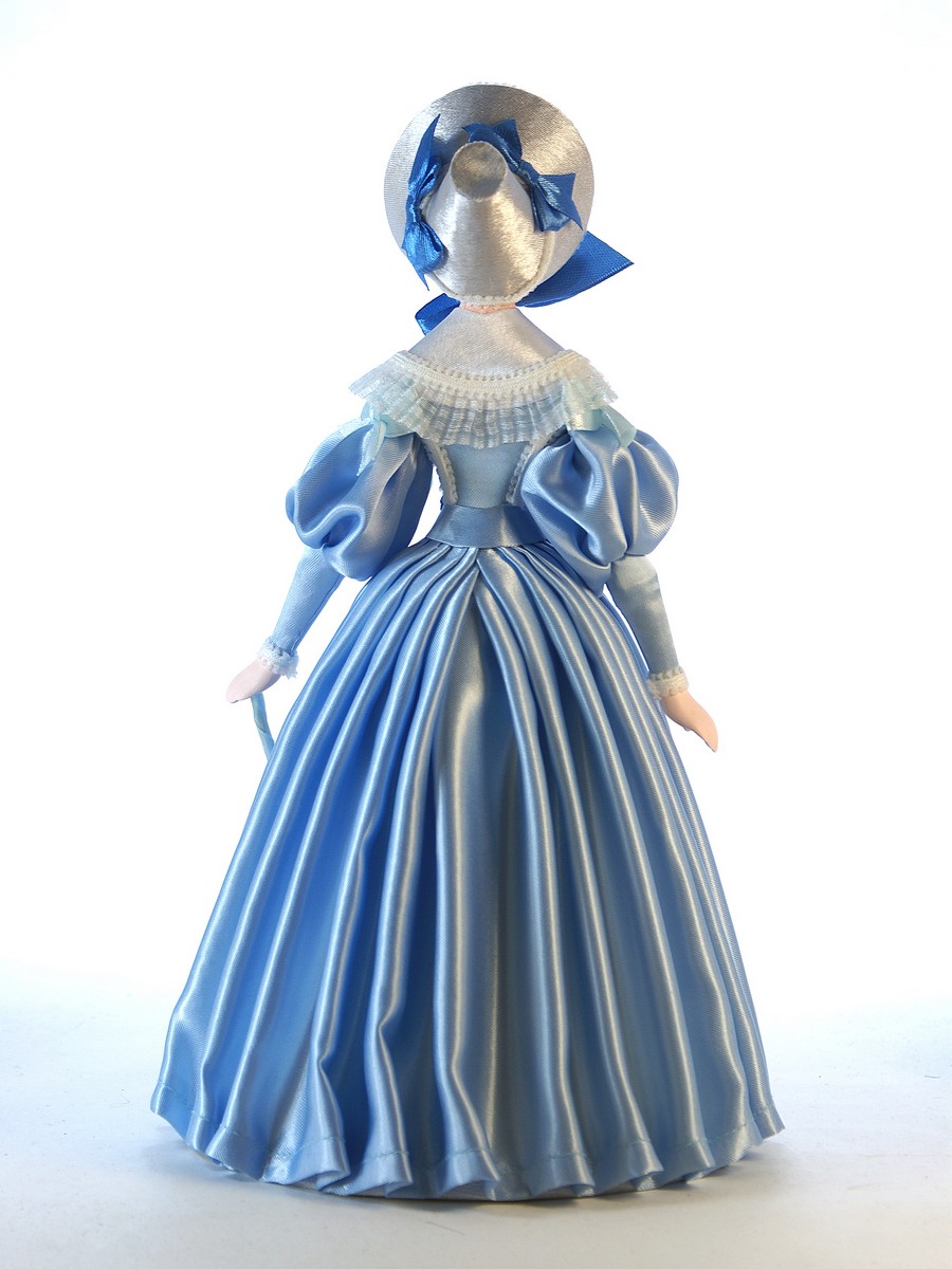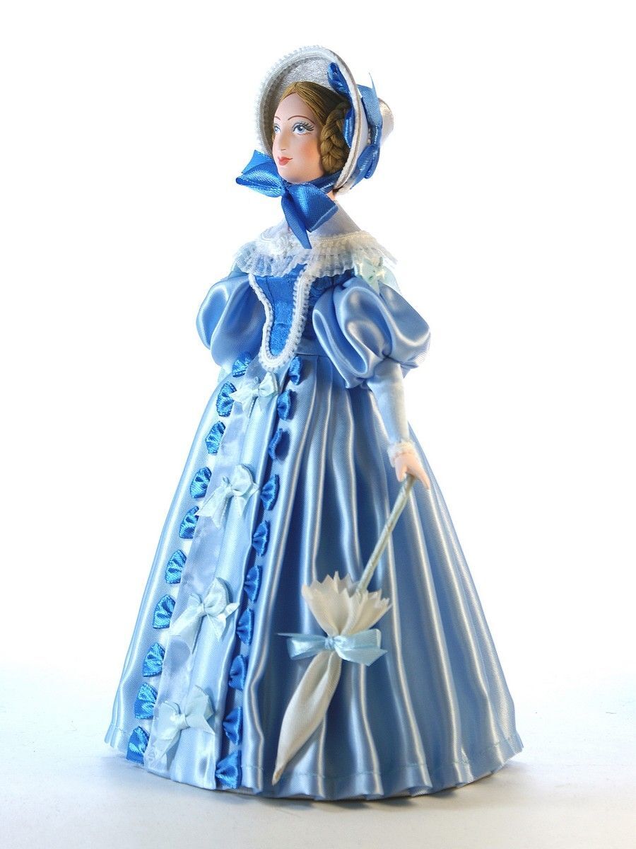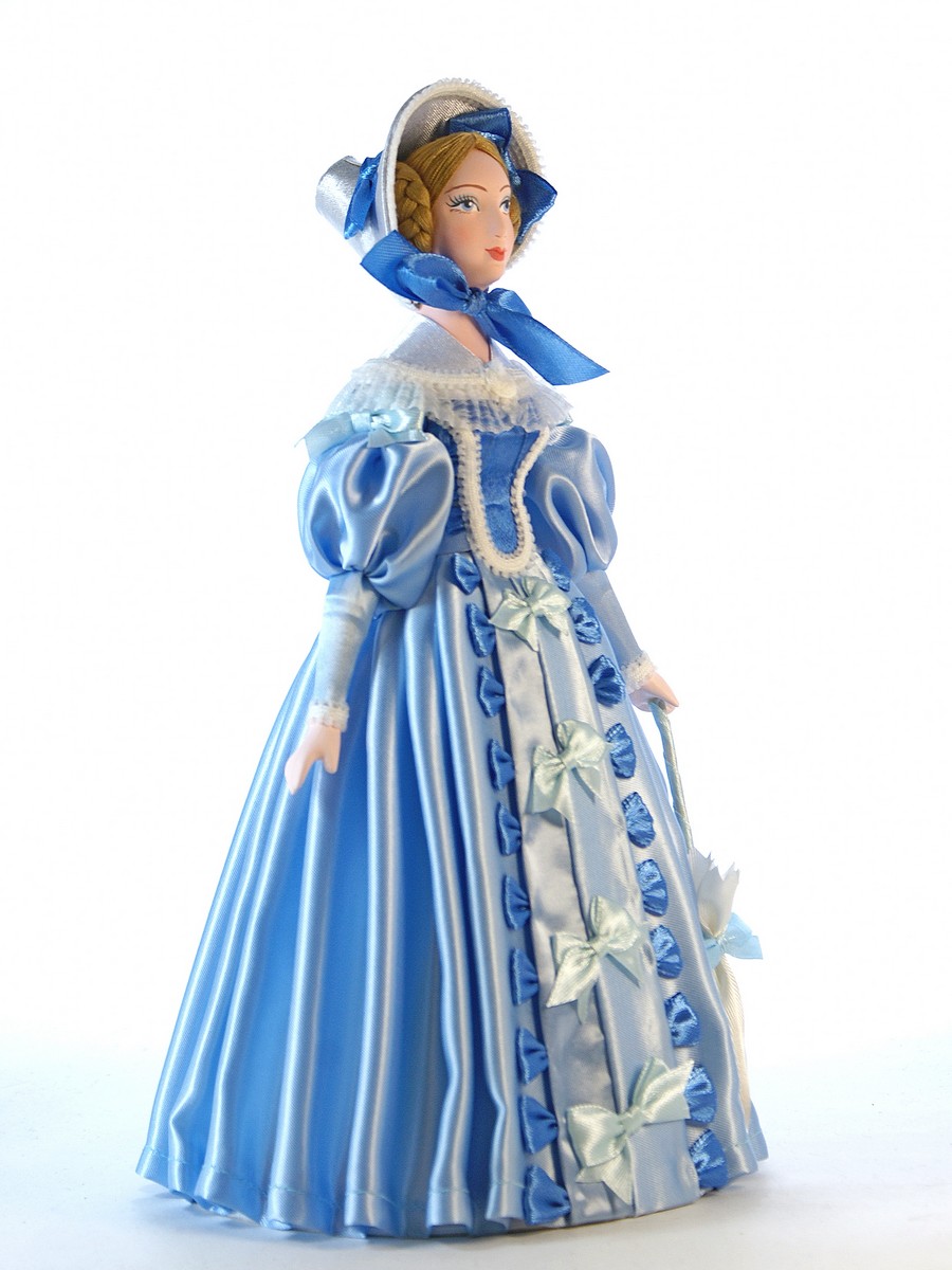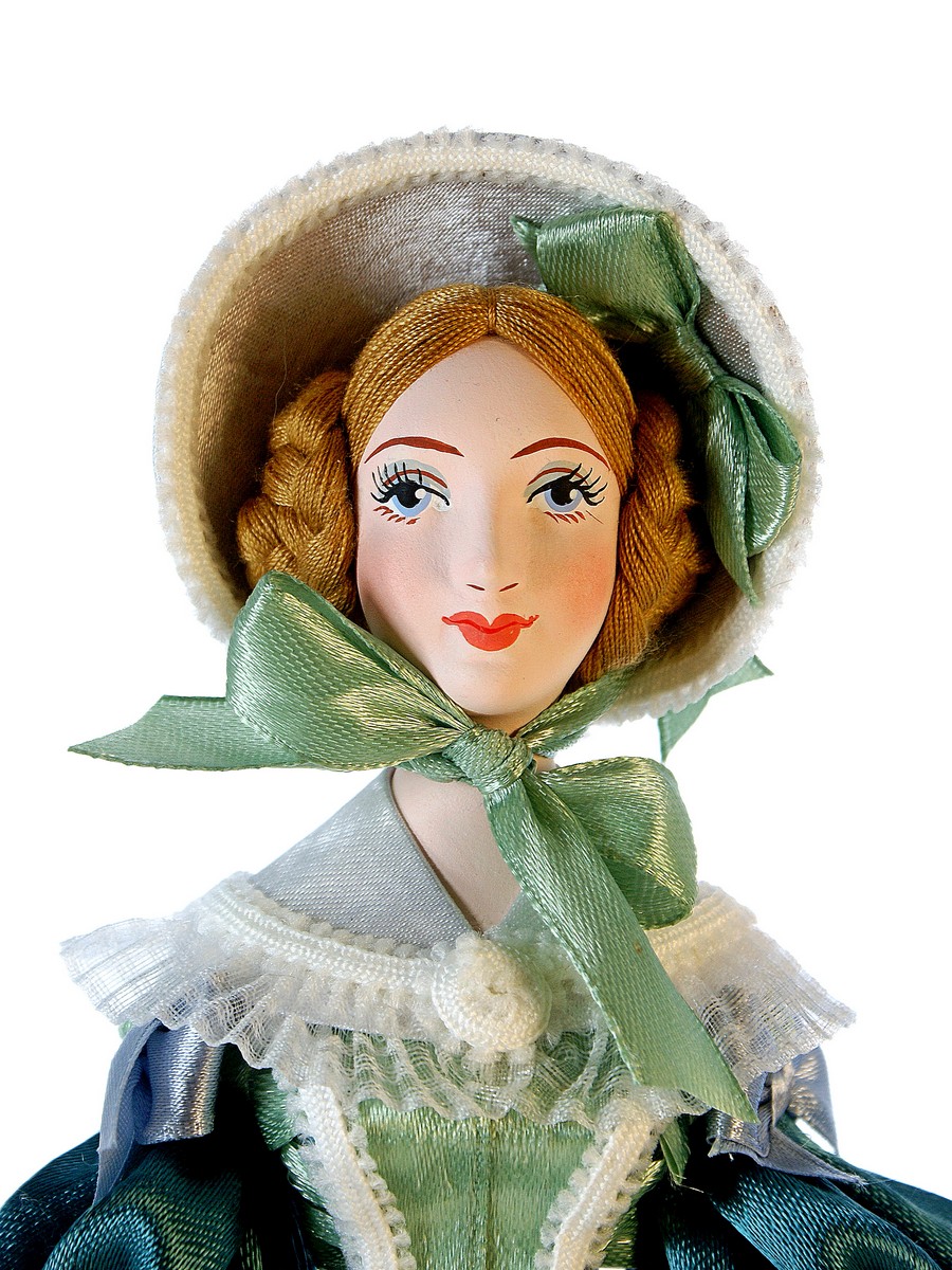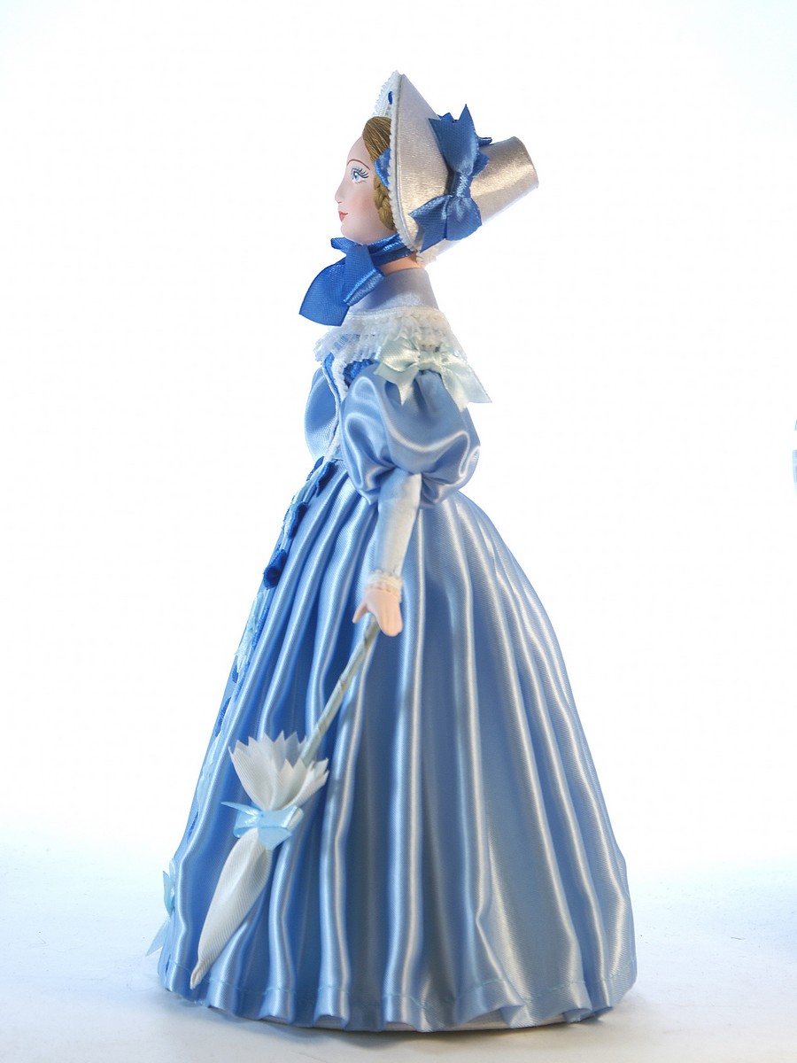 Голова, торс и руки выполнены из фарфора, обожжены в собственной керамической мастерской при температуре +1200 градусов Цельсия, расписаны вручную акриловыми/темперными красками, в основании - конус из плотного картона, обтянутый тканью. Костюм текстильный. Ног у данной модели не предусмотрено.