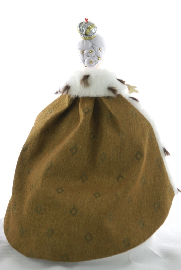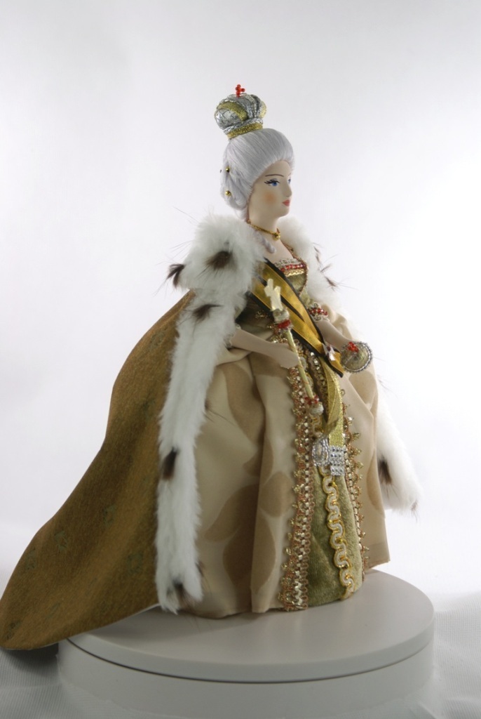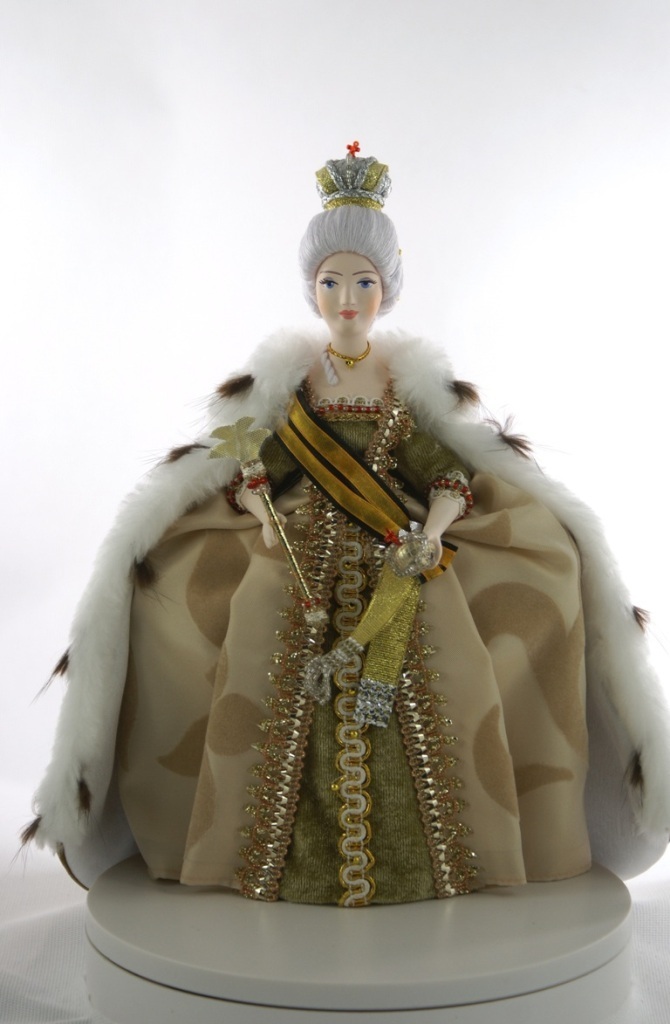 Кукла фарфоровая сувенирная "Императрица Екатерина II Великая" на конусном основании. Из фарфора изготовлены (отлиты) руки и голова (торс). Роспись ручная темперными красками. Костюм текстильный. Высота 27 см.