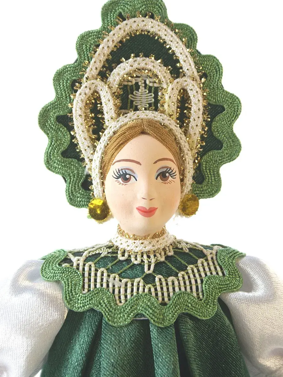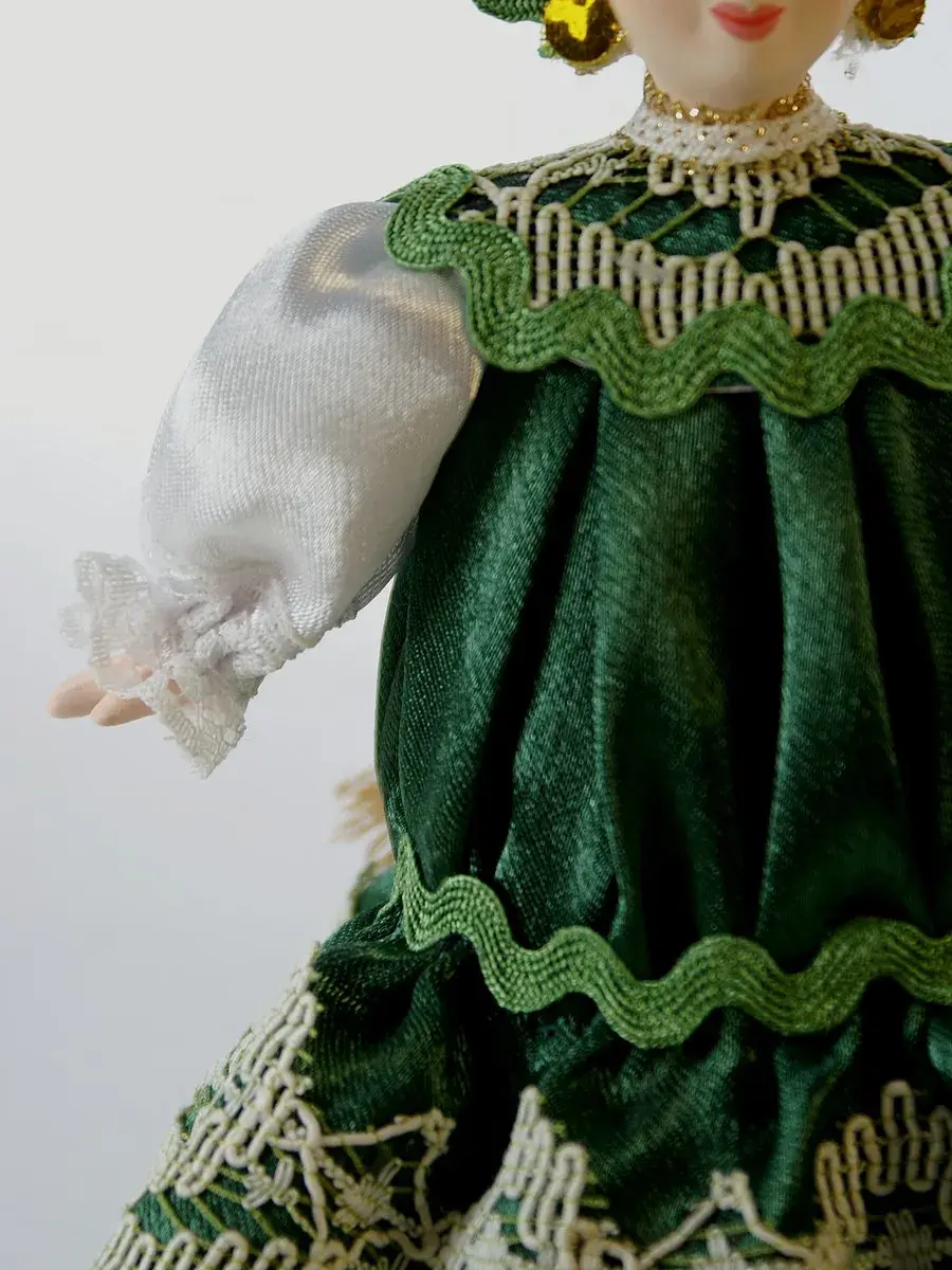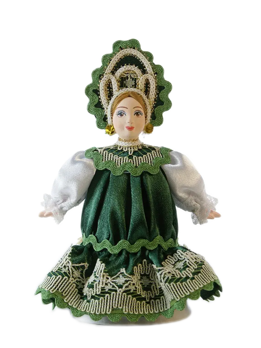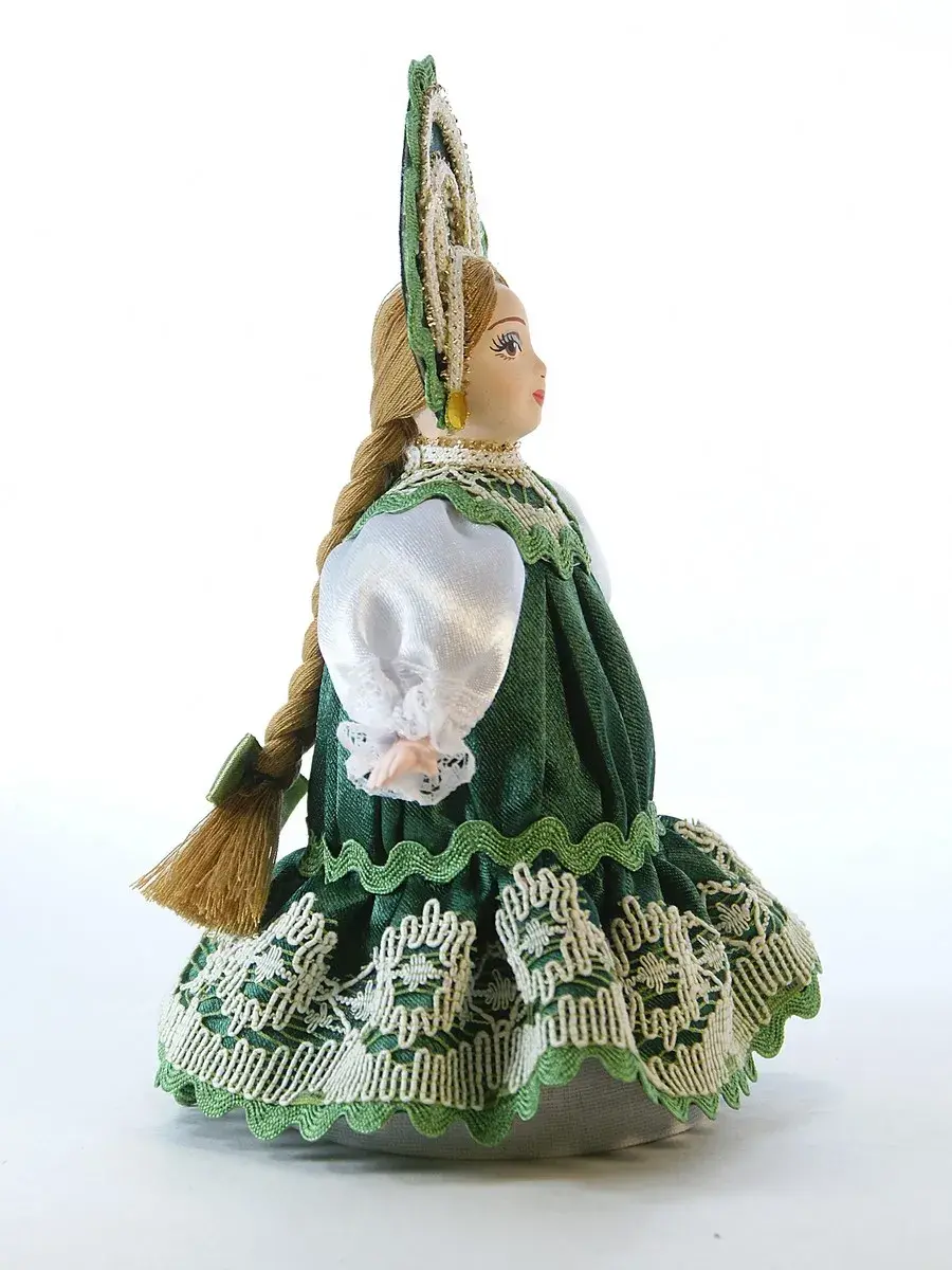 Высота около 18 см, костюм текстильный (атлас, тесьма, вологодское кружево) несъемный, в основании - конус из плотного картона, обтянутый тканью, ног у данной модели не предусмотрено.