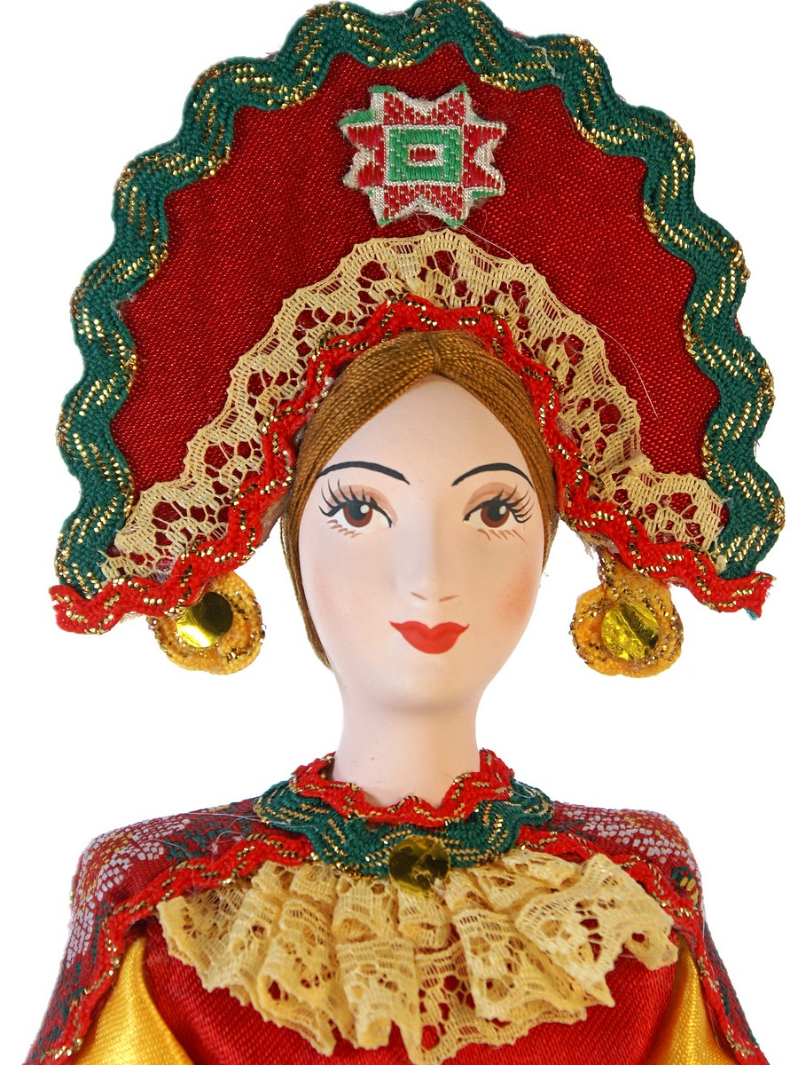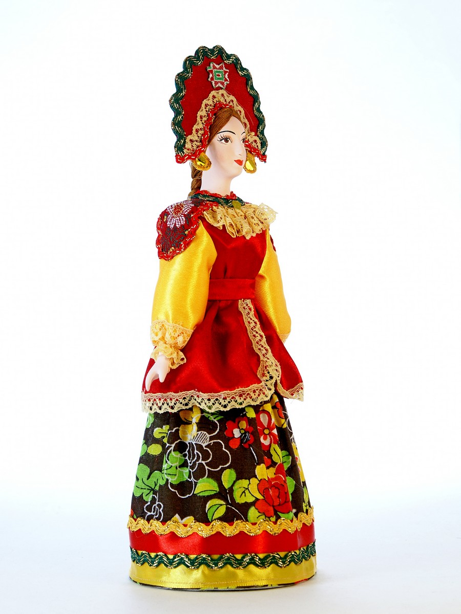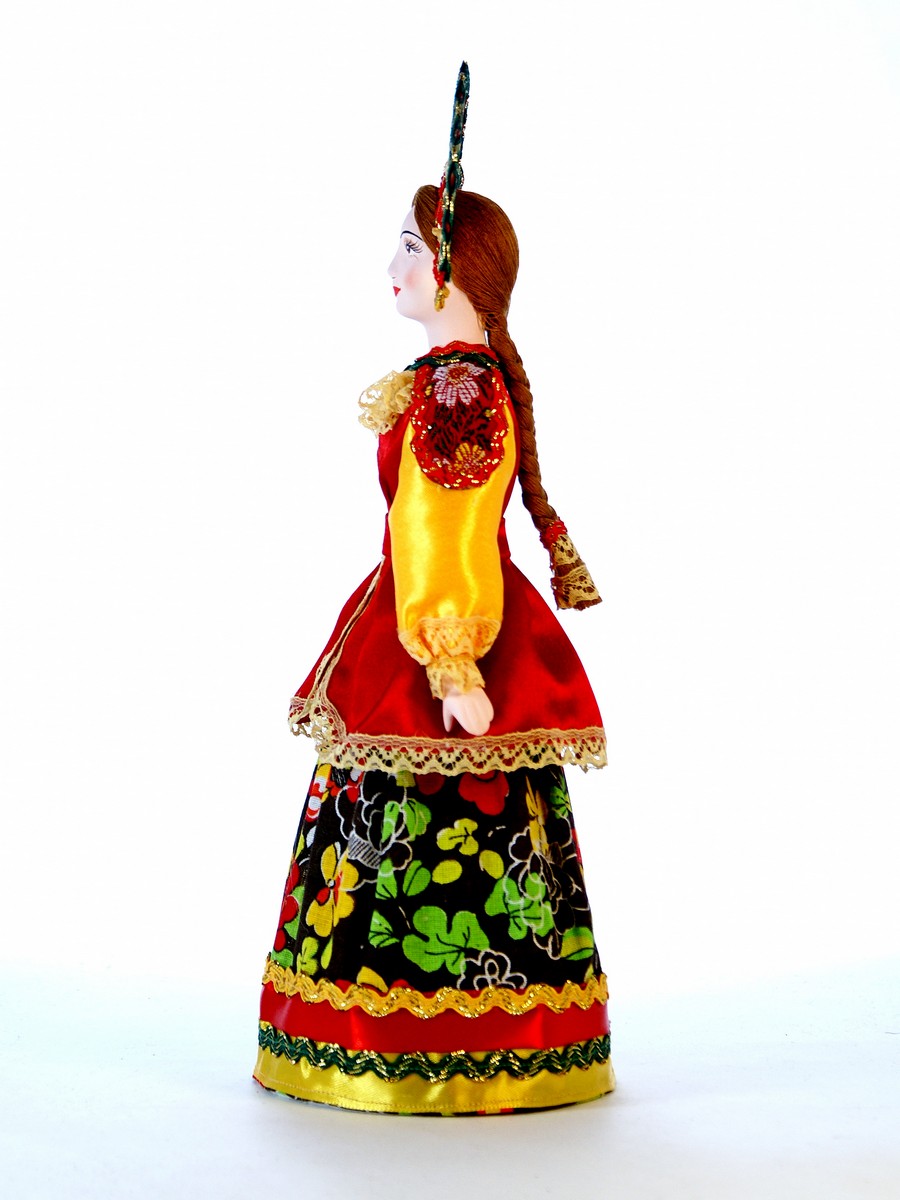 Кукла Потешного промысла в Девичьем праздничном костюме. Россия. Материал фарфор. текстиль. Высота 28 см. Артикул 0546.\n\n