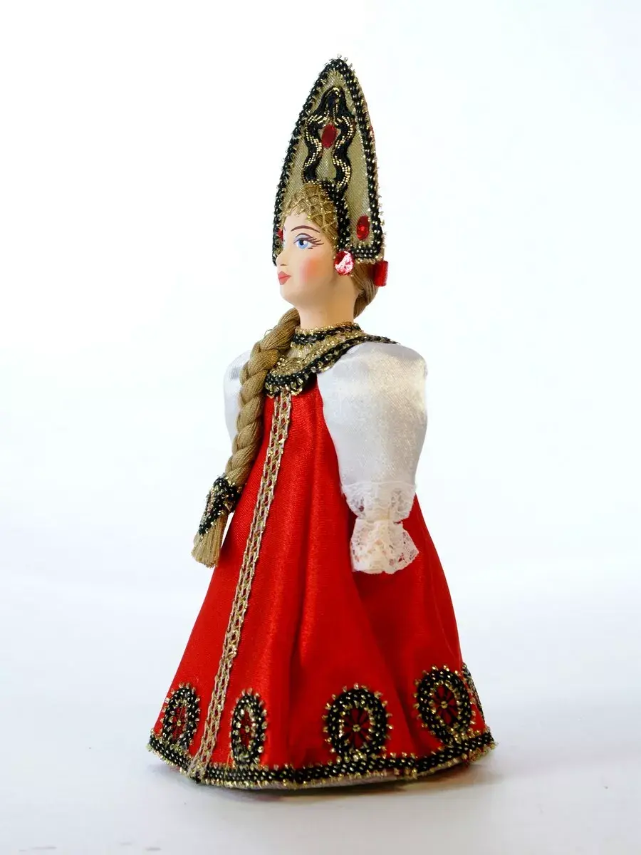 Кукла фарфоровая сувенирная, коллекционная в русском стиле "Красна-девица". Девушка в праздничном традиционном национальном костюме: сарафане, кокошнике, с русой косой.