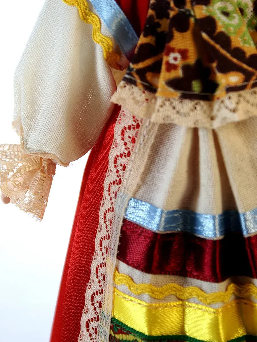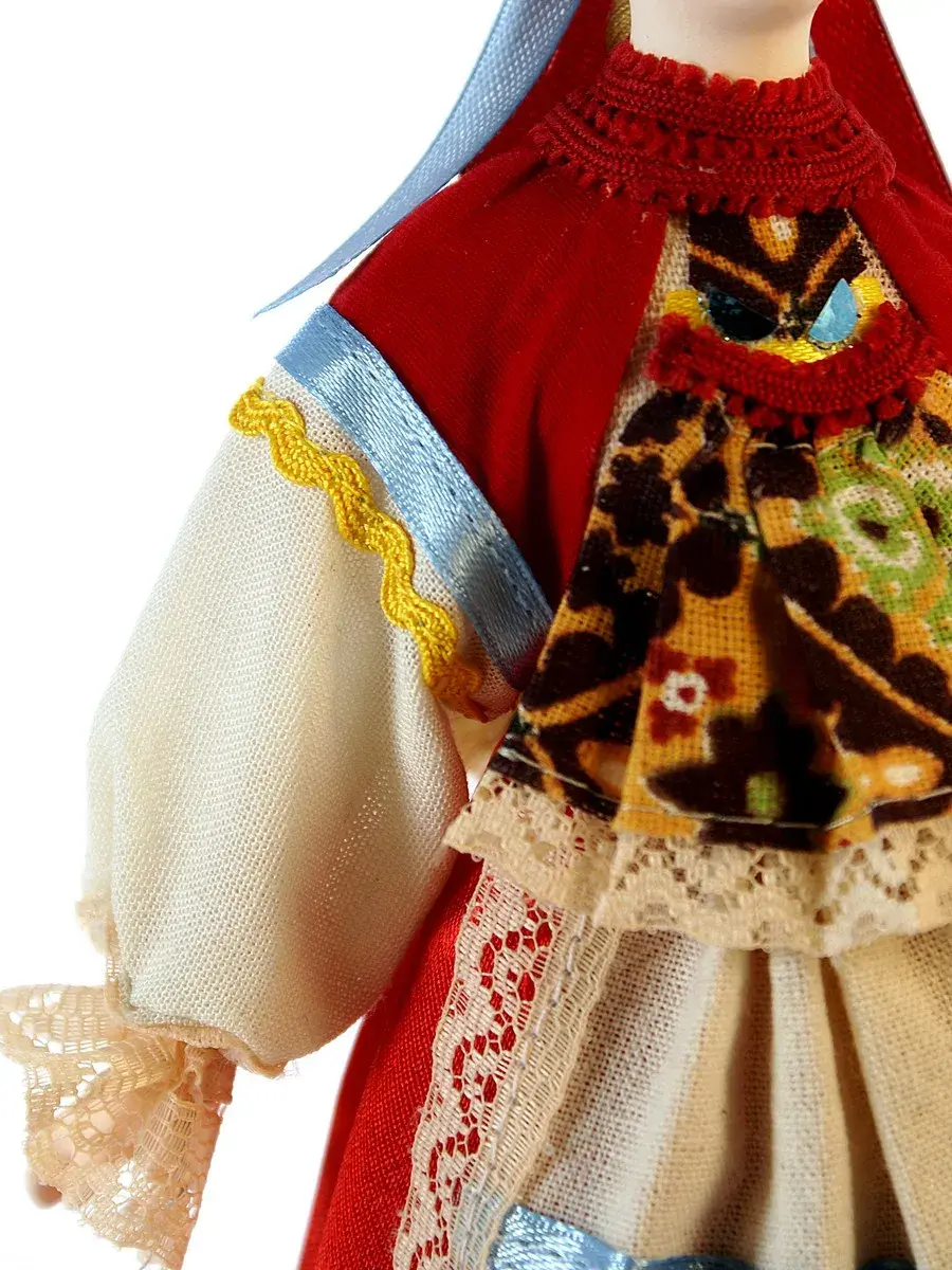 Голова, торс и руки выполнены из фарфора в собственной керамической мастерской, расписаны акриловыми/темперными красками, в основании - конус из плотного картона, обтянутый тканью, ног у данной модели не предусмотрено.