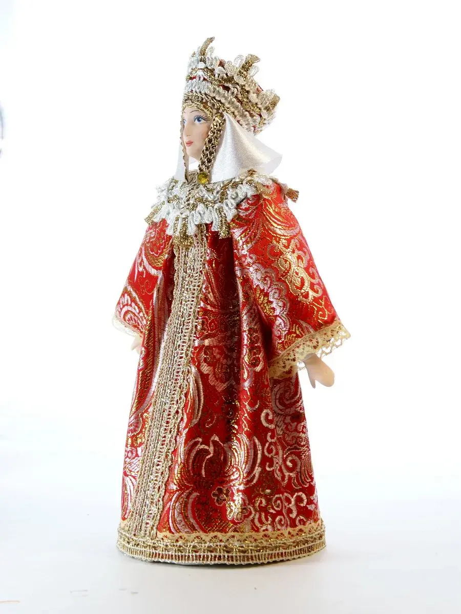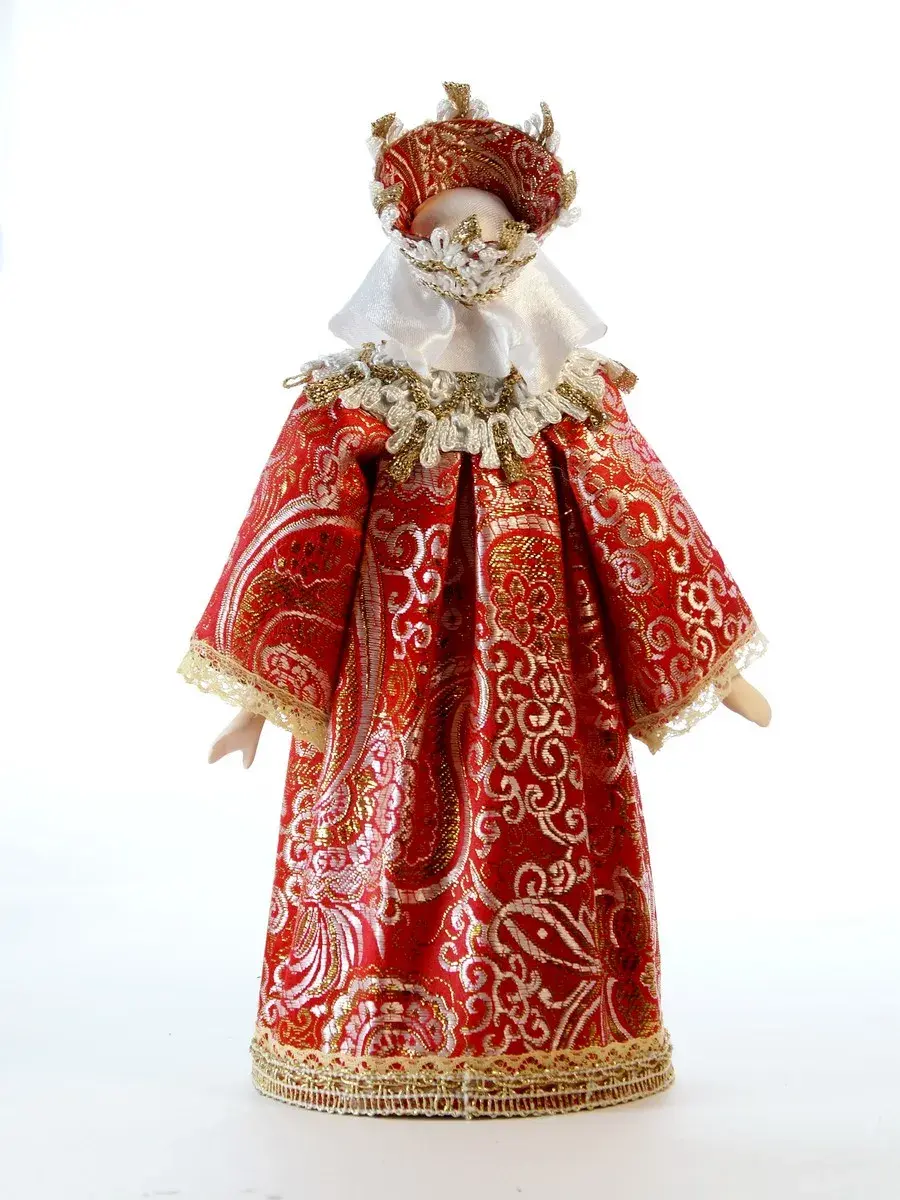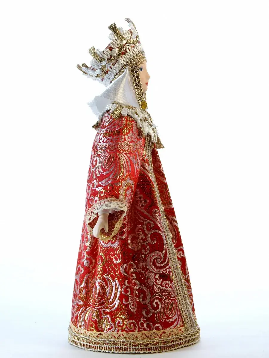Высота около 27 см, костюм текстильный (парча, атлас, тесьма, кружево) несъемный, в основании - конус из плотного картона, обтянутый тканью, ног у данной модели не предусмотрено. Поставляется в крафтовой транспортировочной коробке с фирменным логотипом, зип-пакете и пузырчатой плёнке.