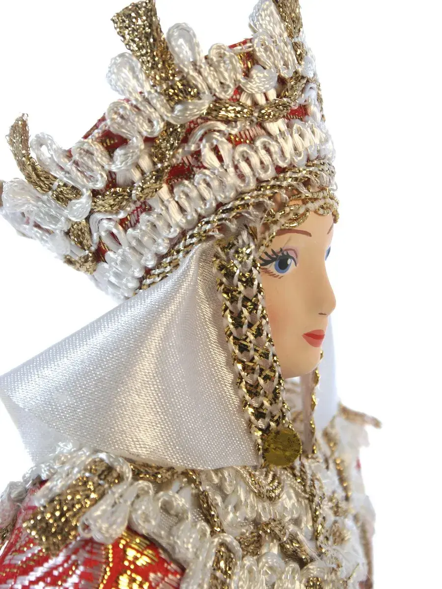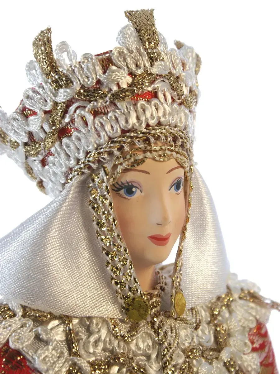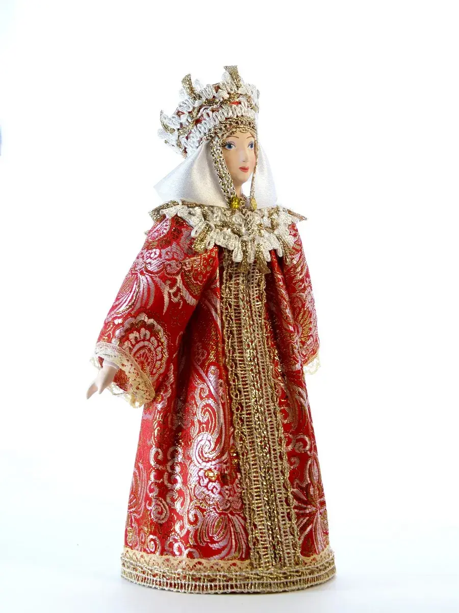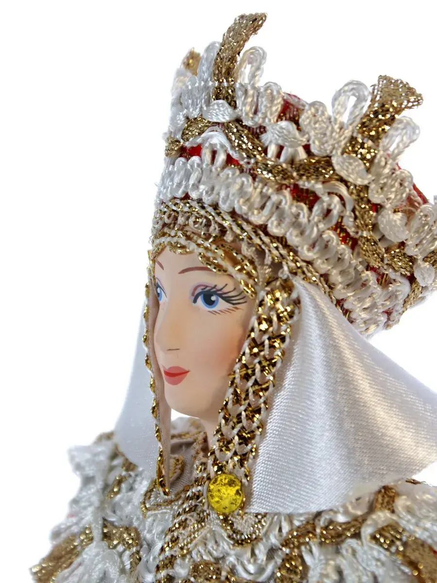 Высота около 27 см, костюм текстильный (парча, атлас, тесьма, кружево) несъемный, в основании - конус из плотного картона, обтянутый тканью, ног у данной модели не предусмотрено. Поставляется в крафтовой транспортировочной коробке с фирменным логотипом, зип-пакете и пузырчатой плёнке.