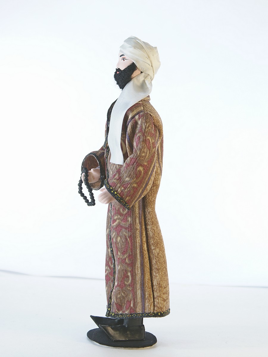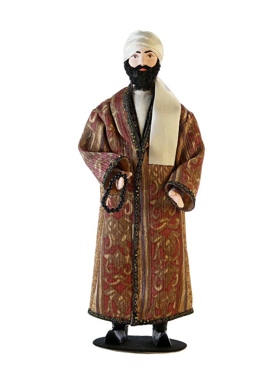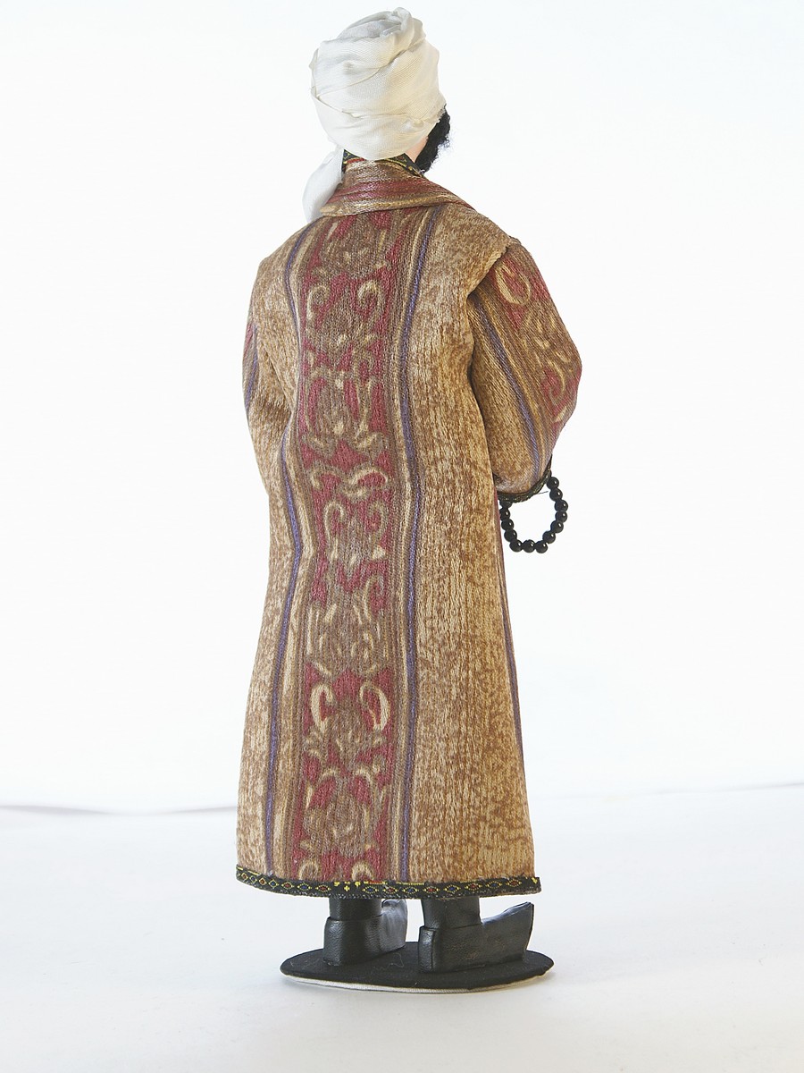 Кукла Потешного промысла на подставке - Узбек в традиционном костюме. Материал фарфор, текстиль. Высота 26 см. Артикул 0756\n\nДля подарка, украшения интерьера, в коллекцию.\nКукла создана в Санкт-Петербурге профессиональными мастерами и художниками из качественных, безопасных материалов российского производства.\n\nГолова, торс, руки и ноги куклы выполнены из фарфора в собственной керамической мастерской (горячий обжиг при температуре +1200 градусов Цельсия), расписана акриловыми/темперными красками.\n\nВысота около 26 см, костюм текстильный (тесьма, кружево) несъемный, подставка несъемная.\nПоставляется в крафтовой транспортировочной коробке с фирменным логотипом, зип-пакете и пузырчатой плёнке.\n\n