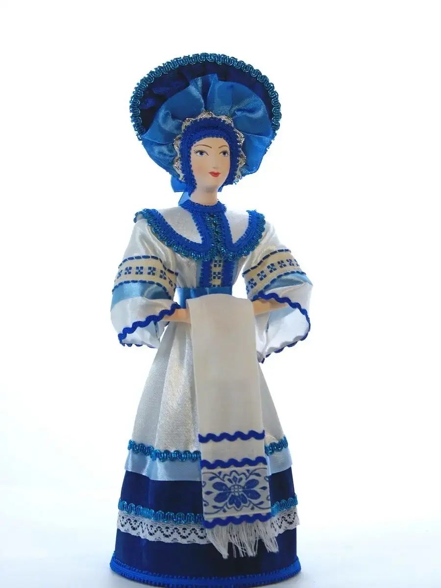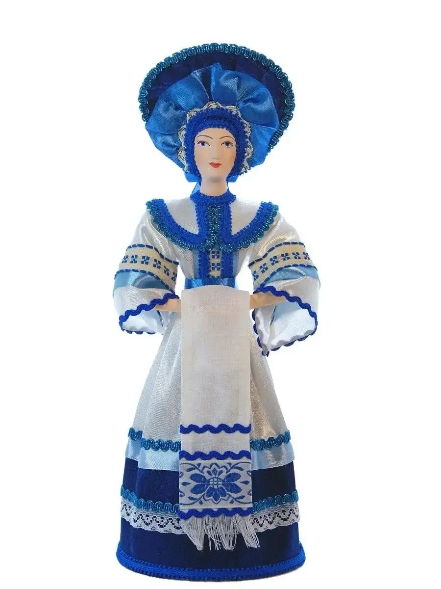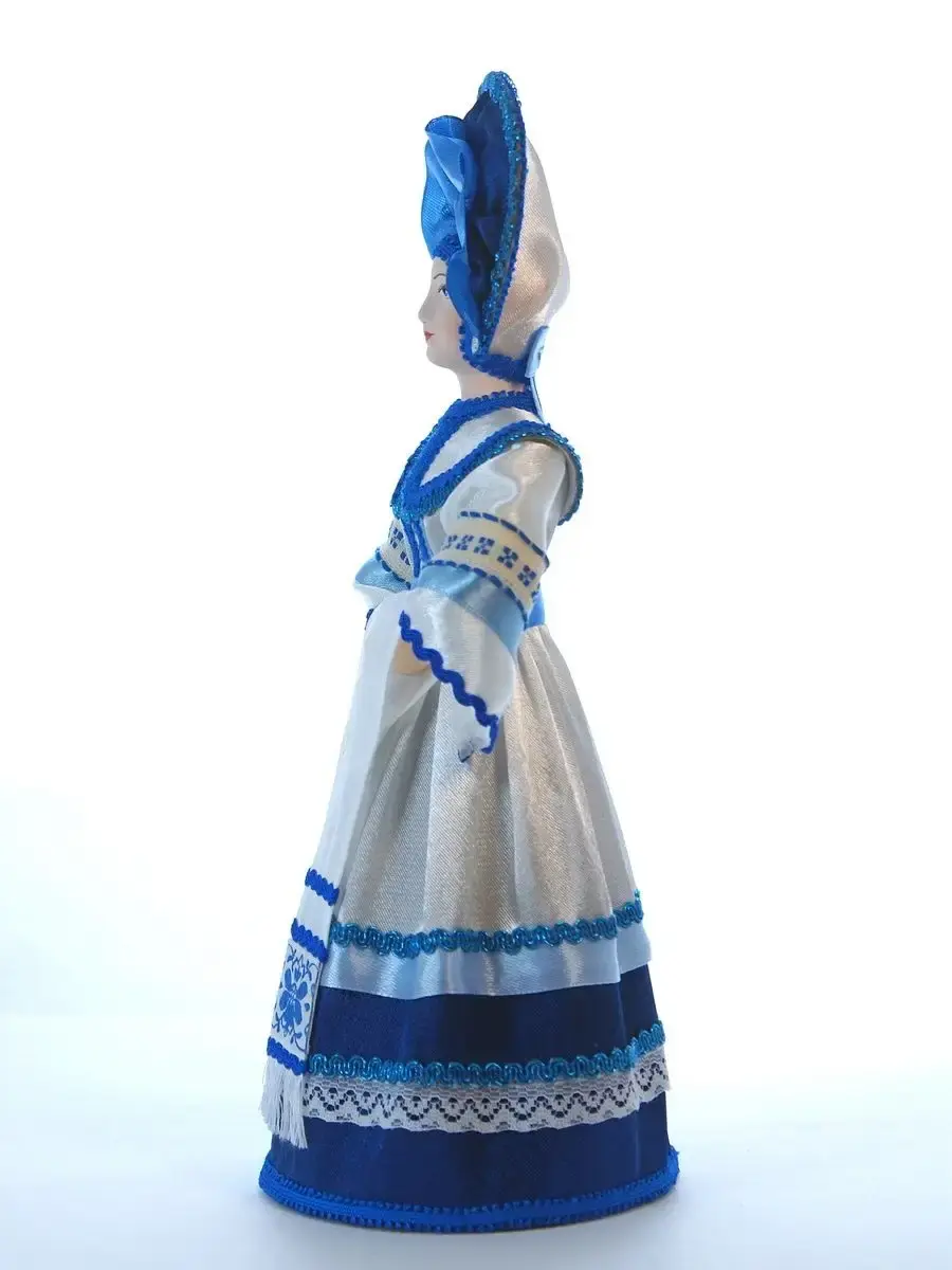 Кукла Потешного промысла в женском костюме по мотивам Гжельского промысла.