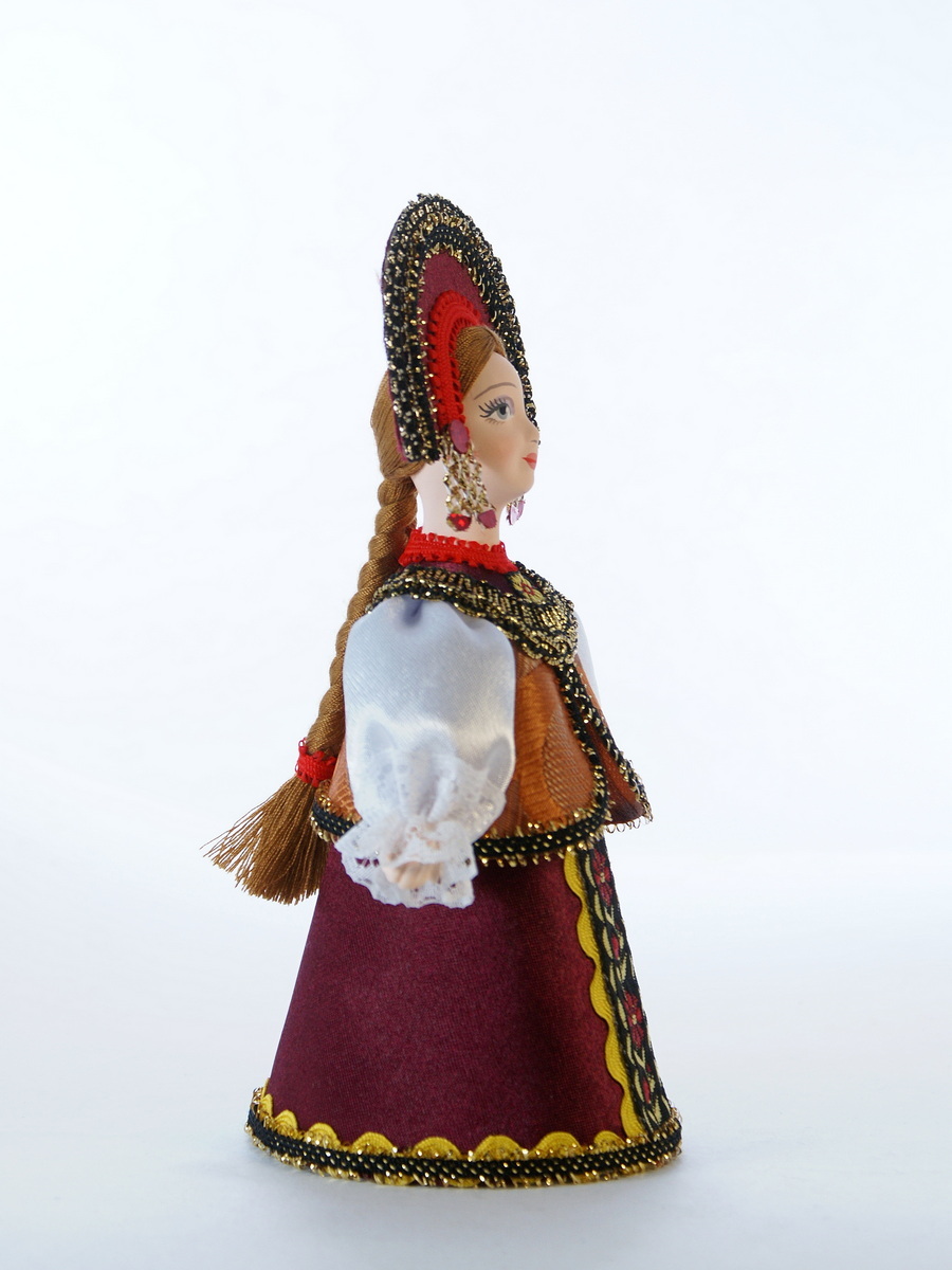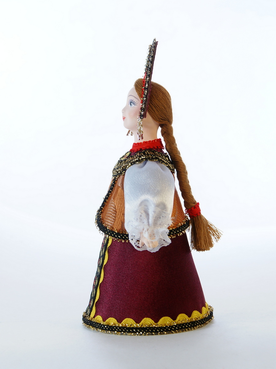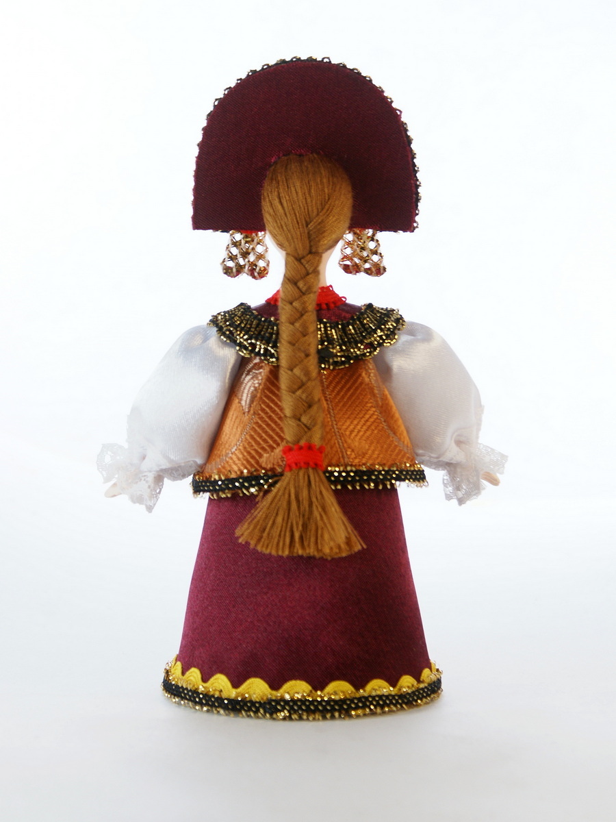 Высота около 17 см, костюм текстильный (ситец, атлас, тесьма) несъемный, в основании – конус из плотного картона, обтянутый тканью, ног у данной модели не предусмотрено.
