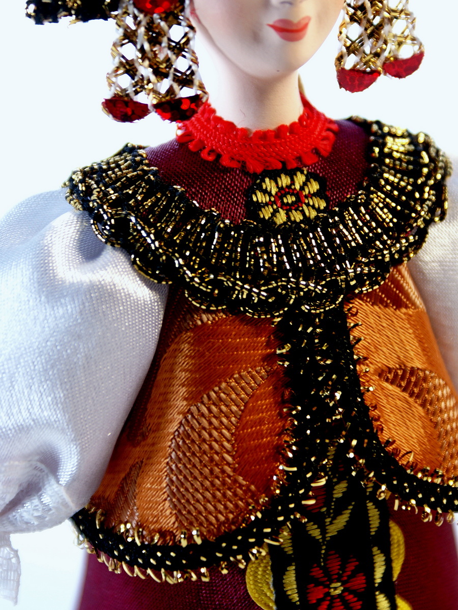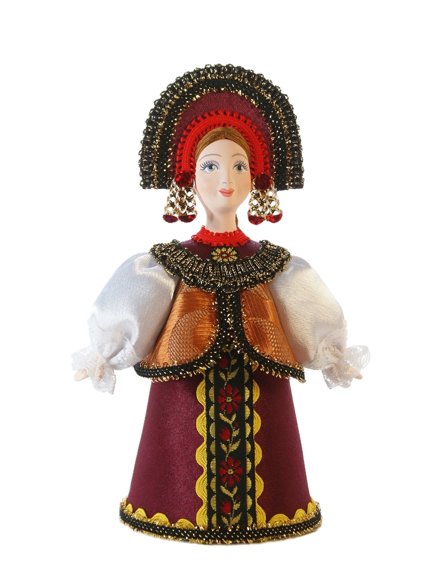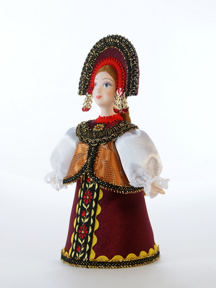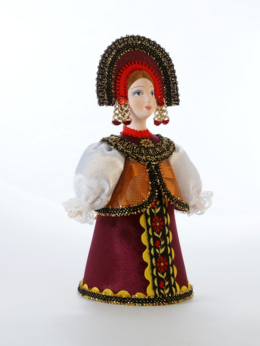Высота около 17 см, костюм текстильный (ситец, атлас, тесьма) несъемный, в основании – конус из плотного картона, обтянутый тканью, ног у данной модели не предусмотрено.