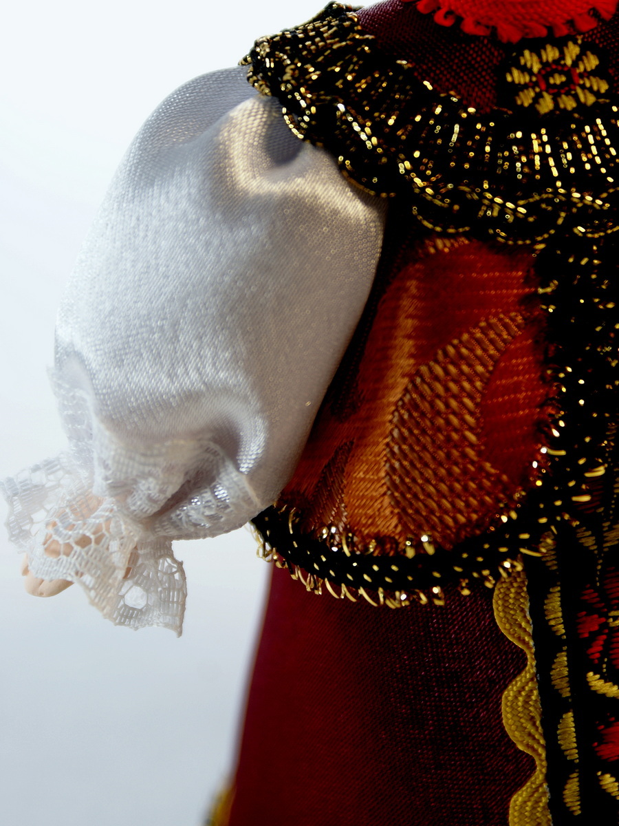 Голова, торс и руки куклы выполнены из фарфора в собственной керамической мастерской (горячий обжиг при температуре +1200 градусов Цельсия), расписана акриловыми/темперными красками.