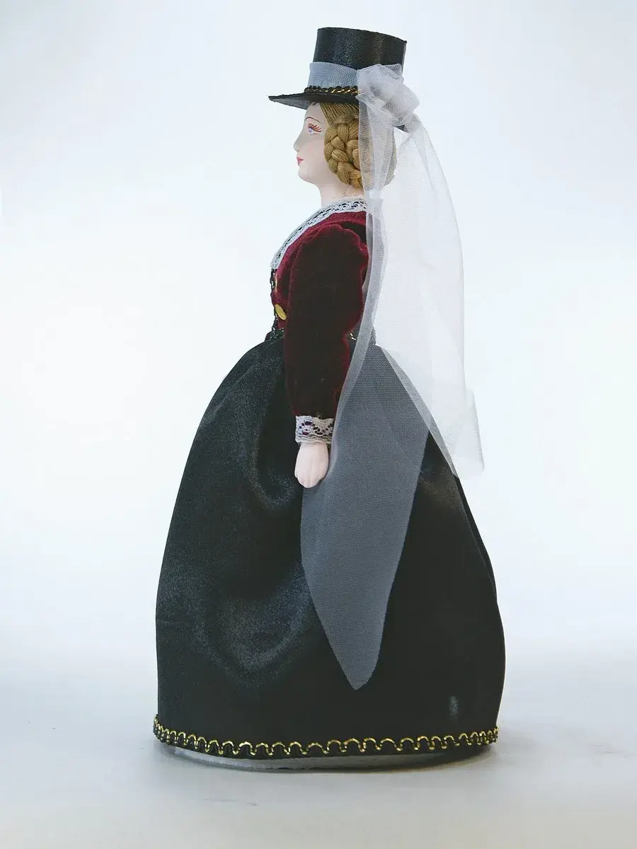 Голова и руки из бисквитного фарфора, отлиты и обожжены в собственной керамической мастерской при температуре +1200 градусов Цельсия. Расписаны вручную темперными красками. В основании конус из папье-маше (картон, ПВА, хлопчатобумажная ткань). Ног у данной модели не предусмотрено. Костюм несъемный текстильный: атлас, кружево, атласные ленты, тесьма.