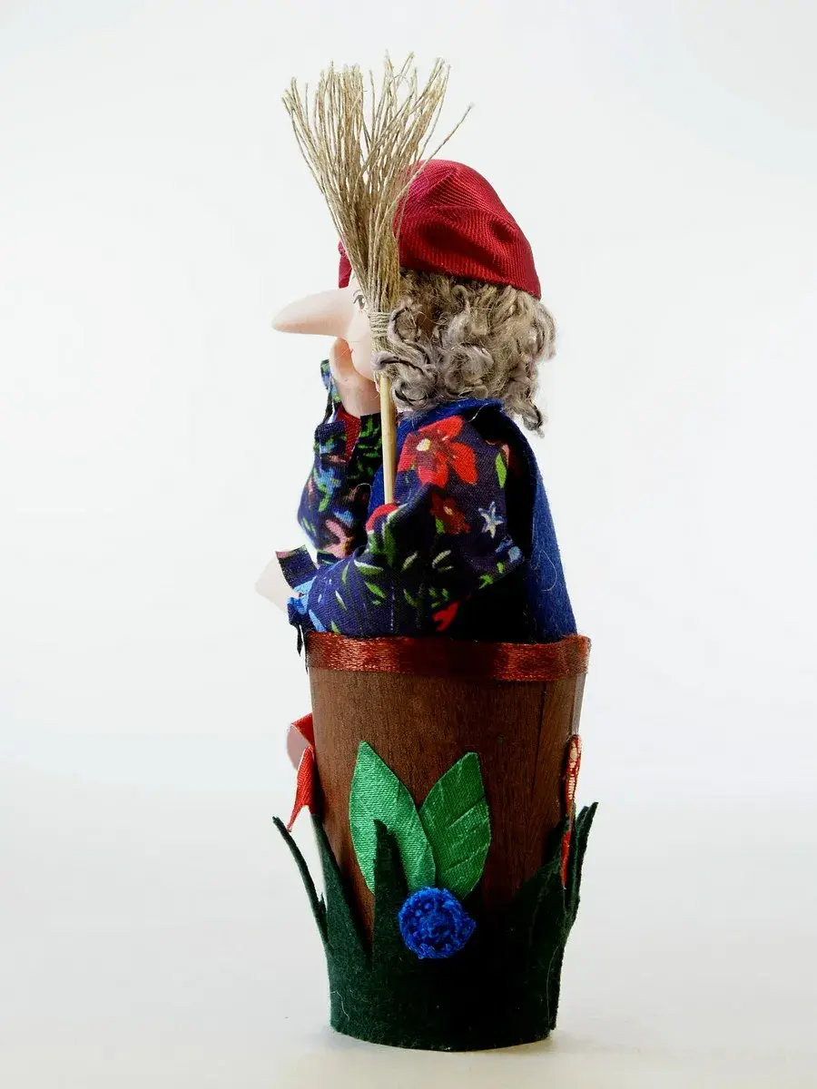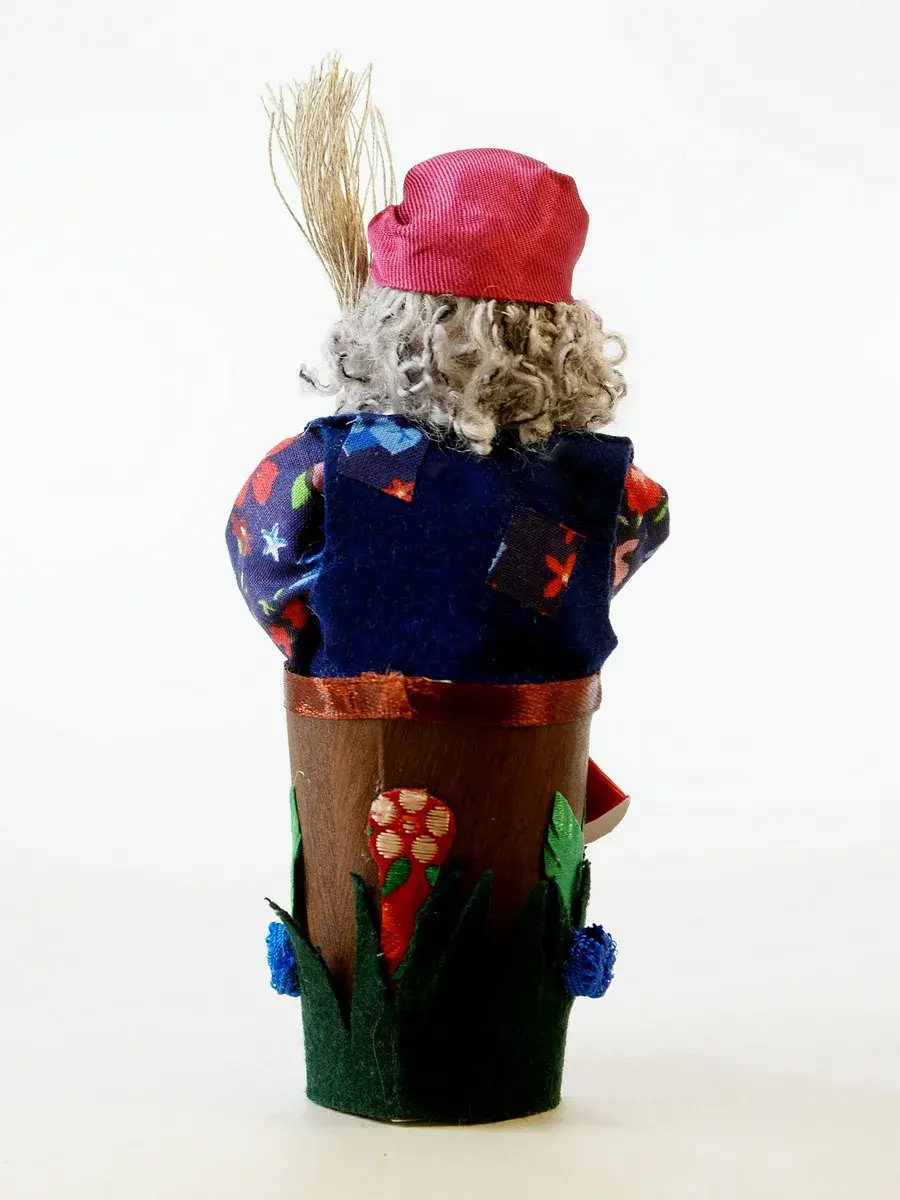 Голова и руки из бисквитного фарфора, отлиты и обожжены в собственной керамической мастерской при температуре +1200 градусов Цельсия. Расписаны вручную темперными красками. В основании конус из папье-маше (картон, ПВА, хлопчатобумажная ткань). Костюм несъемный текстильный