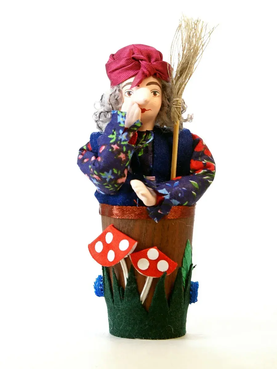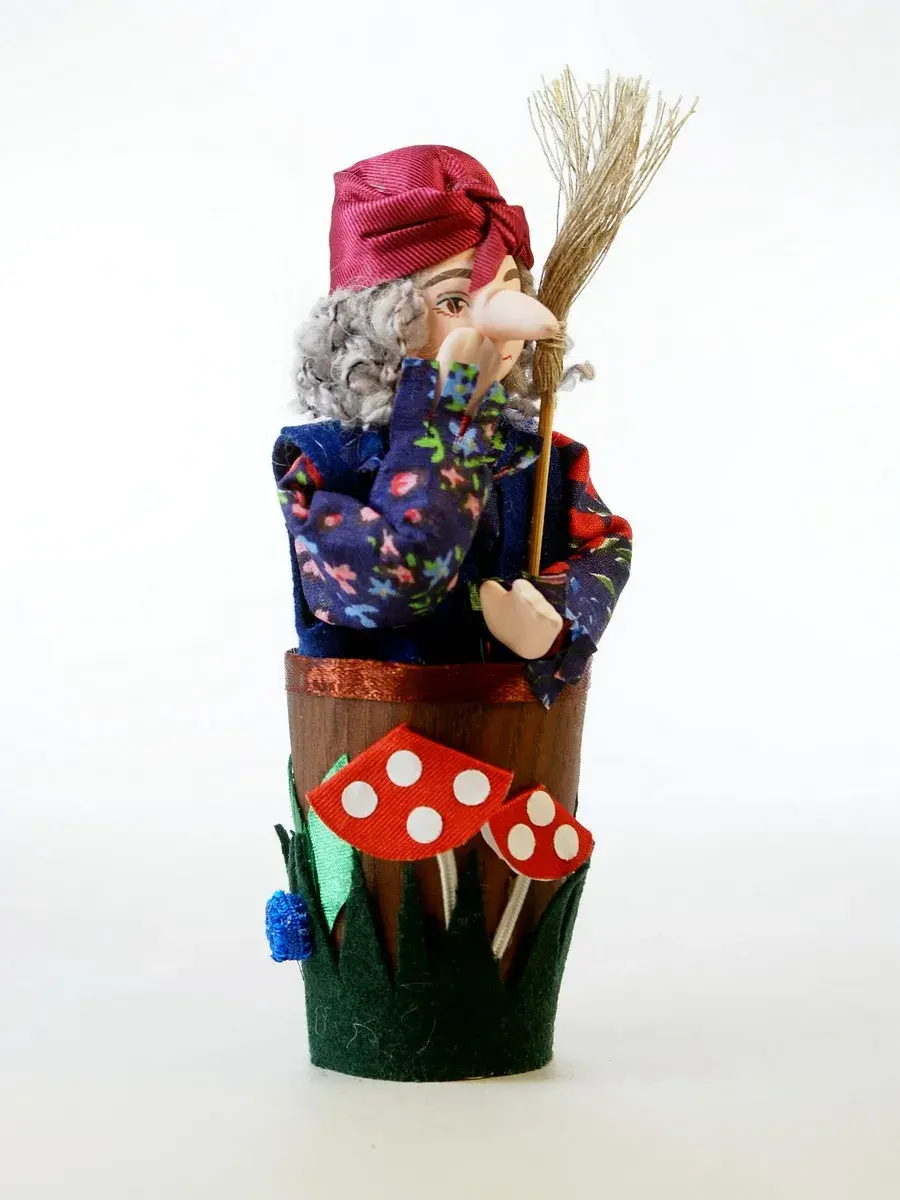 Фарфоровая коллекционная малотиражная кукла Баба-Яга в ступе. Сделана в Санкт-Петербурге мастерами предприятия народных художественных промыслов «Потешный промысел». Ручная работа.