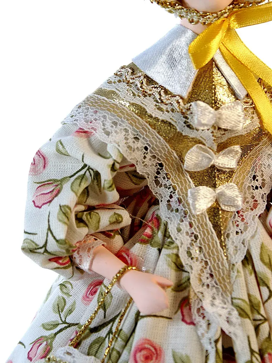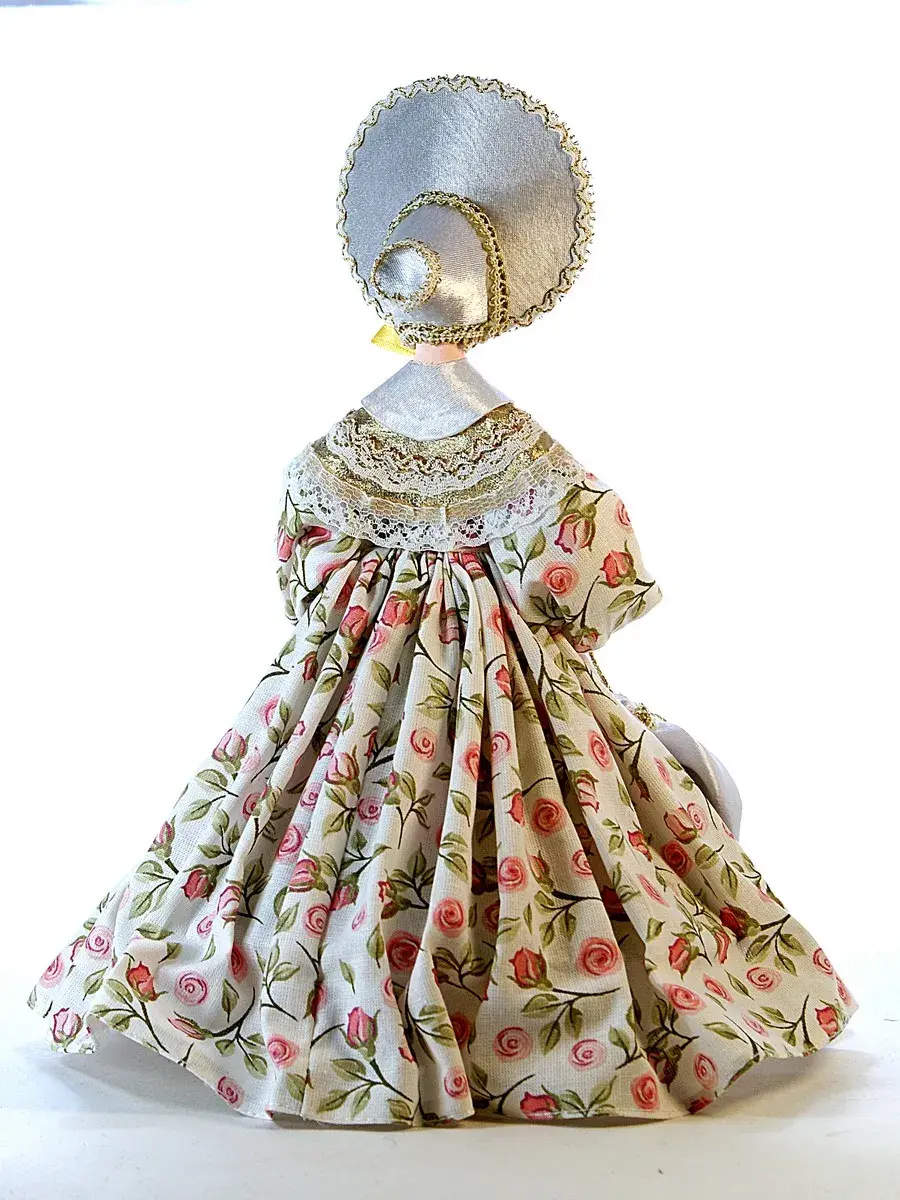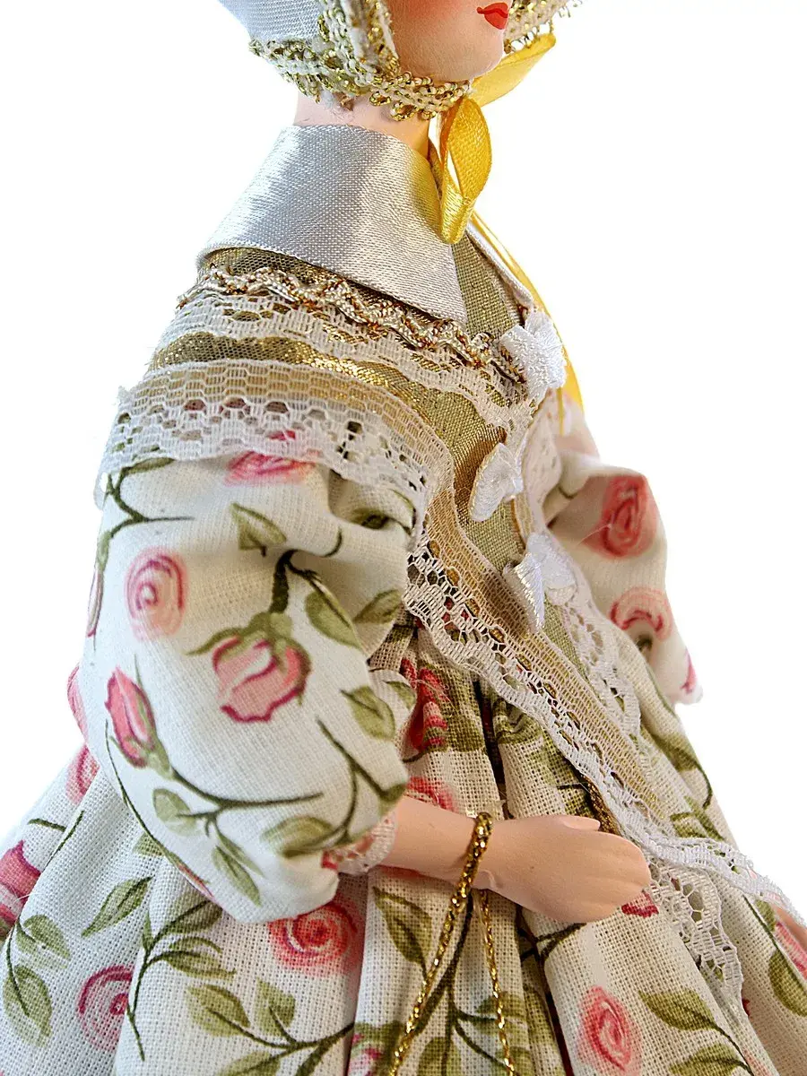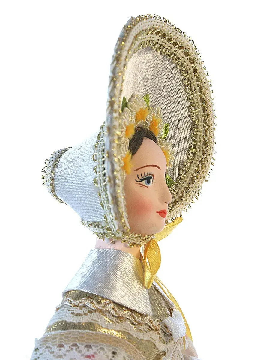 Высота около 28 см, костюм текстильный (тесьма, кружево) несъемный, в основании - конус из плотного картона, обтянутый тканью, ног у данной модели не предусмотрено.