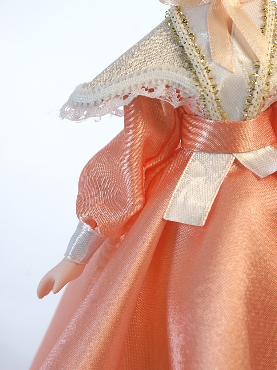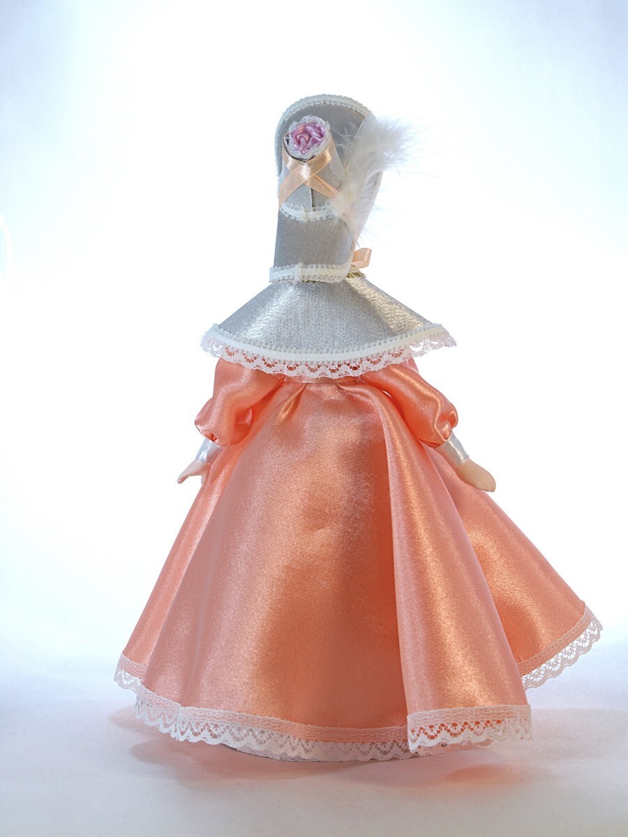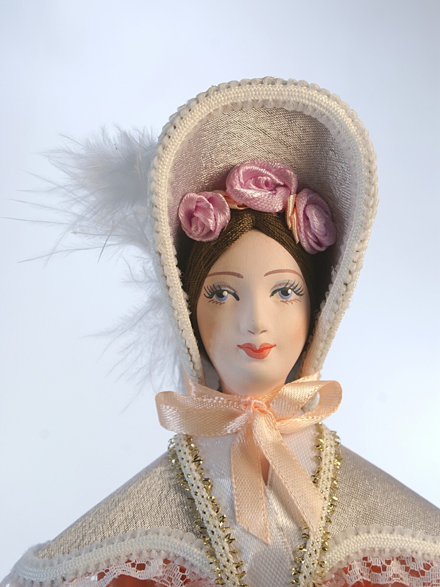 Голова и руки из бисквитного фарфора, отлиты и обожжены в собственной керамической мастерской при температуре +1200 градусов Цельсия. Расписаны вручную темперными красками. Костюм несъемный текстильный: креп-сатин, кружево, атласные ленты, нитки, перья, тесьма. В основании картонный конус, обтянутый хлопчатобумажной тканью.