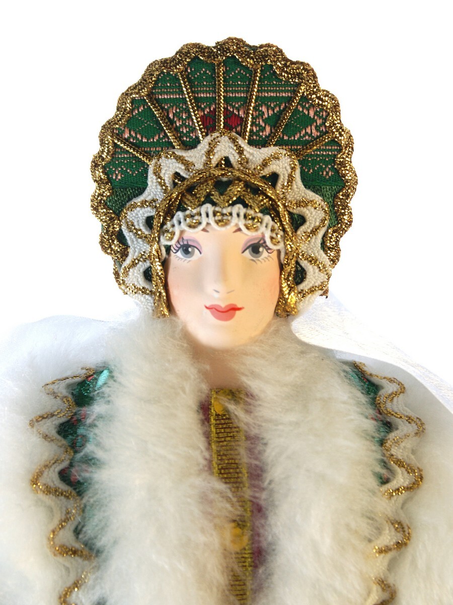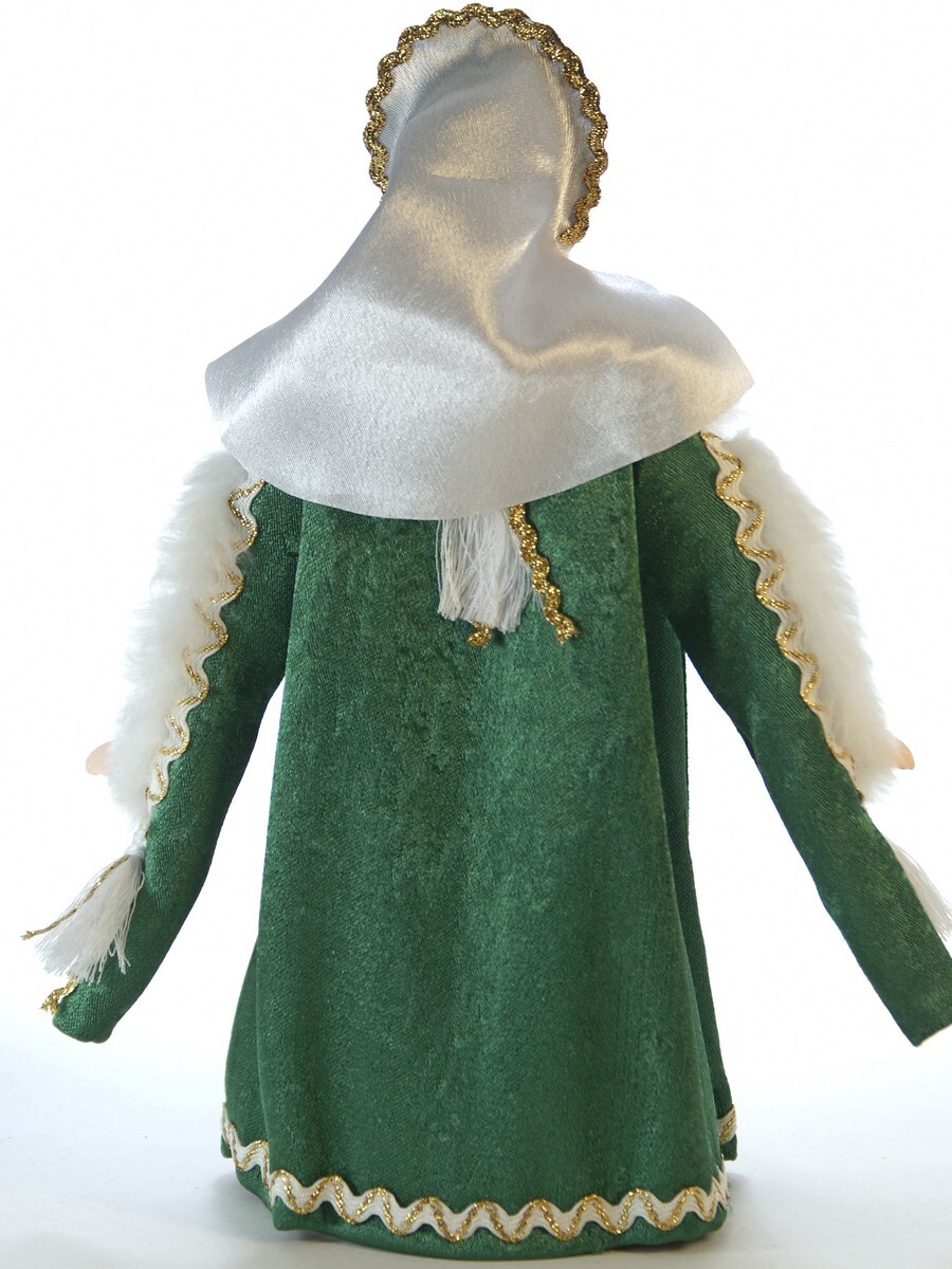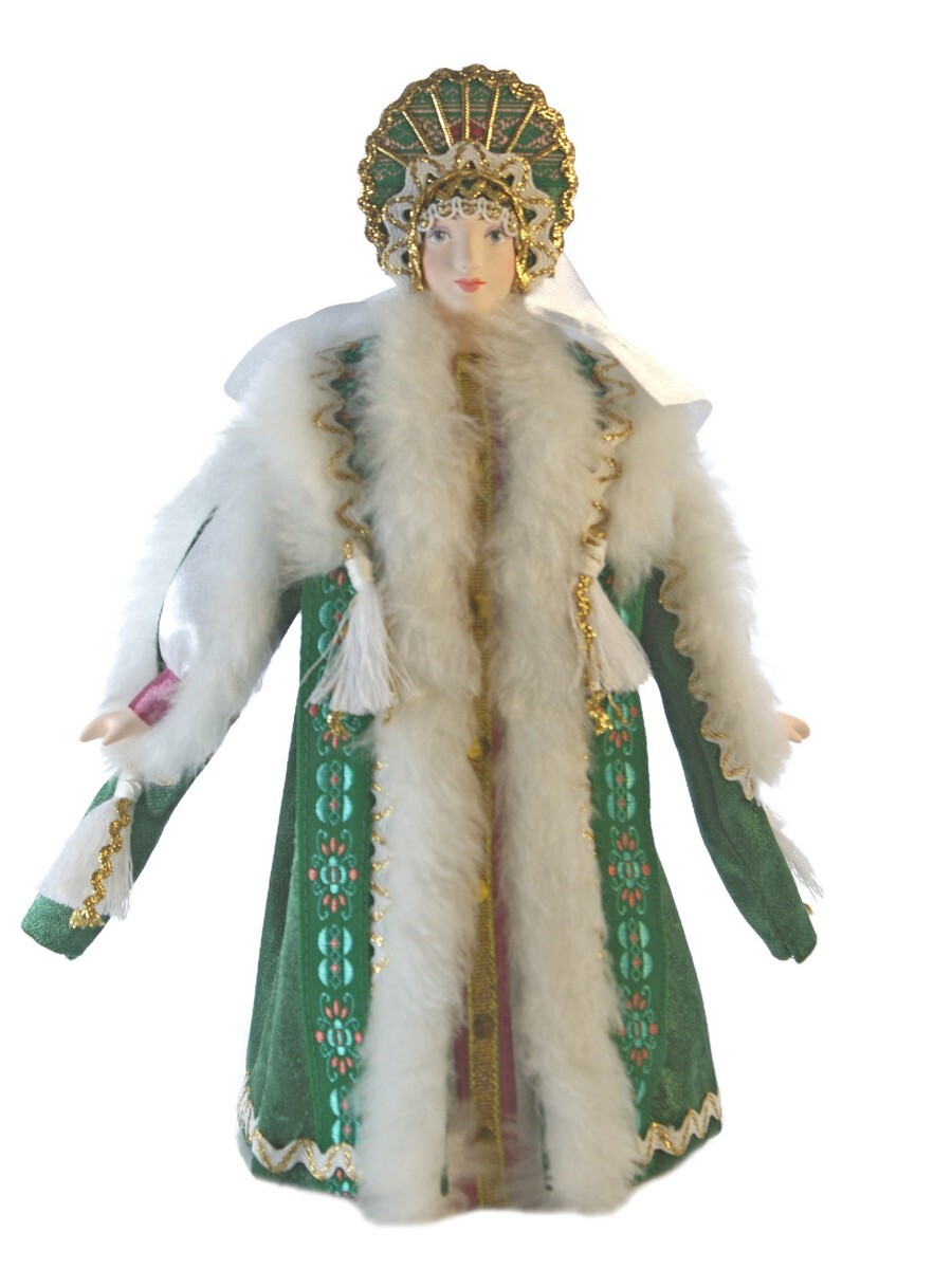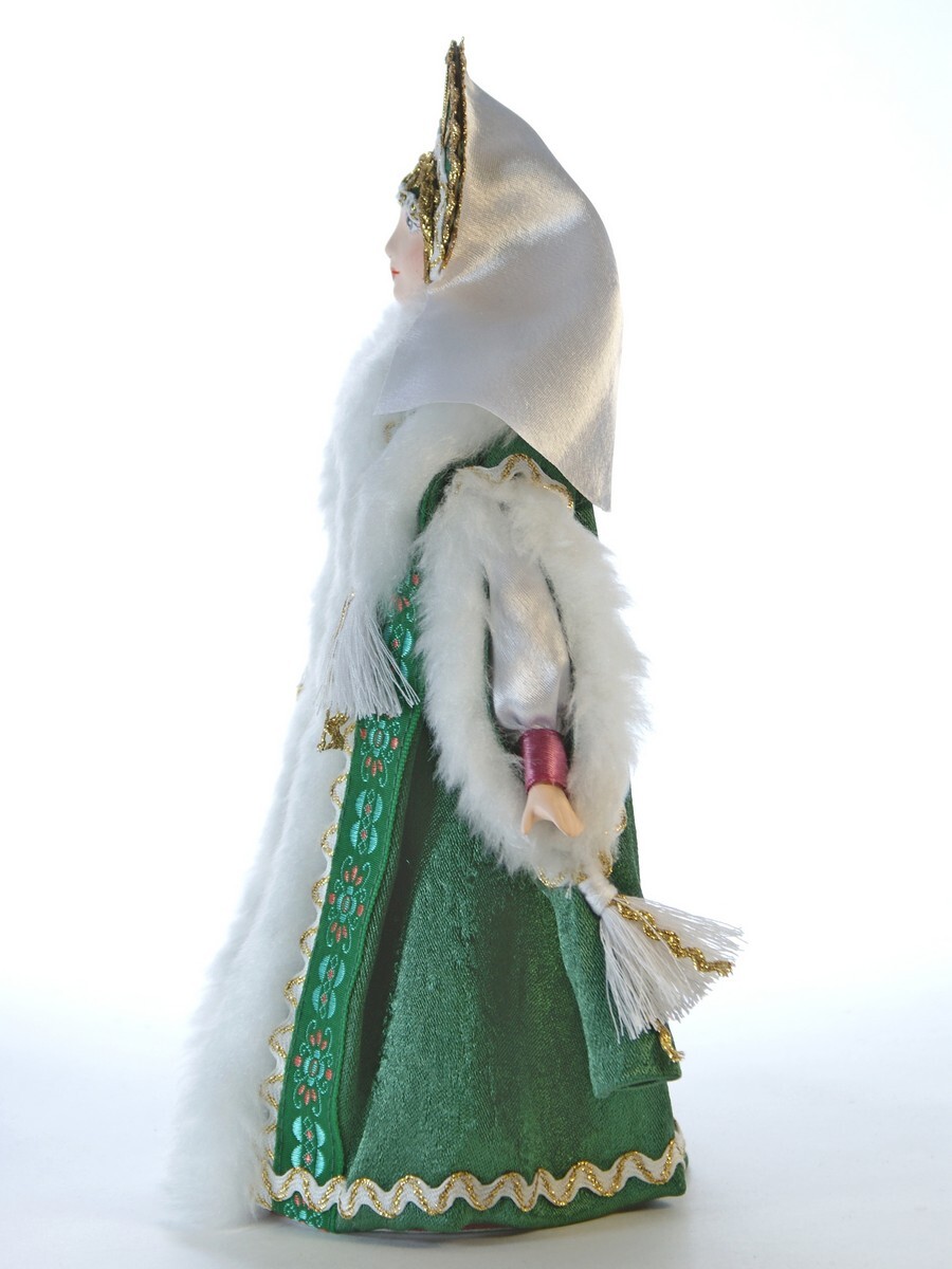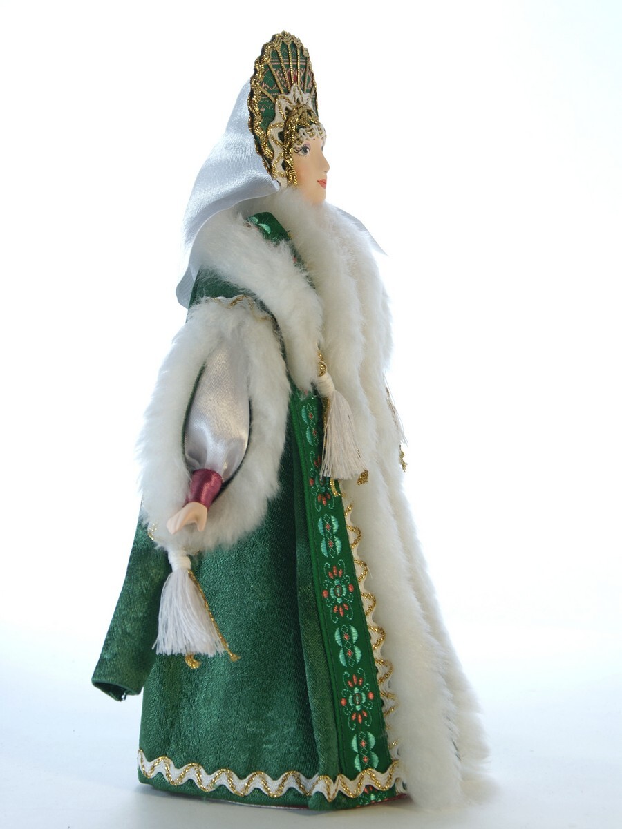 \nВысота около 27 см, костюм текстильный (атлас, тесьма, кружево, искусственный мех) несъемный, в основании - конус из плотного картона, обтянутый тканью, ног у данной модели не предусмотрено. Поставляется в крафтовой транспортировочной коробке с фирменным логотипом, зип-пакете и пузырчатой плёнке.