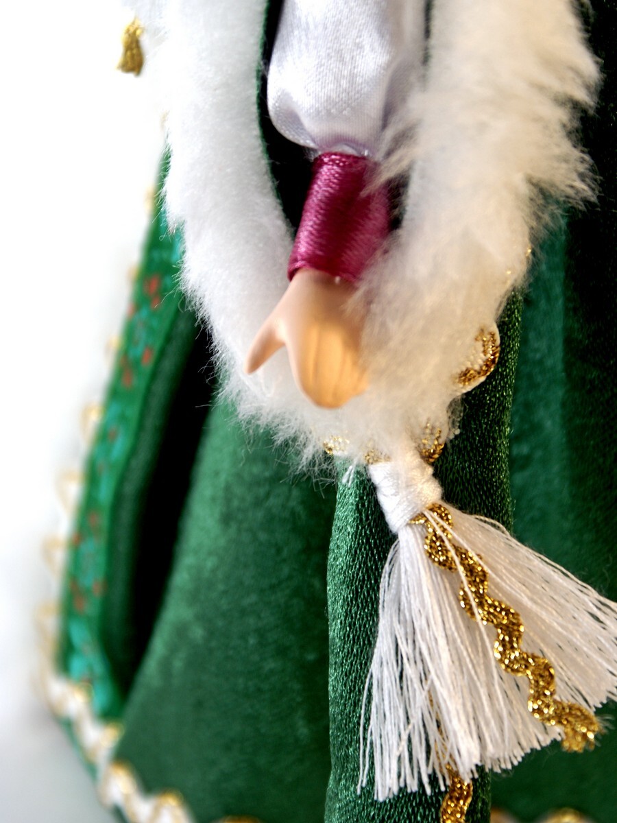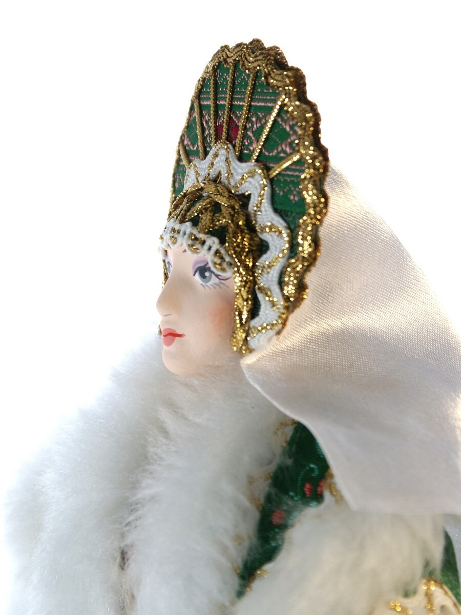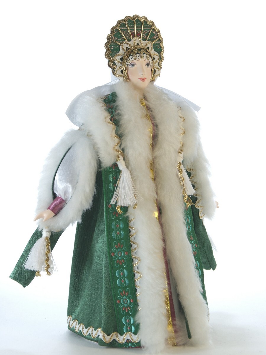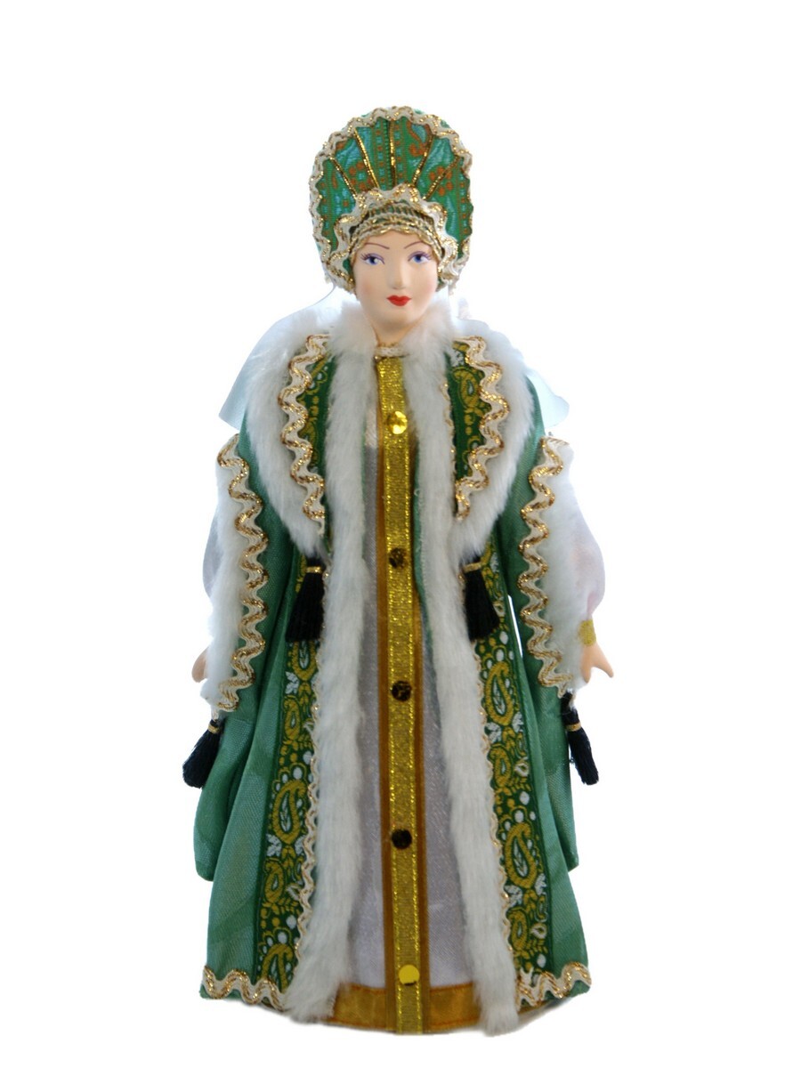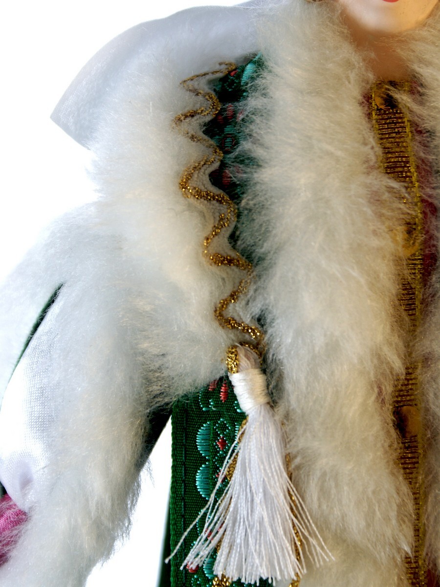 \nВысота около 27 см, костюм текстильный (атлас, тесьма, кружево, искусственный мех) несъемный, в основании - конус из плотного картона, обтянутый тканью, ног у данной модели не предусмотрено. Поставляется в крафтовой транспортировочной коробке с фирменным логотипом, зип-пакете и пузырчатой плёнке.