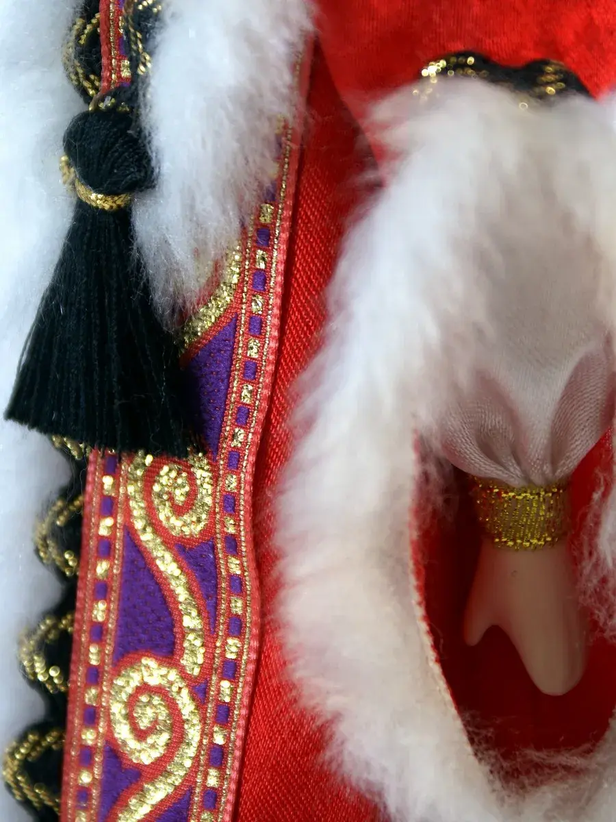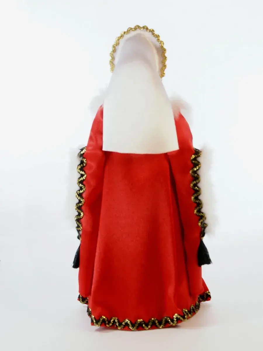 Высота около 27 см, костюм текстильный (ситец, атлас, тесьма, кружево, шифон) несъемный, в основании - конус из плотного картона, обтянутый тканью, ног у данной модели не предусмотрено. Поставляется в крафтовой транспортировочной коробке с фирменным логотипом, зип-пакете и пузырчатой плёнке.