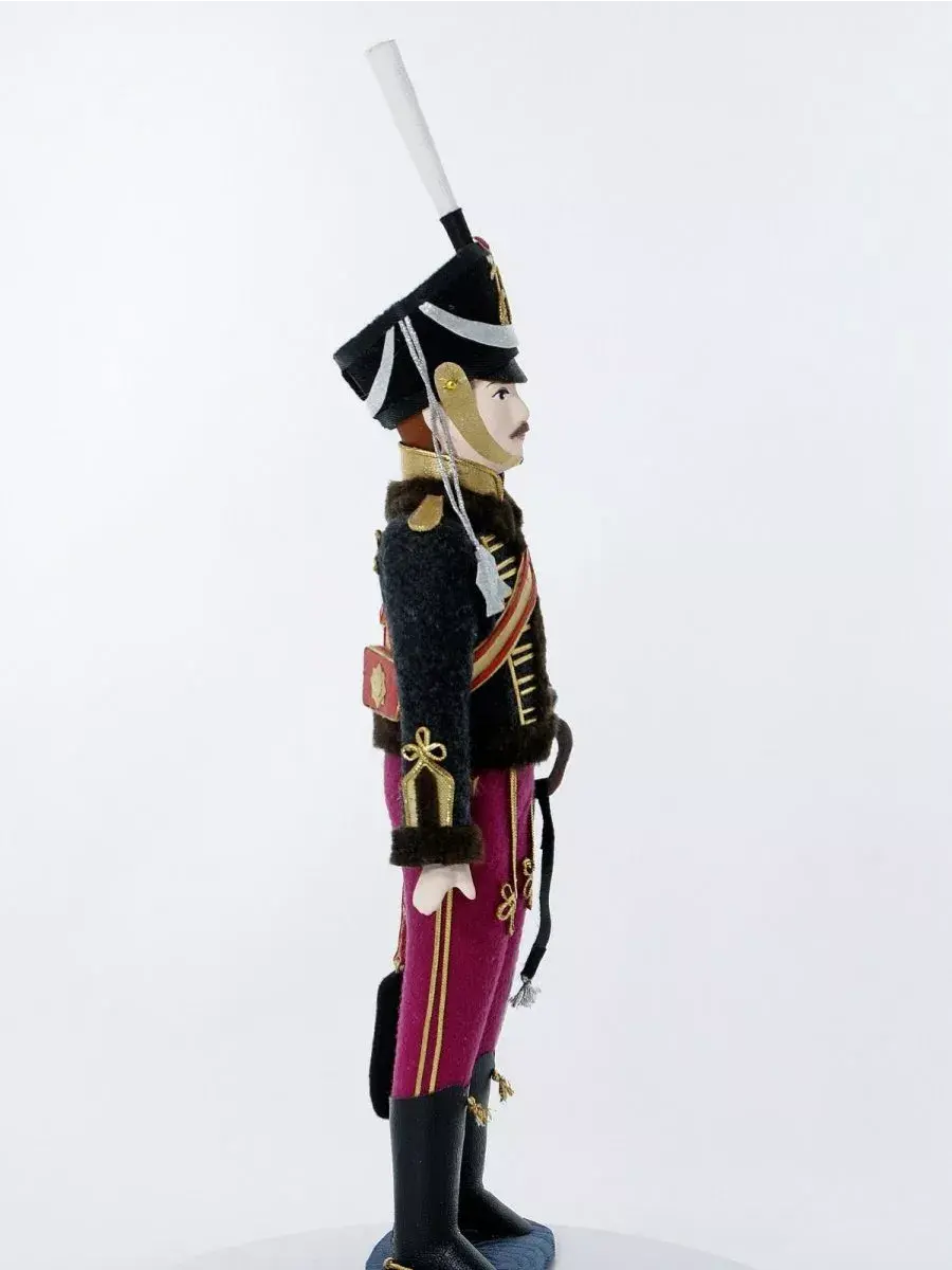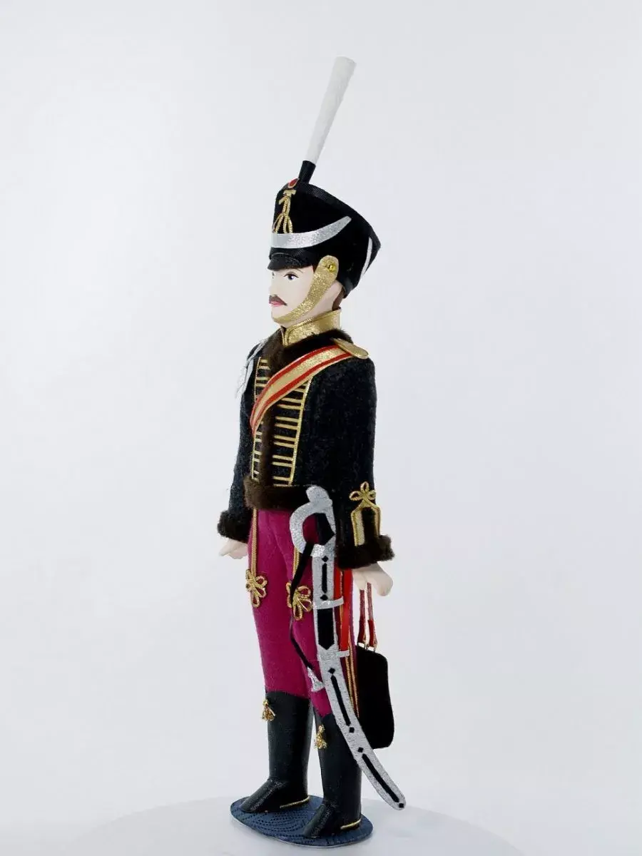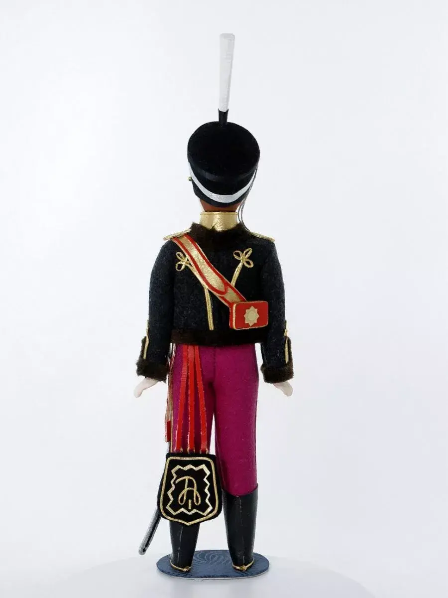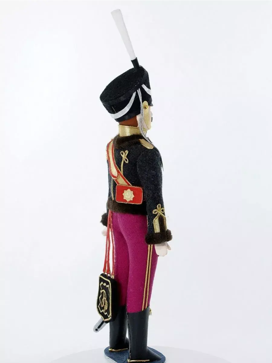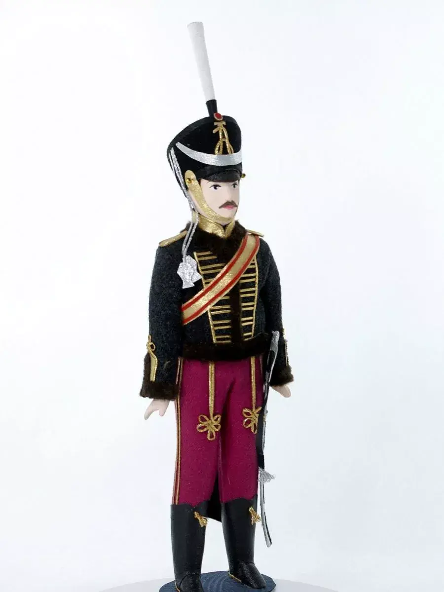 Кукла сувенирная ручной работы в военном историческом костюме начала 19 века на подставке. Гусар Иркутского полка.