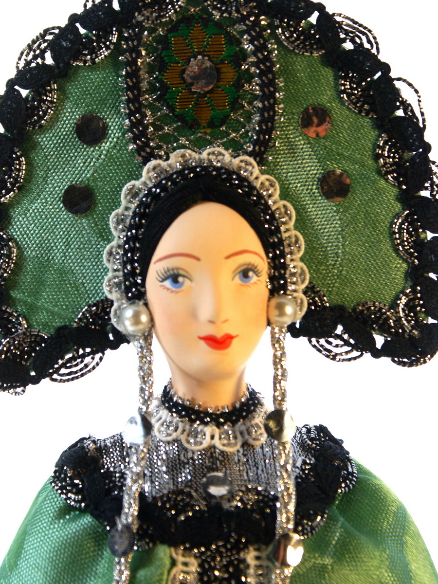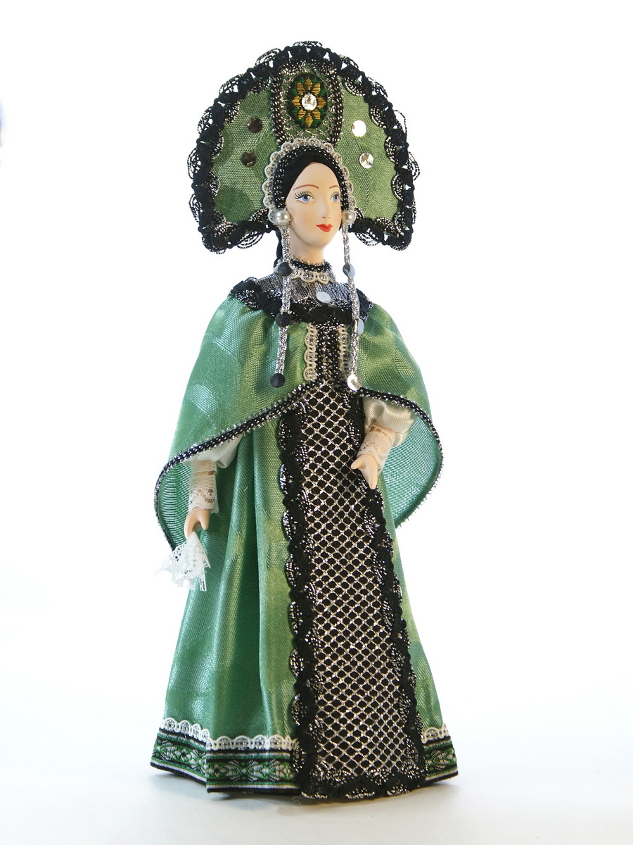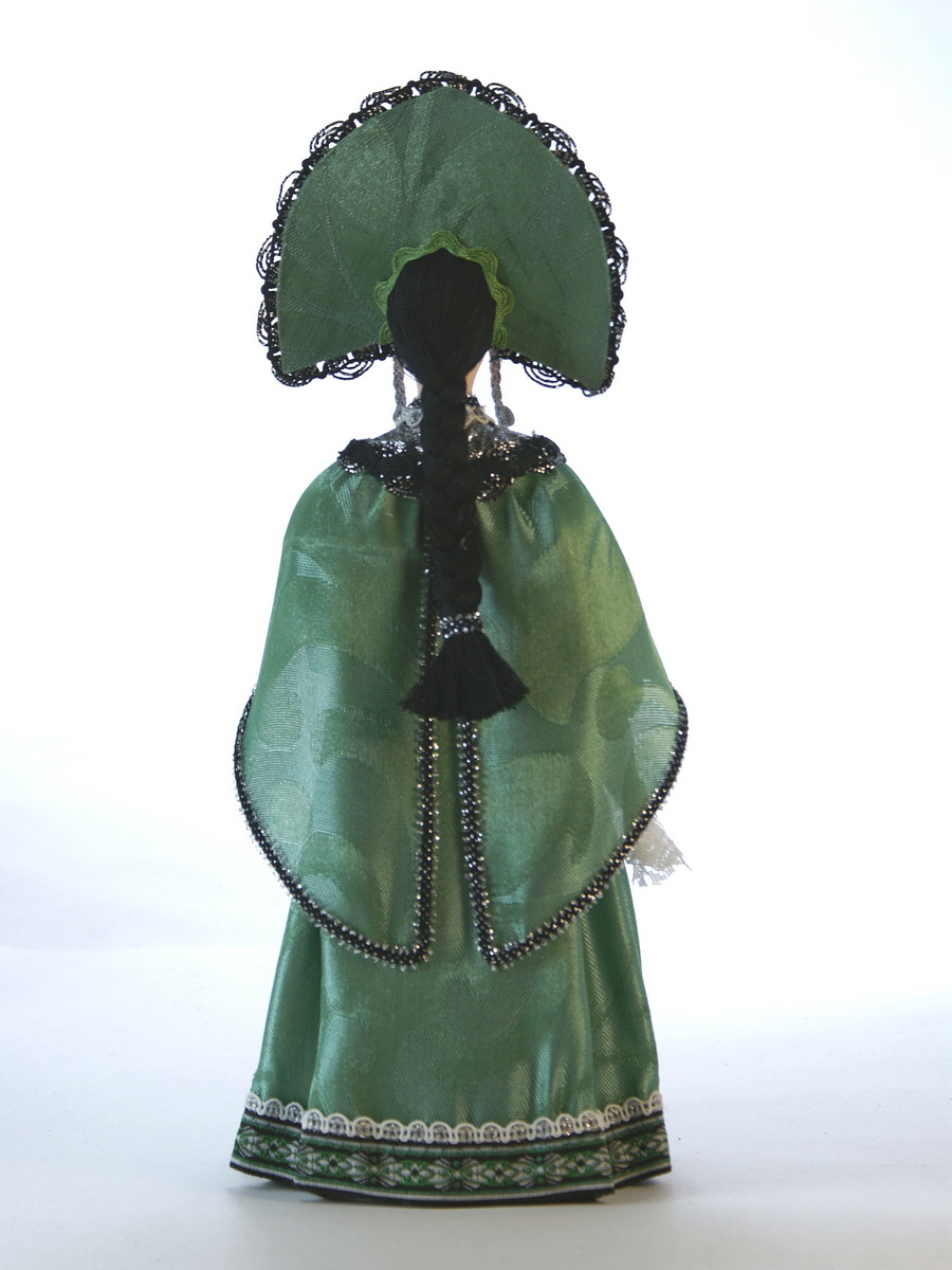 Высота — 28 см, костюм текстильный (атлас, тесьма, кружево) несъемный, в основании — конус из плотного картона, обтянутый тканью, ног у данной модели не предусмотрено.