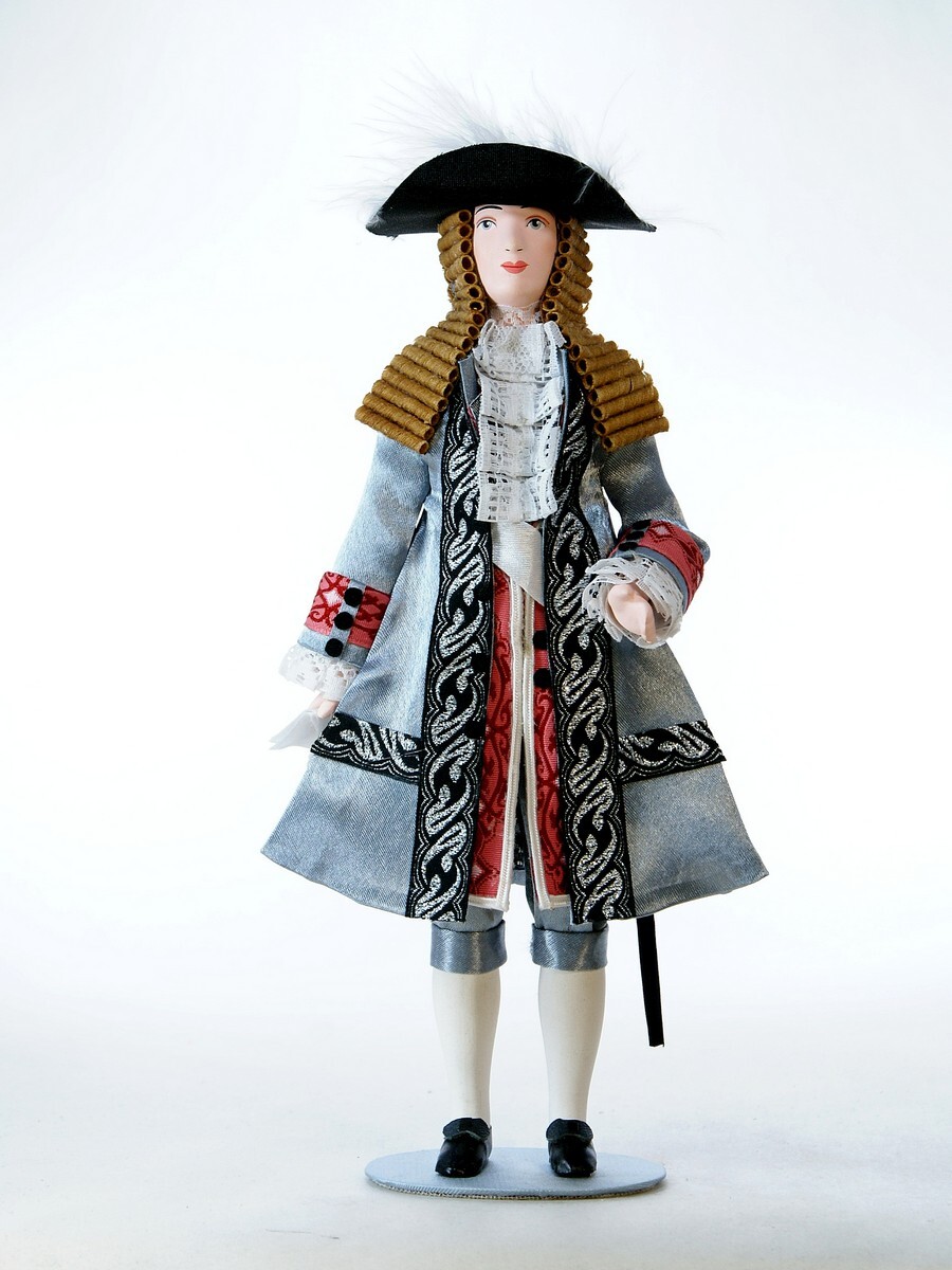 Кукла Потешного промысла в мужской придворном костюме. Франция. Конец 17 - начало 18 веков. Материал фарфор, текстиль. Высота 29 см. Модель 1643.
