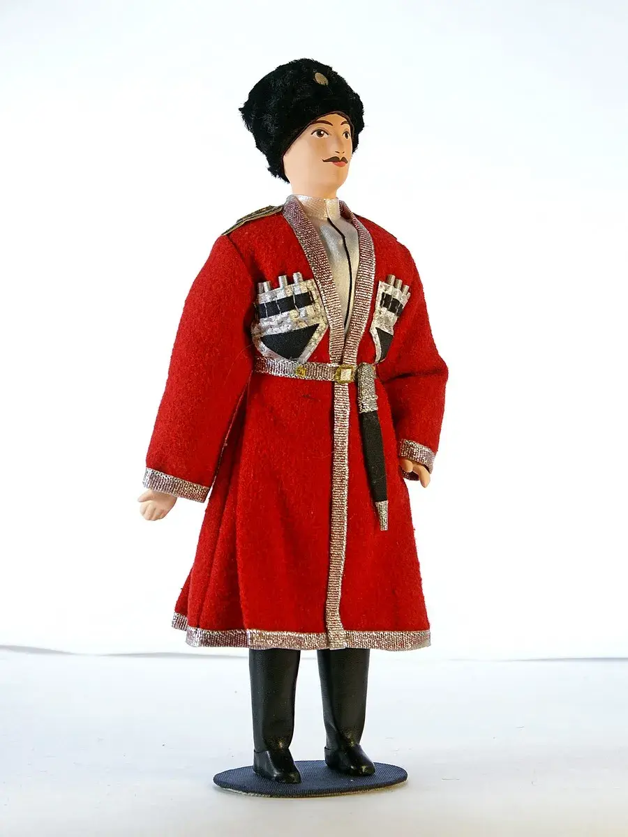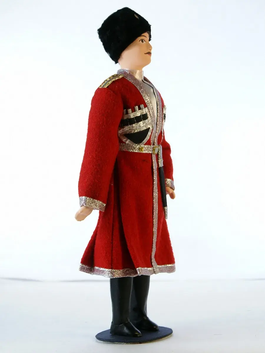 Высота около 27 см, костюм текстильный несъемный, в основании - конус из плотного картона, обтянутый тканью, ног у данной модели не предусмотрено.