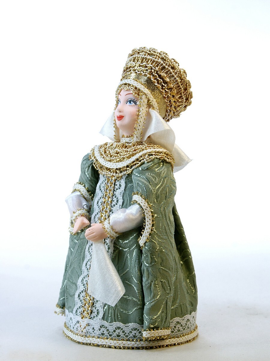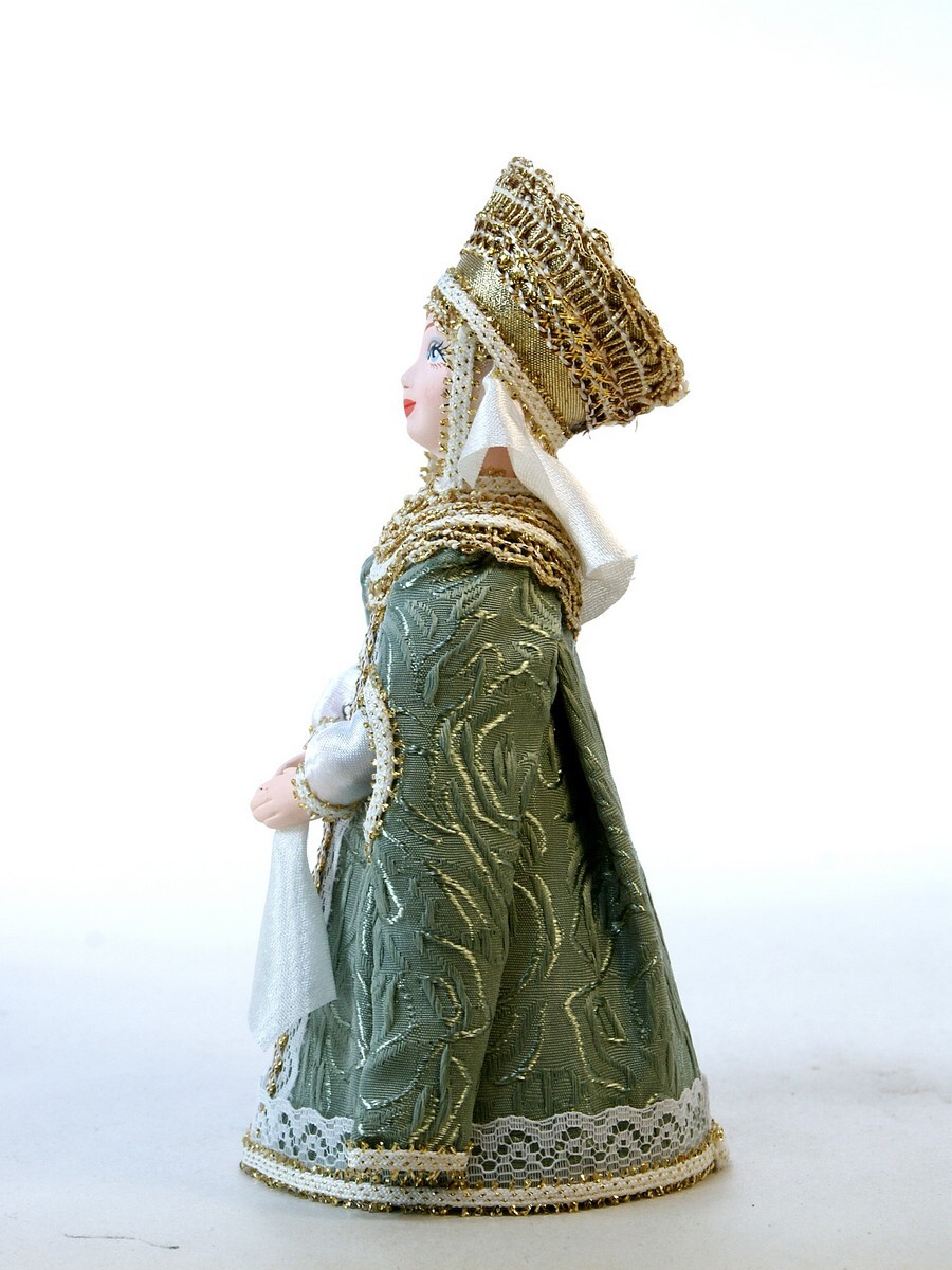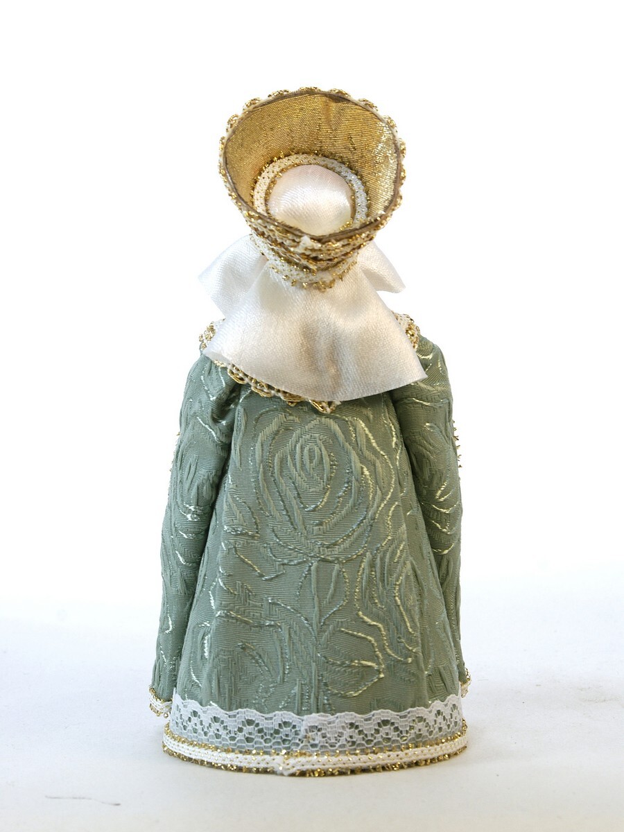 Голова и руки из бисквитного фарфора, отлиты и обожжены в собственной керамической мастерской при температуре +1200 градусов Цельсия. Расписаны вручную темперными красками. В основании конус из папье-маше (картон, ПВА, хлопчатобумажная ткань). Костюм несъемный текстильный. Высота 17 см.