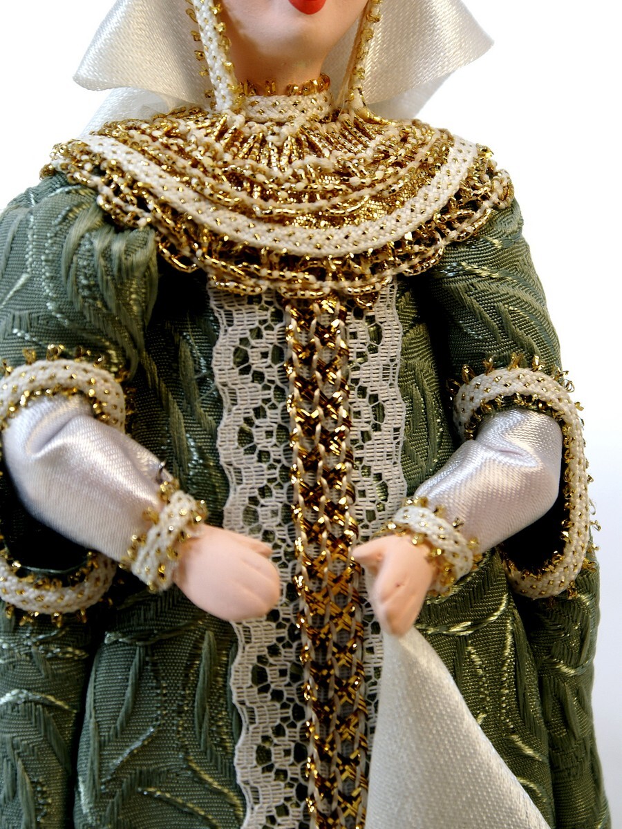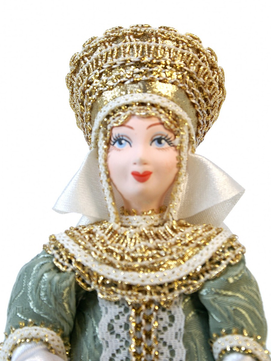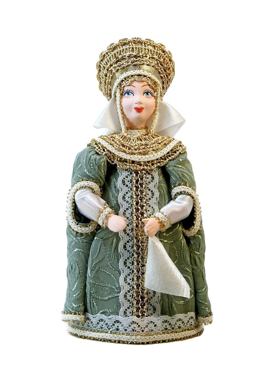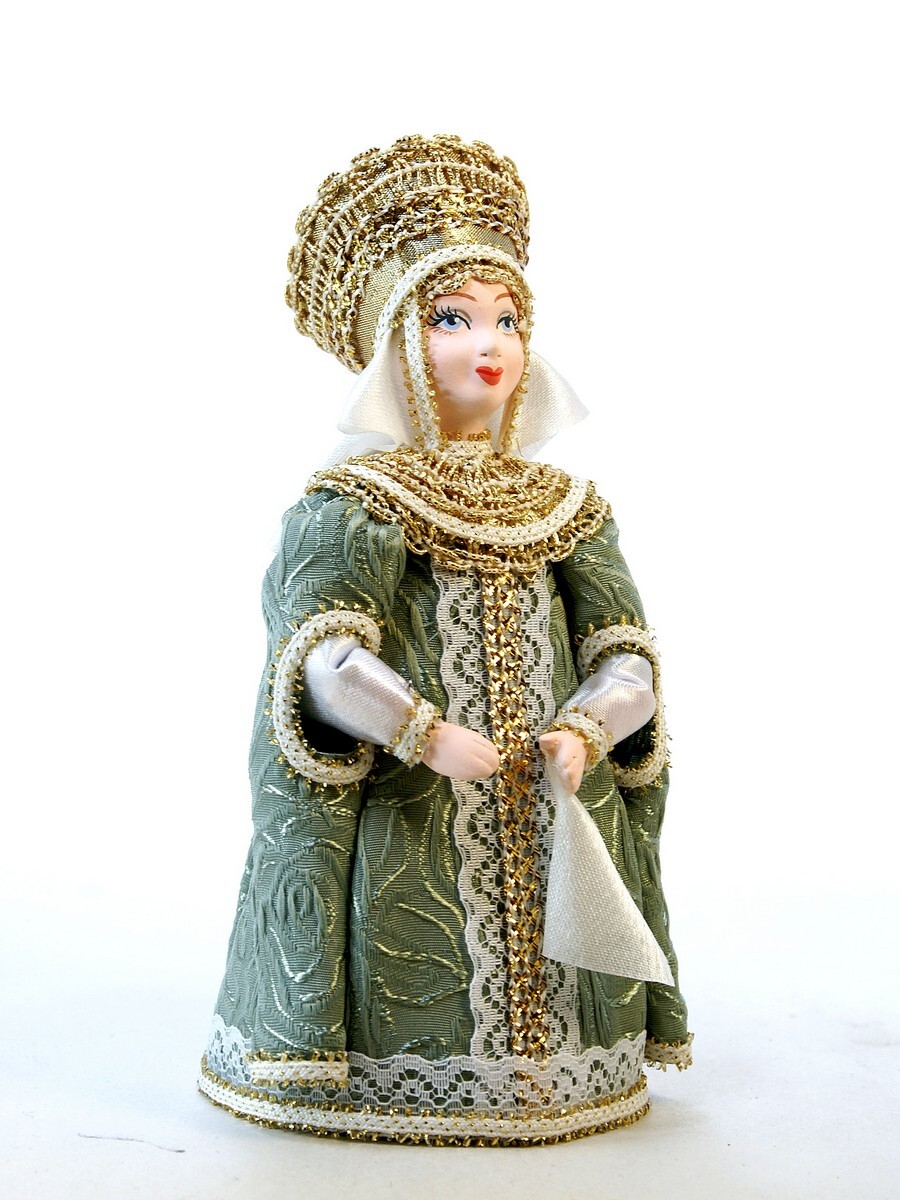 Голова и руки из бисквитного фарфора, отлиты и обожжены в собственной керамической мастерской при температуре +1200 градусов Цельсия. Расписаны вручную темперными красками. В основании конус из папье-маше (картон, ПВА, хлопчатобумажная ткань). Костюм несъемный текстильный. Высота 17 см.