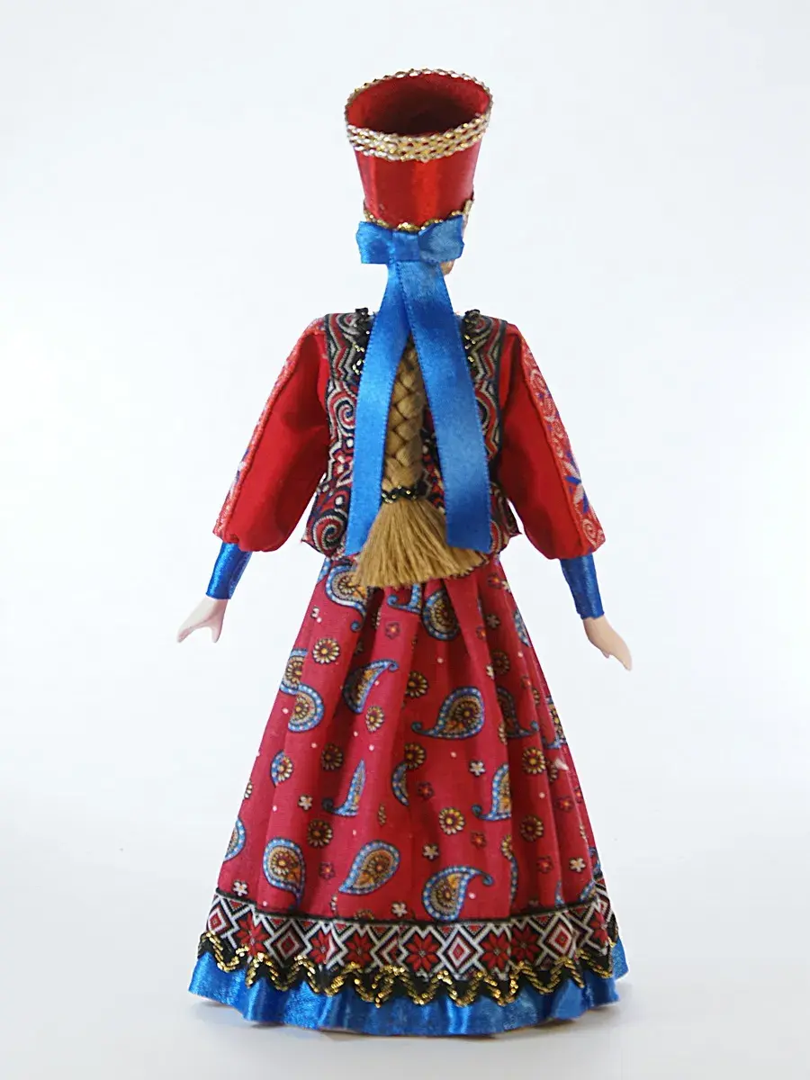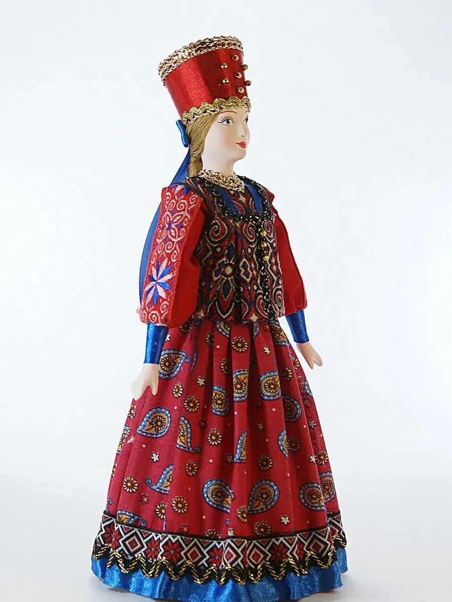 Кукла сувенирная фарфоровая, коллекционная ручной работы в русском девичьем национальном праздничном костюме Московской губернии "Красна-девица".