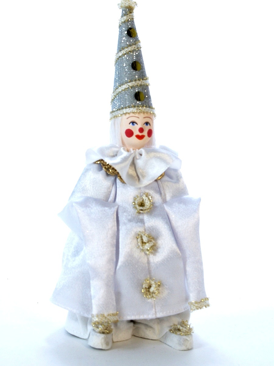 Кукла Потешного промысла ручной работы Пьеро, статичная статуэтка.. Материал фарфор, текстиль. Высота 20 см. Артикул 0375.