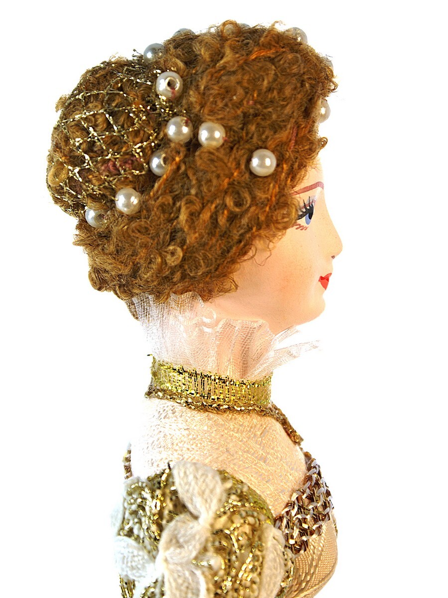 Кукла Потешный Промысёл «Придворная Дама» представляет собой прекрасную копию придворной дамы двора королевы Елизаветы 16 века в Англии. Она выполнена из фарфора и текстиля.