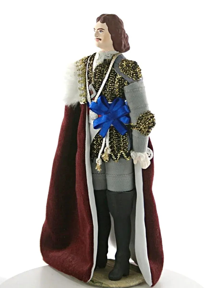 Кукла интерьерная ручной работы из коллекции «Исторический костюм» — Пётр I в парадном облачении, XVIII век. Материал фарфор, текстиль. Высота 25 см. Артикул 0903. Конструкция: статуэтка.
