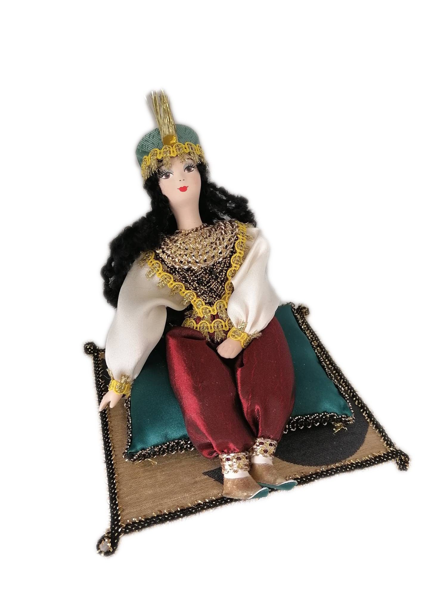 Кукла сувенирная ручной работы Шахерезада, героиня сказочного цикла "Тысяча и одна ночь" в сидящей позе на ковре, статичная.