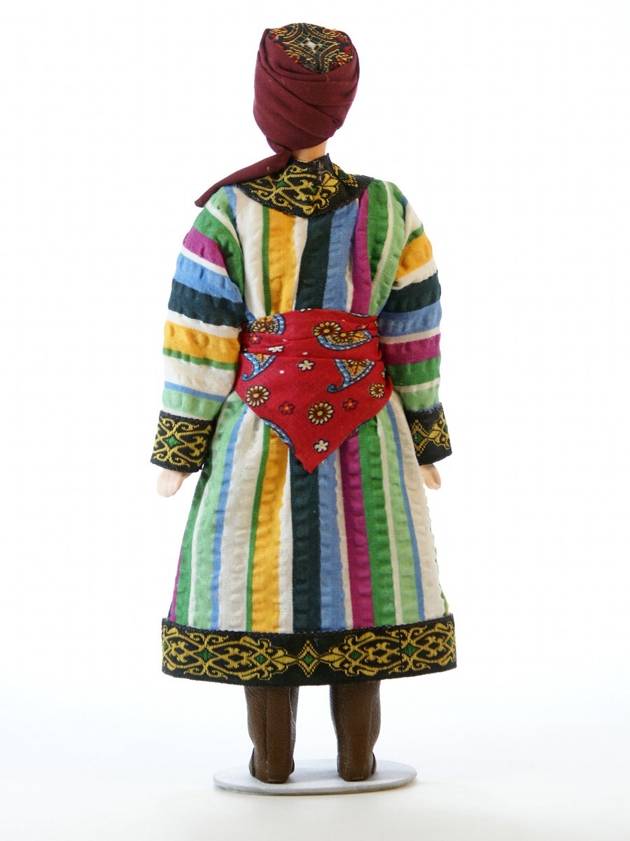 Кукла Потешного промысла Таджик в традиционном свадебном мужском костюме на подставке.
